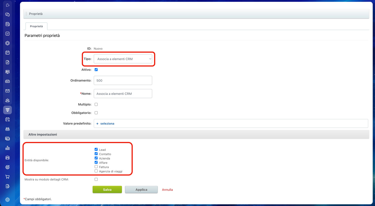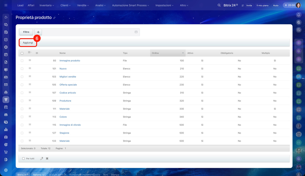 - Per aggiungere una proprietà nelle impostazioni CRM vai in CRM > Altro > Impostazioni > Impostazioni CRM > Proprietà prodotto e fai clic su Aggiungi. Specifica i parametri e salva le modifiche.