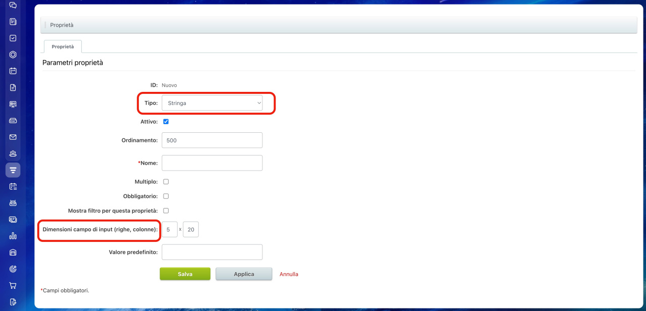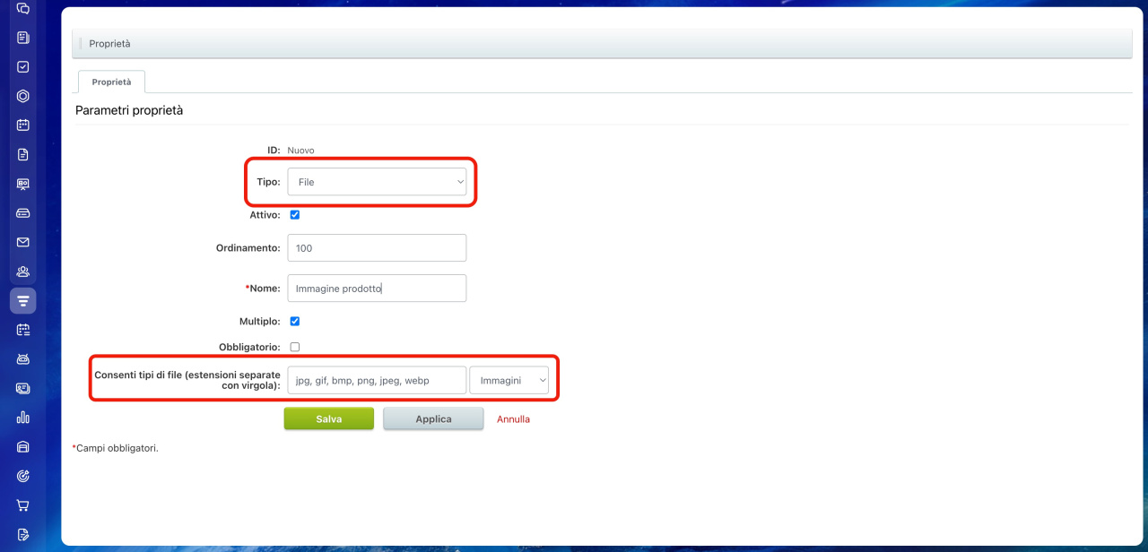 - Obbligatorio: impedisce di salvare la scheda prodotto o servizio finché il campo non viene compilato.