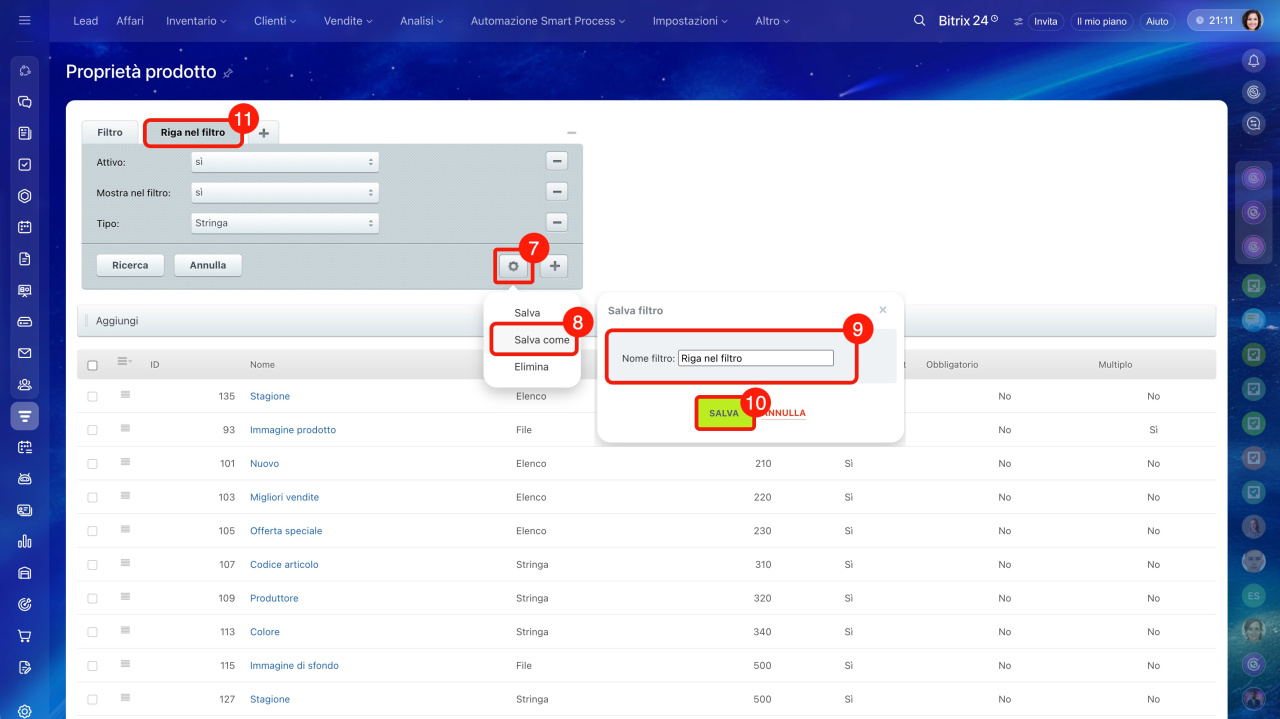 7–10. Per salvare il filtro fai clic su Impostazioni (⚙️) > Salva come, specifica il nome e fai clic su Salva.
