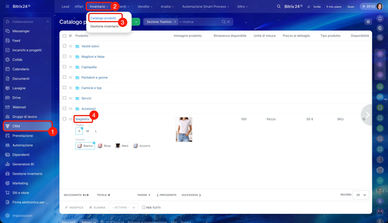 1–3. Vai in CRM > Inventario > Catalogo prodotti.