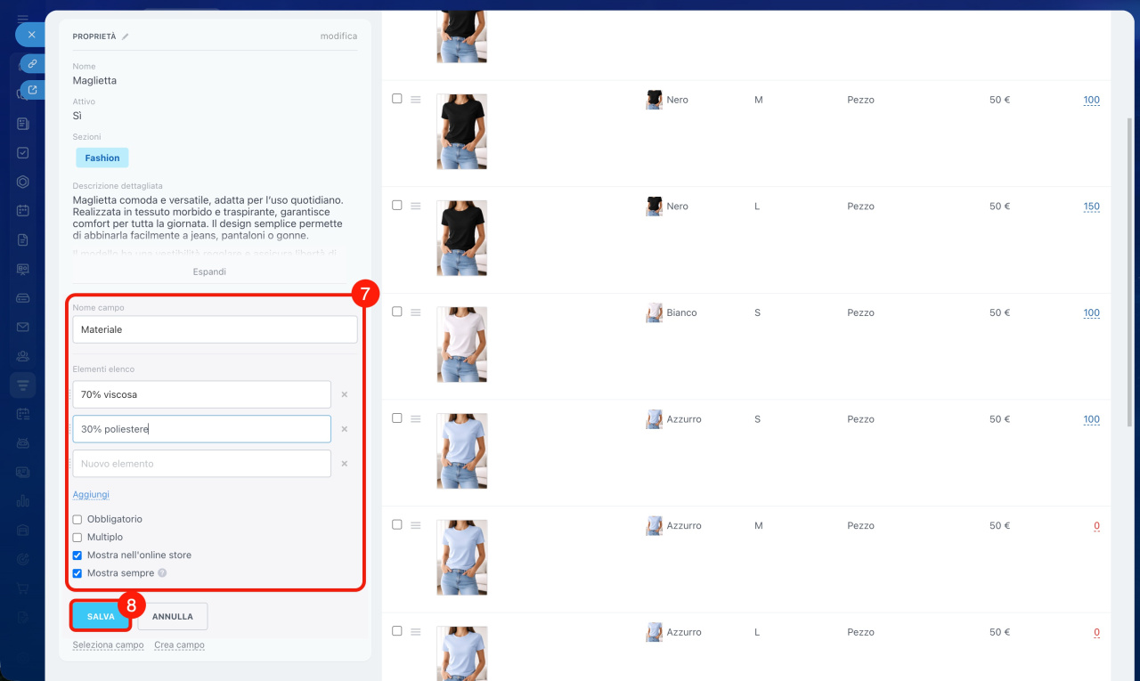 Elenco. Nel campo Valori elenco aggiungi le opzioni che l’utente potrà selezionare nella scheda prodotto. Ad esempio, indicare i colori disponibili delle magliette o la durata del massaggio.