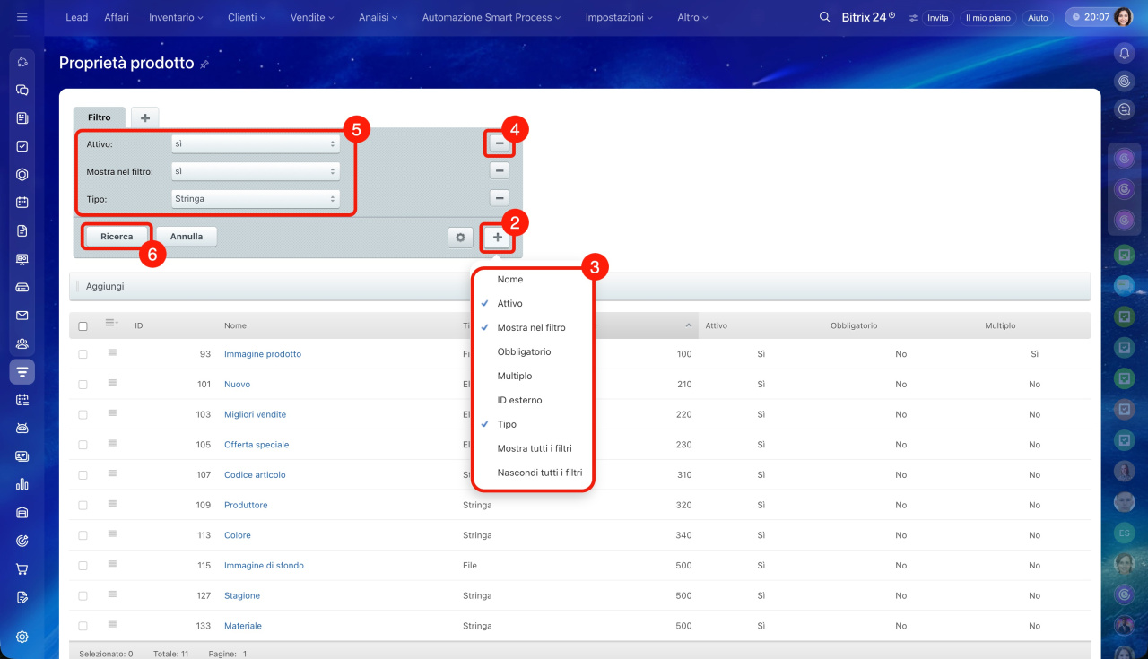 Nella scheda prodotto è possibile configurare meno parametri della proprietà rispetto alle impostazioni CRM. Questo metodo è utile se devi aggiungere rapidamente una nuova proprietà nella scheda prodotto e renderla disponibile nel filtro dell’online store.