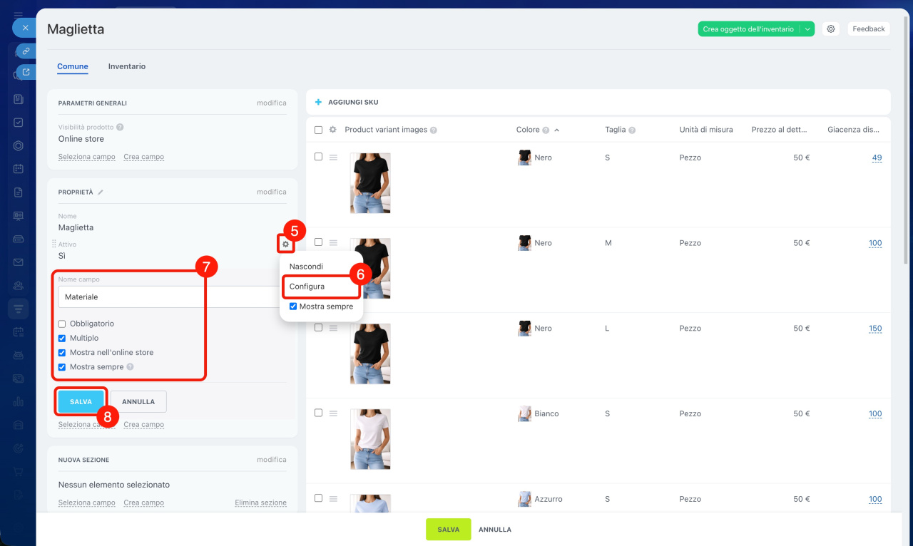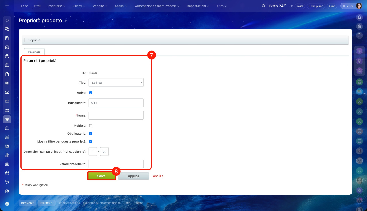 8. Salva le modifiche. La proprietà verrà aggiunta nella scheda prodotto o servizio e nell’elenco generale delle proprietà.