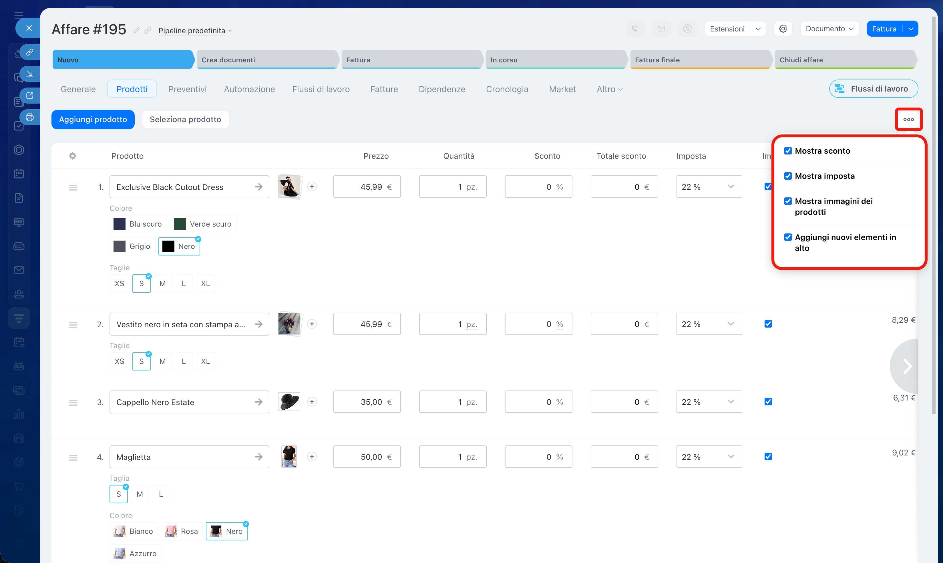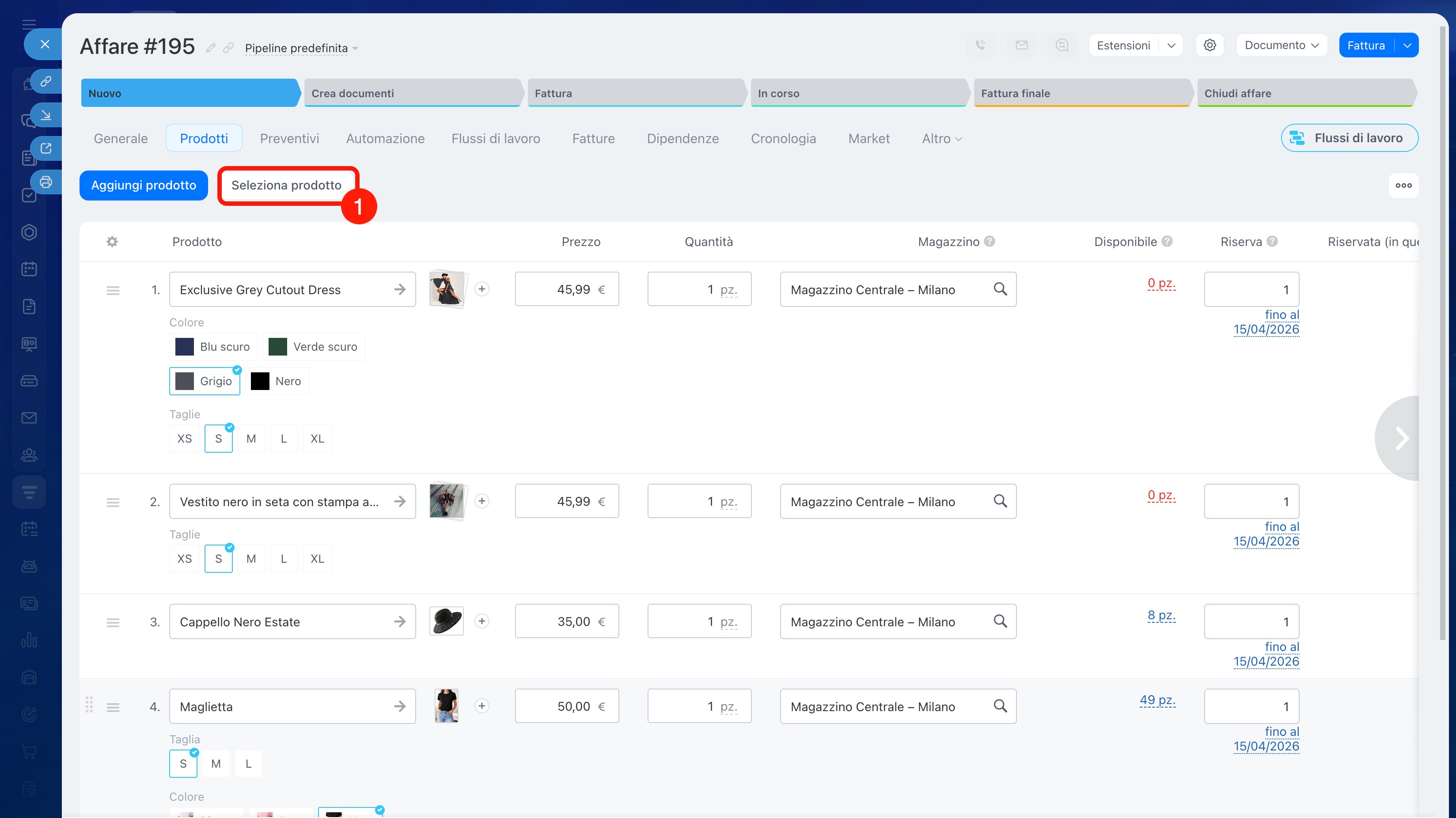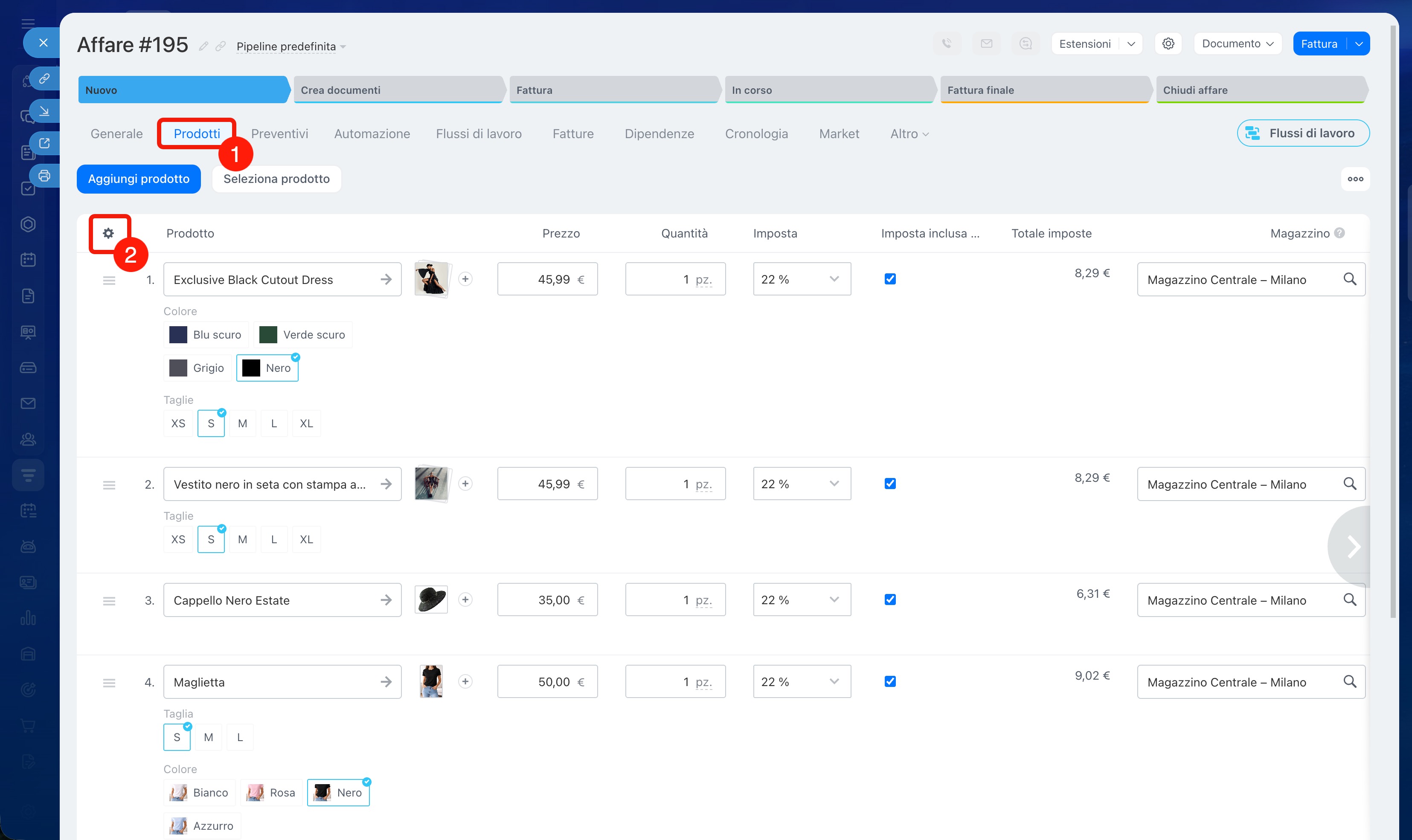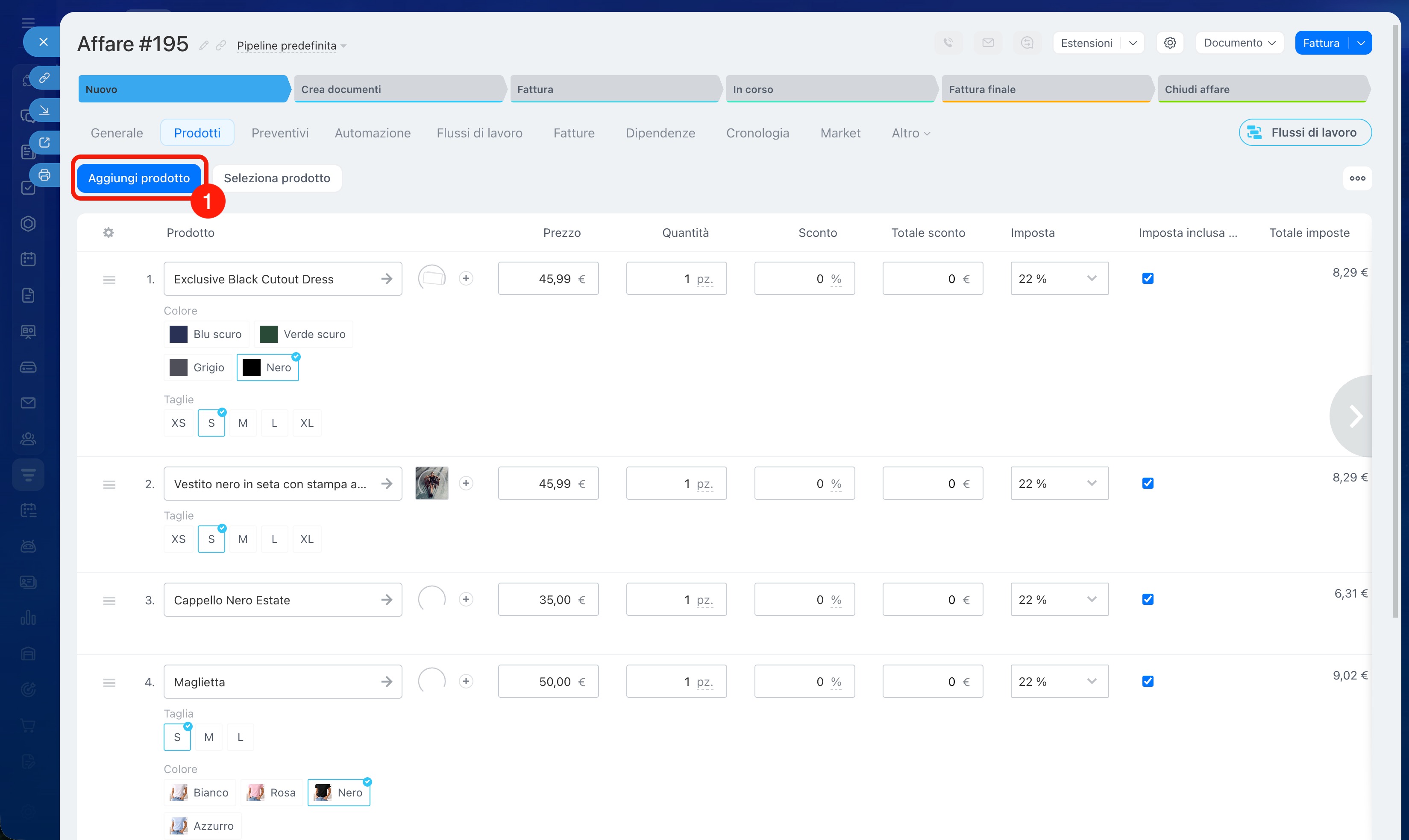 Vai alla sezione CRM > Affari e seleziona l'affare necessario. Apri la scheda Prodotti.