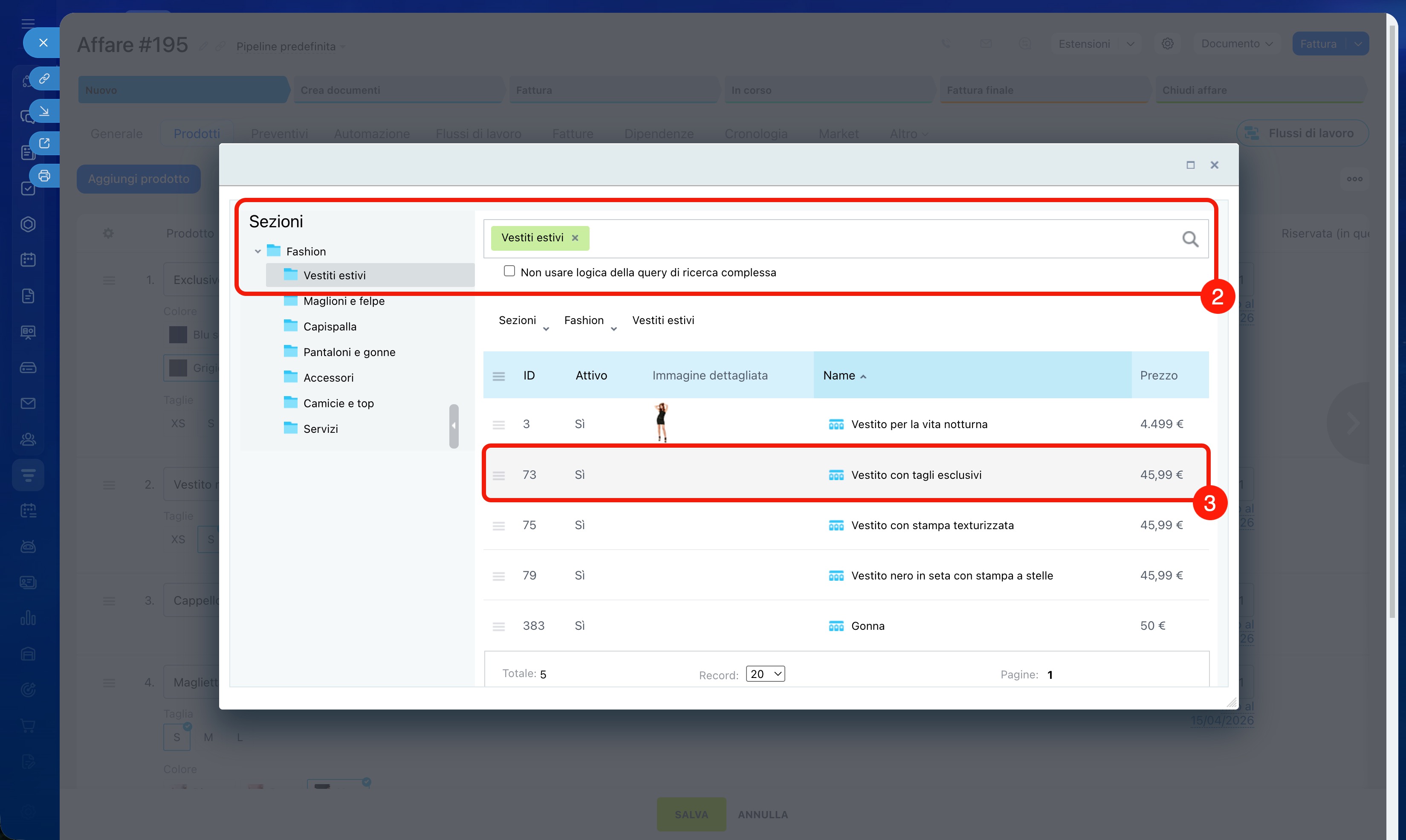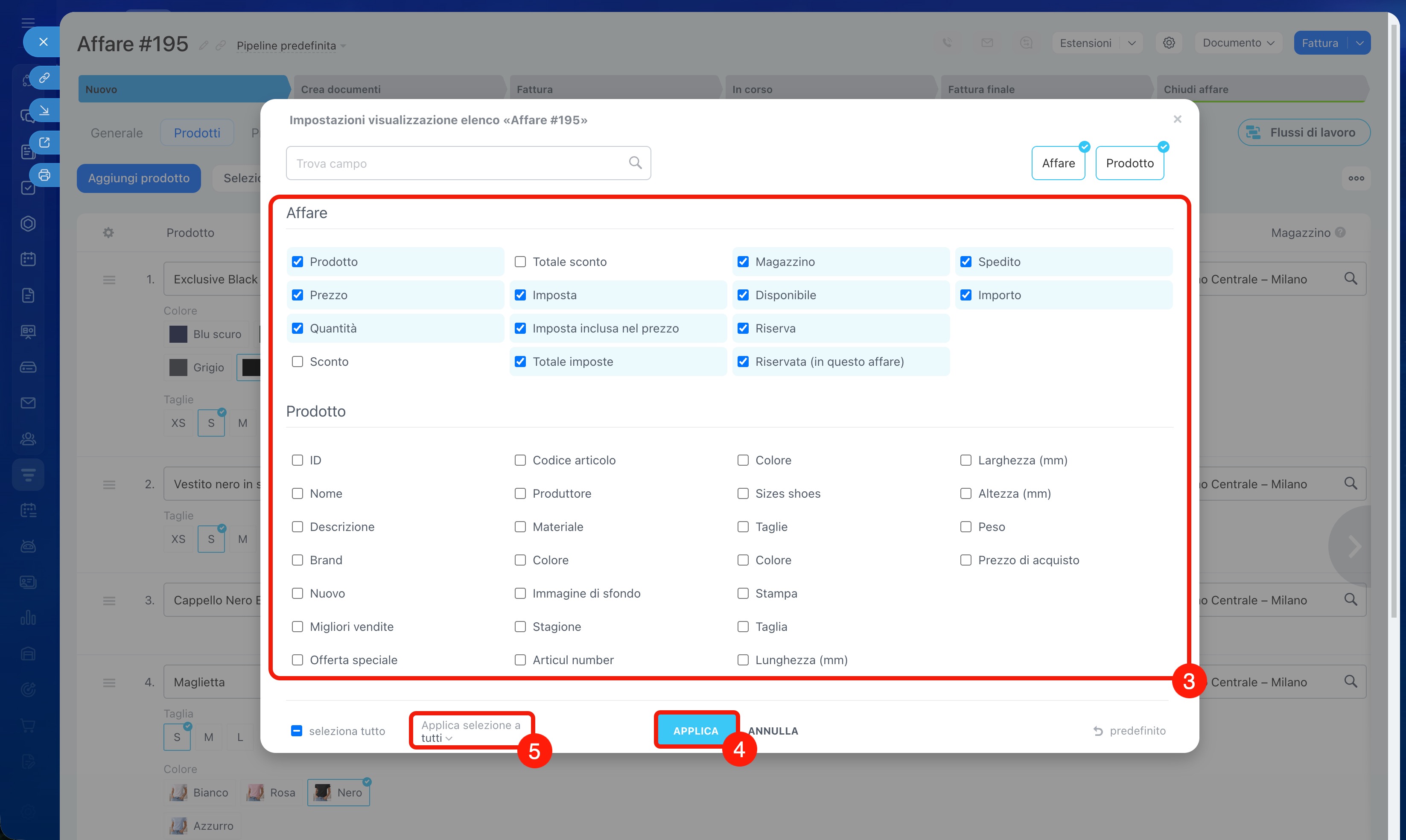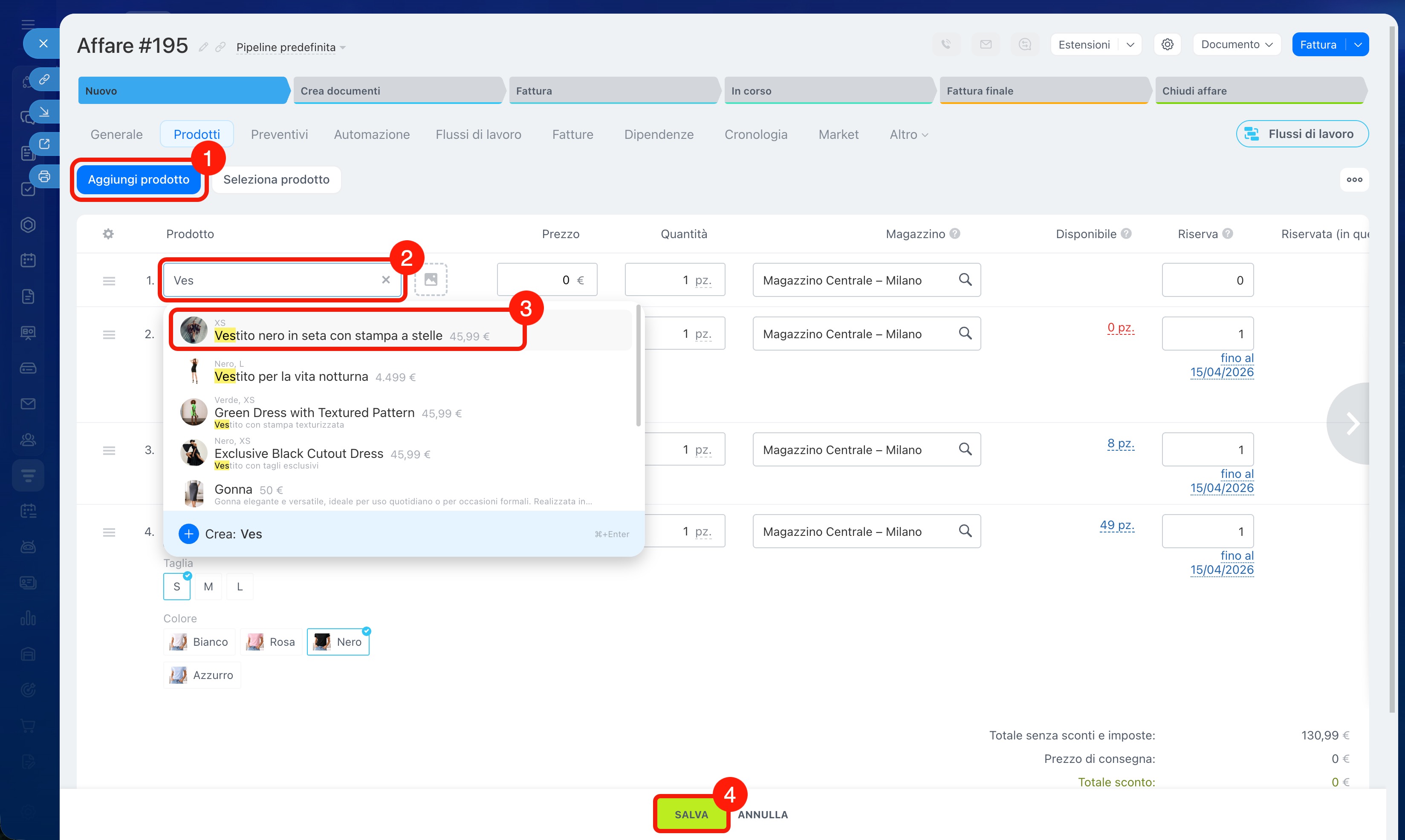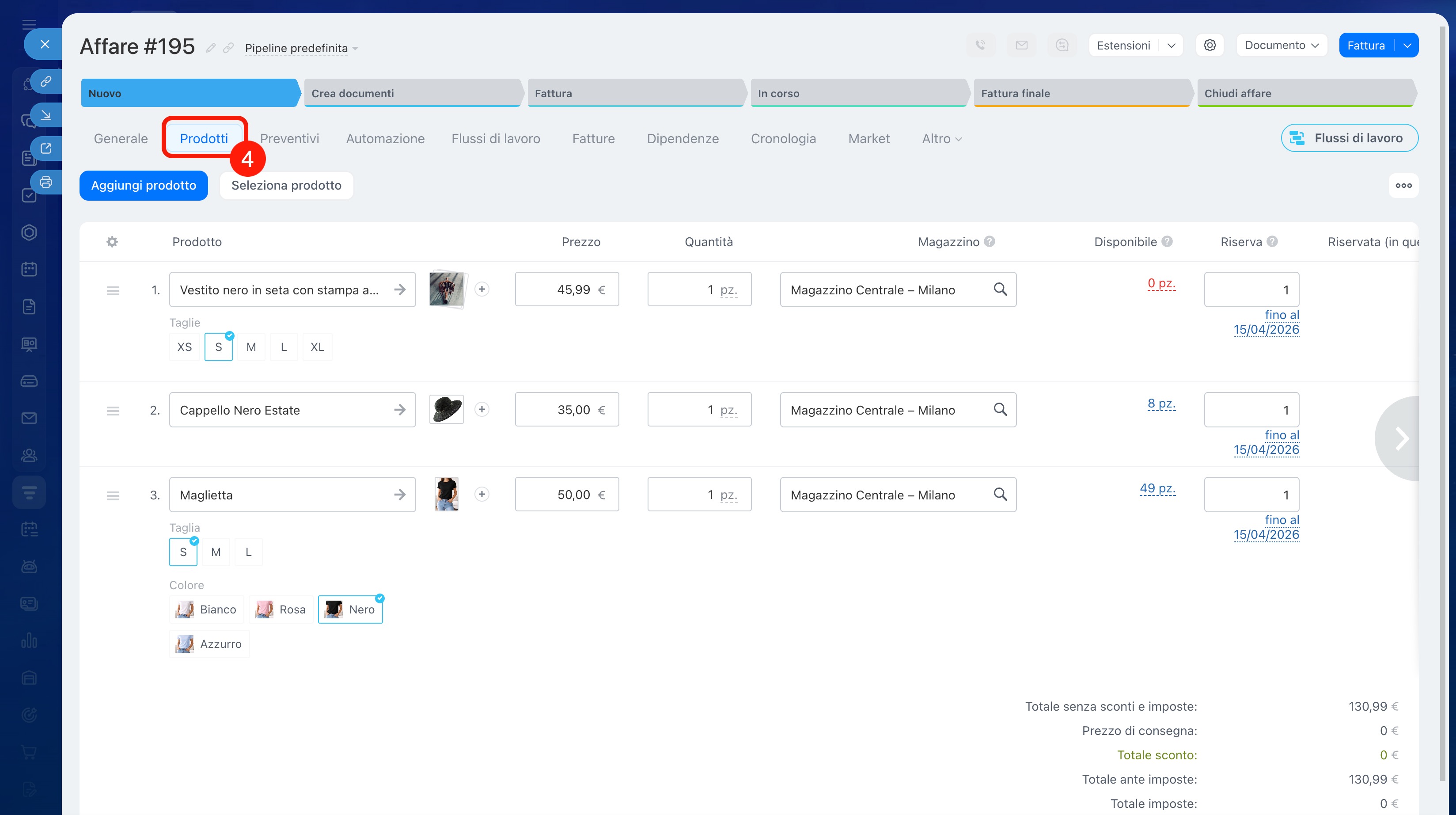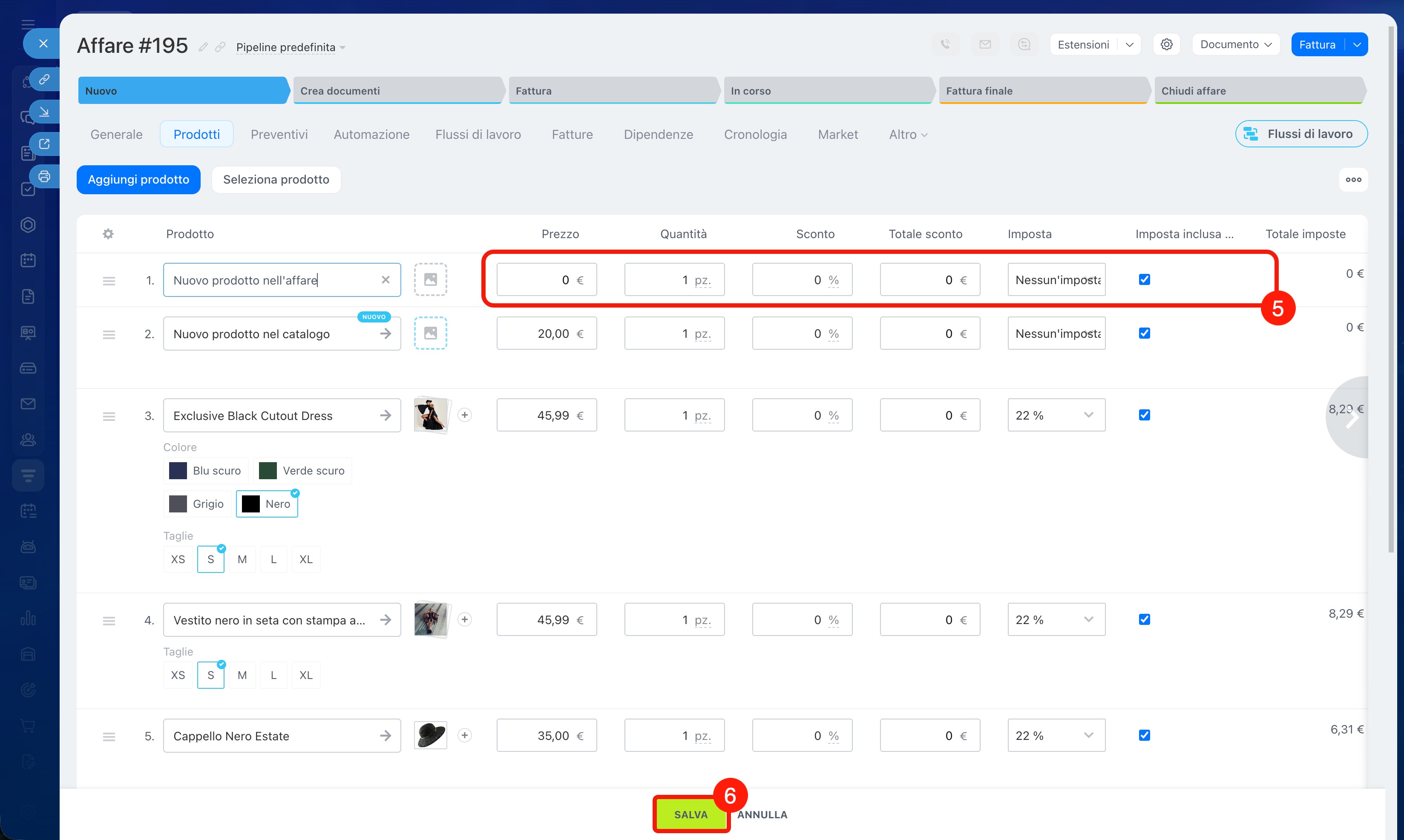 Vai alla sezione CRM > Affari e seleziona l'affare necessario. Apri la scheda Prodotti.