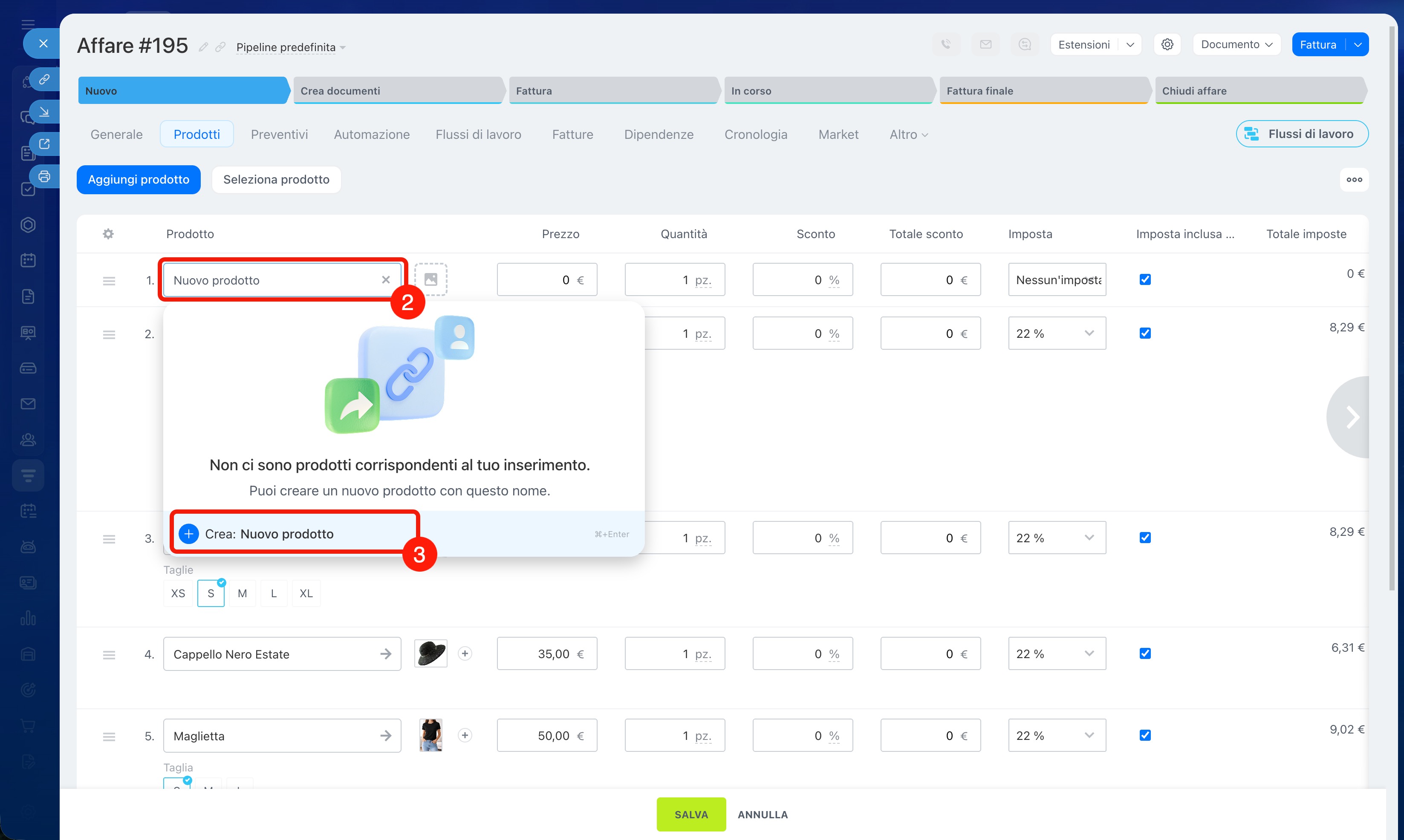 Creare un nuovo prodotto. Se il prodotto necessario non è presente, puoi crearlo direttamente dalla scheda CRM.