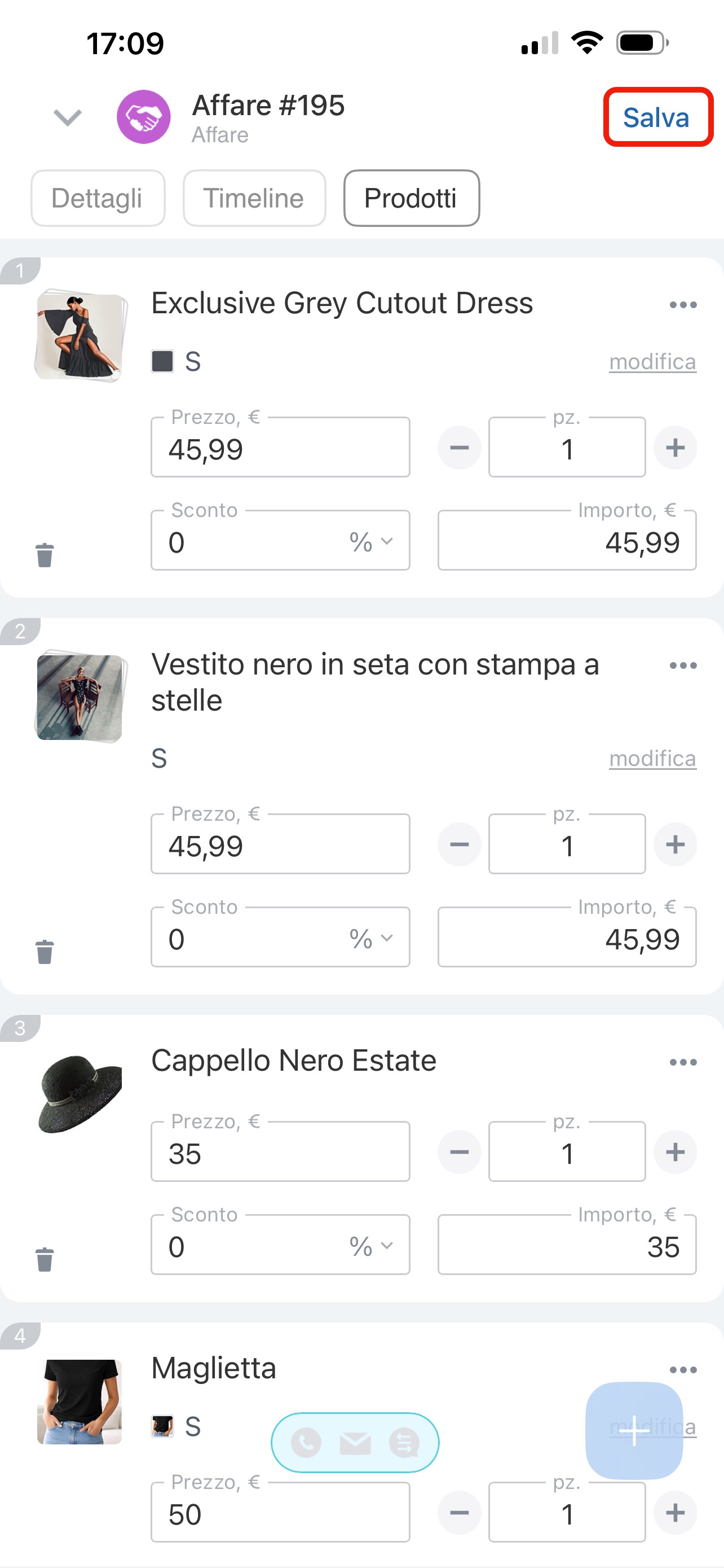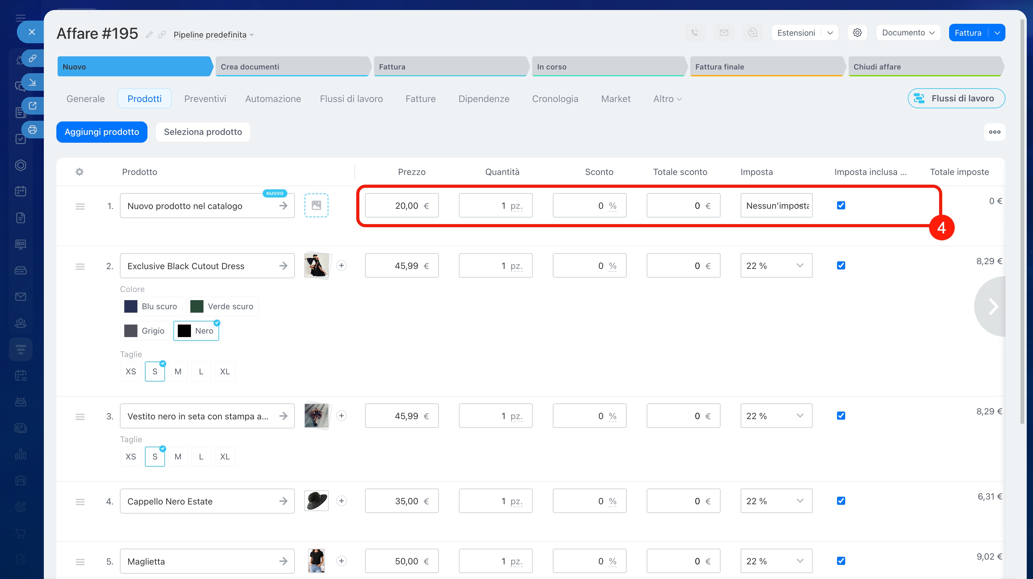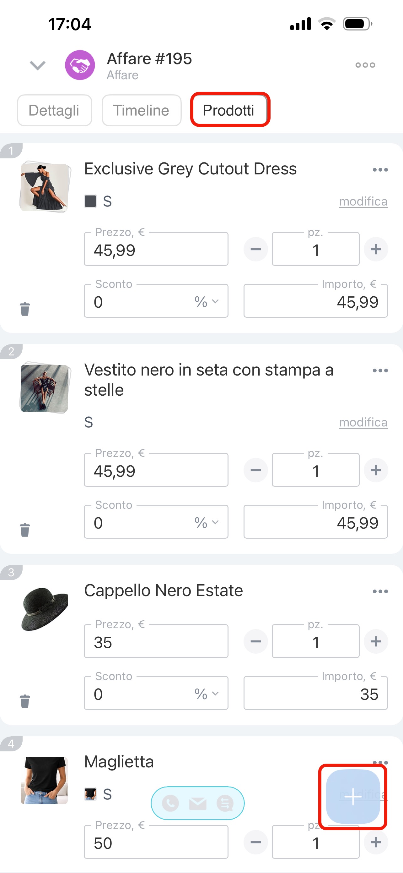 - I prodotti nella scheda CRM aiutano a fissare cosa stai vendendo al cliente e a calcolare automaticamente l'importo finale.