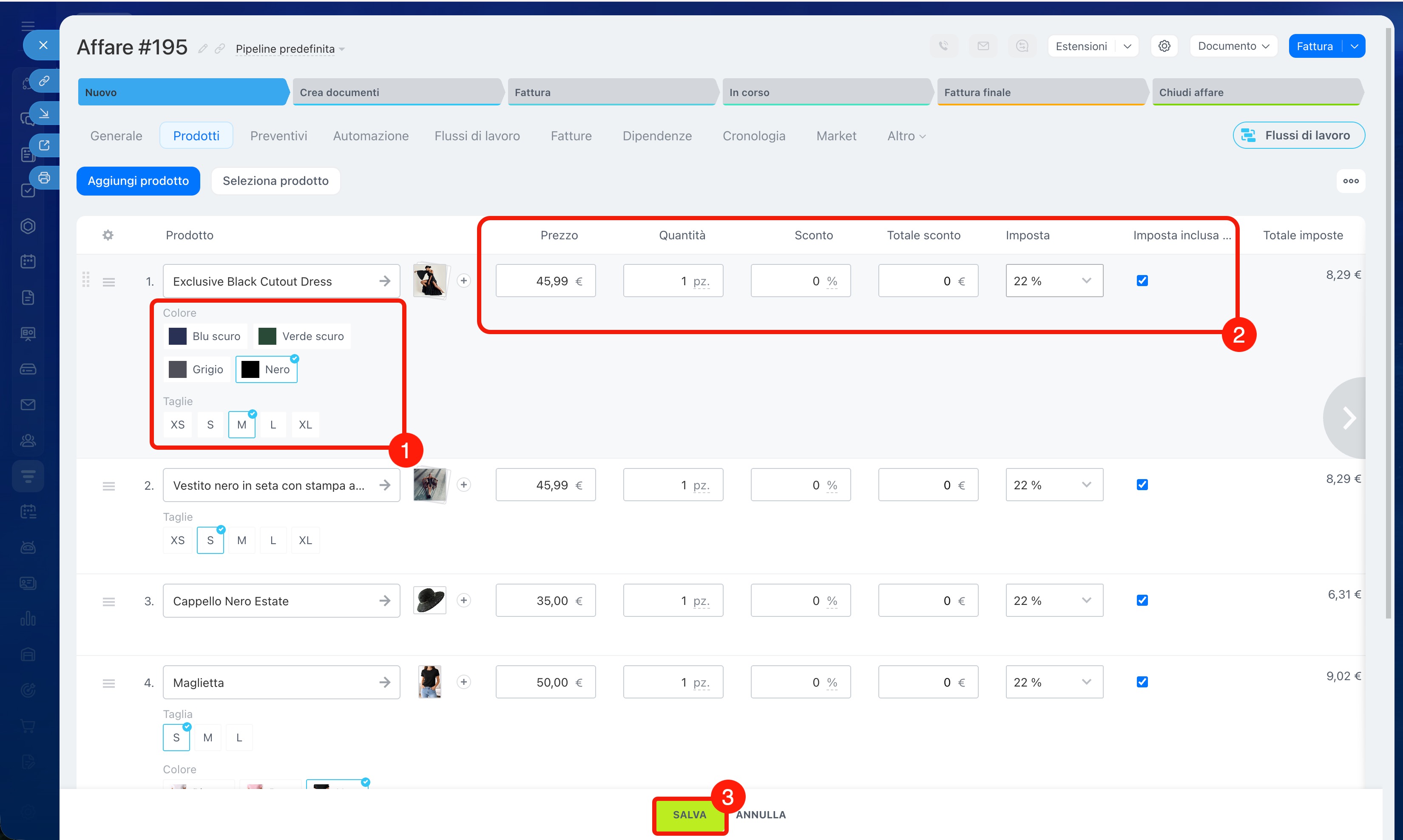- Dopo aver aggiunto il prodotto, indica lo SKU, la quantità, gli sconti e le imposte. L'importo verrà ricalcolato automaticamente. Se il calcolo automatico è attivo, l'importo dell'affare sarà uguale all'importo dei prodotti.