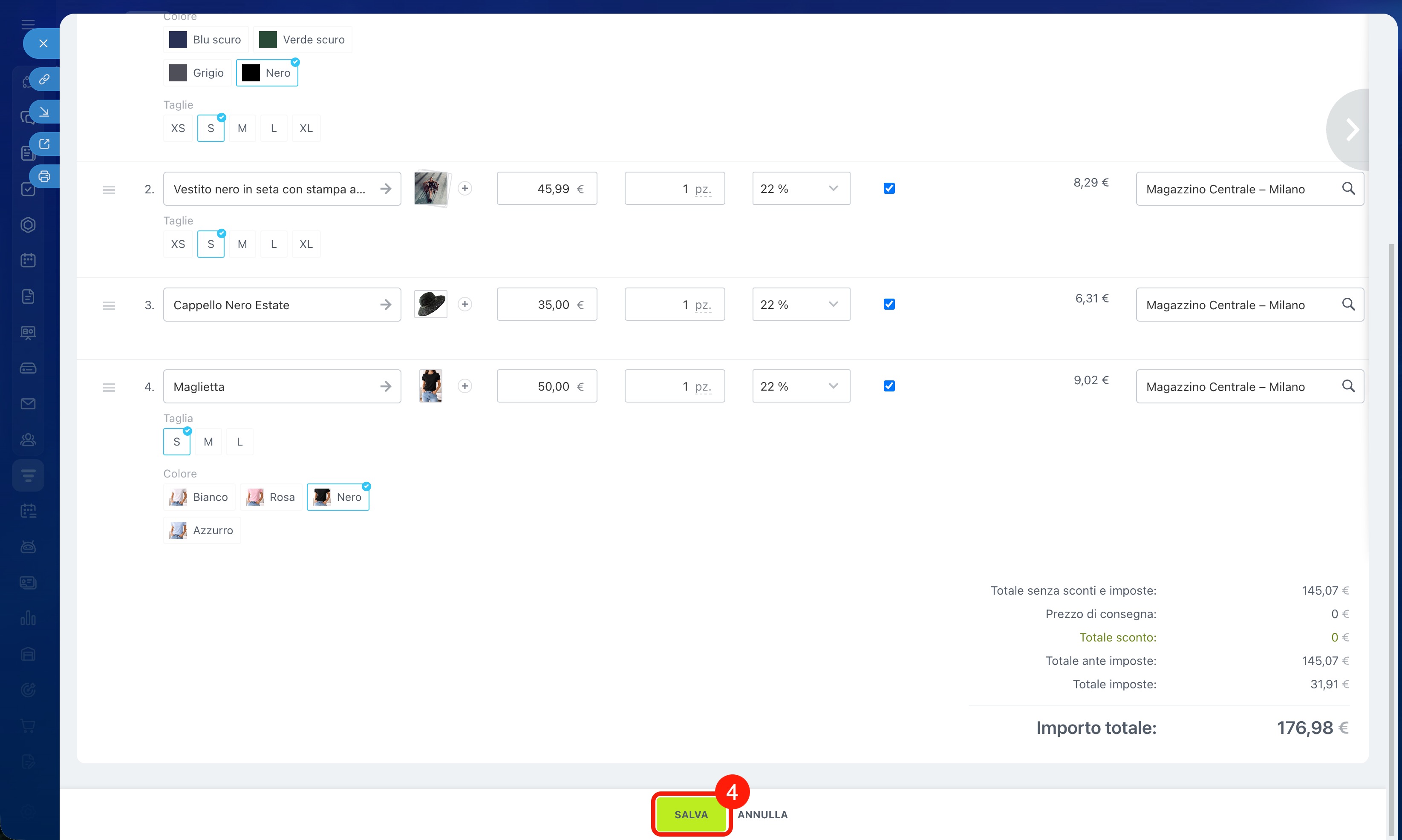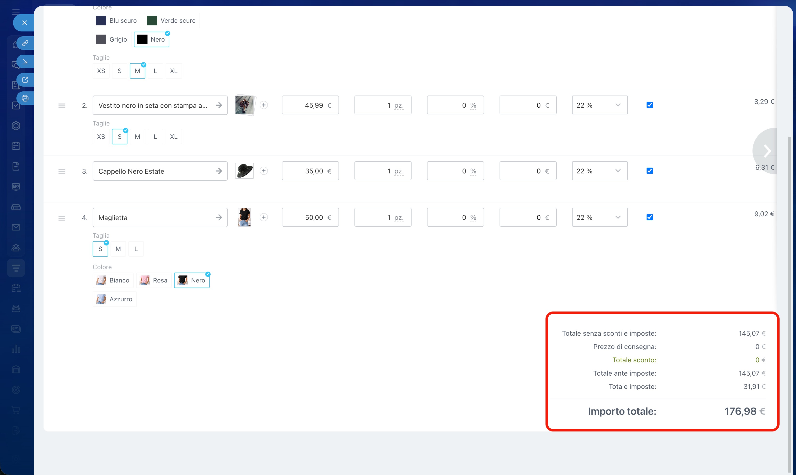 Il CRM ricalcola automaticamente l’importo tenendo conto di quantità, sconti e imposte, senza calcoli manuali. Ad esempio, se devi applicare al cliente uno sconto personalizzato, basta indicalo nella scheda e il totale cambierà automaticamente.