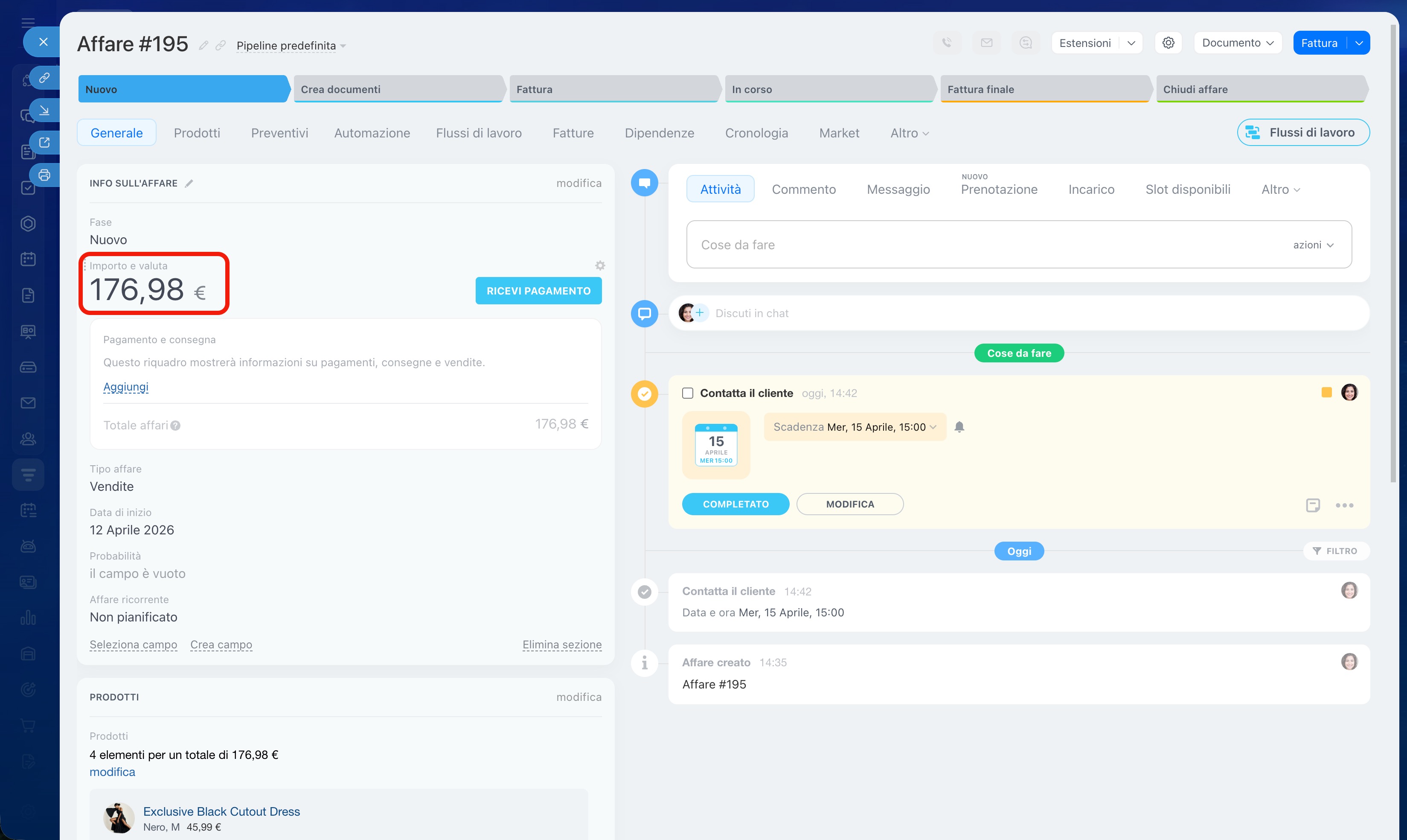 I prodotti nella scheda CRM aiutano a fissare cosa stai vendendo al cliente e a calcolare automaticamente l’importo finale.