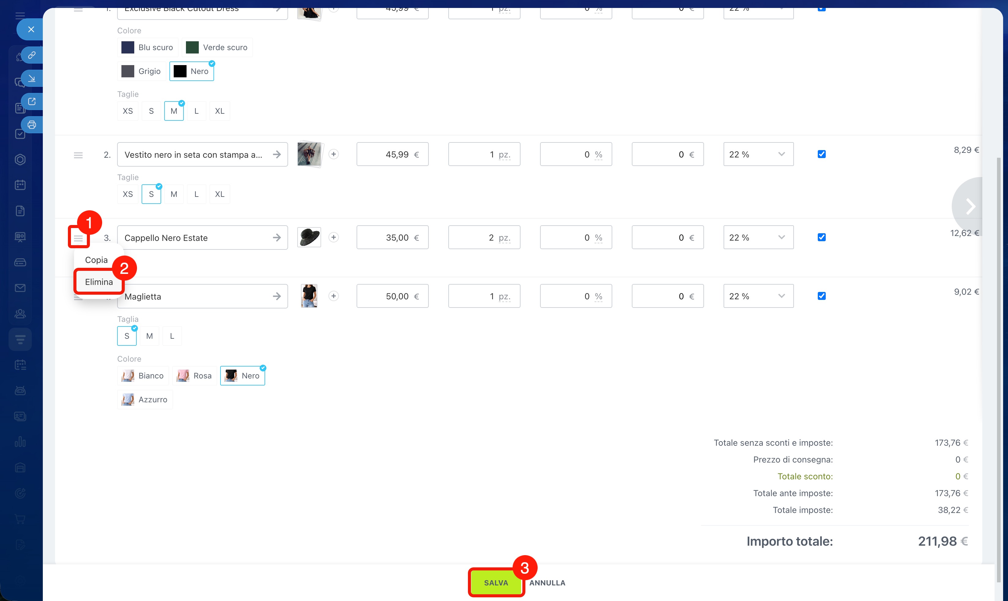 A destra del prodotto necessario fai clic su Tre punti (...) > Rimuovi da elenco. Fai clic su Salva.