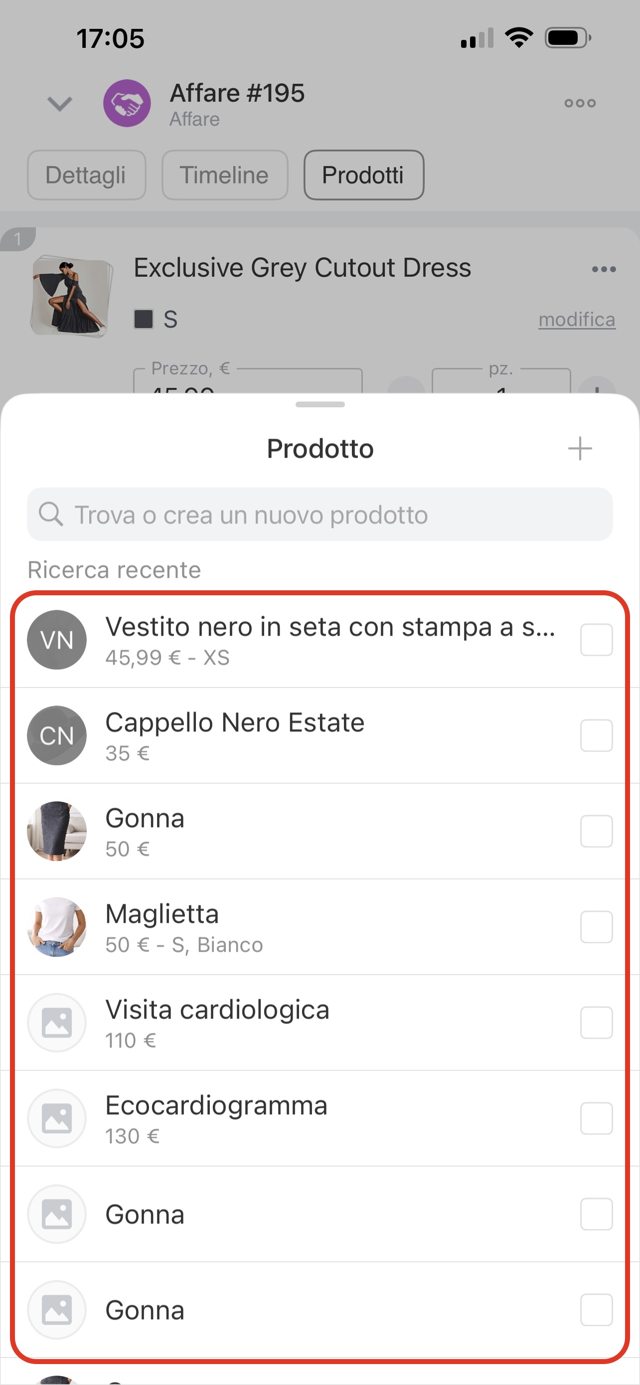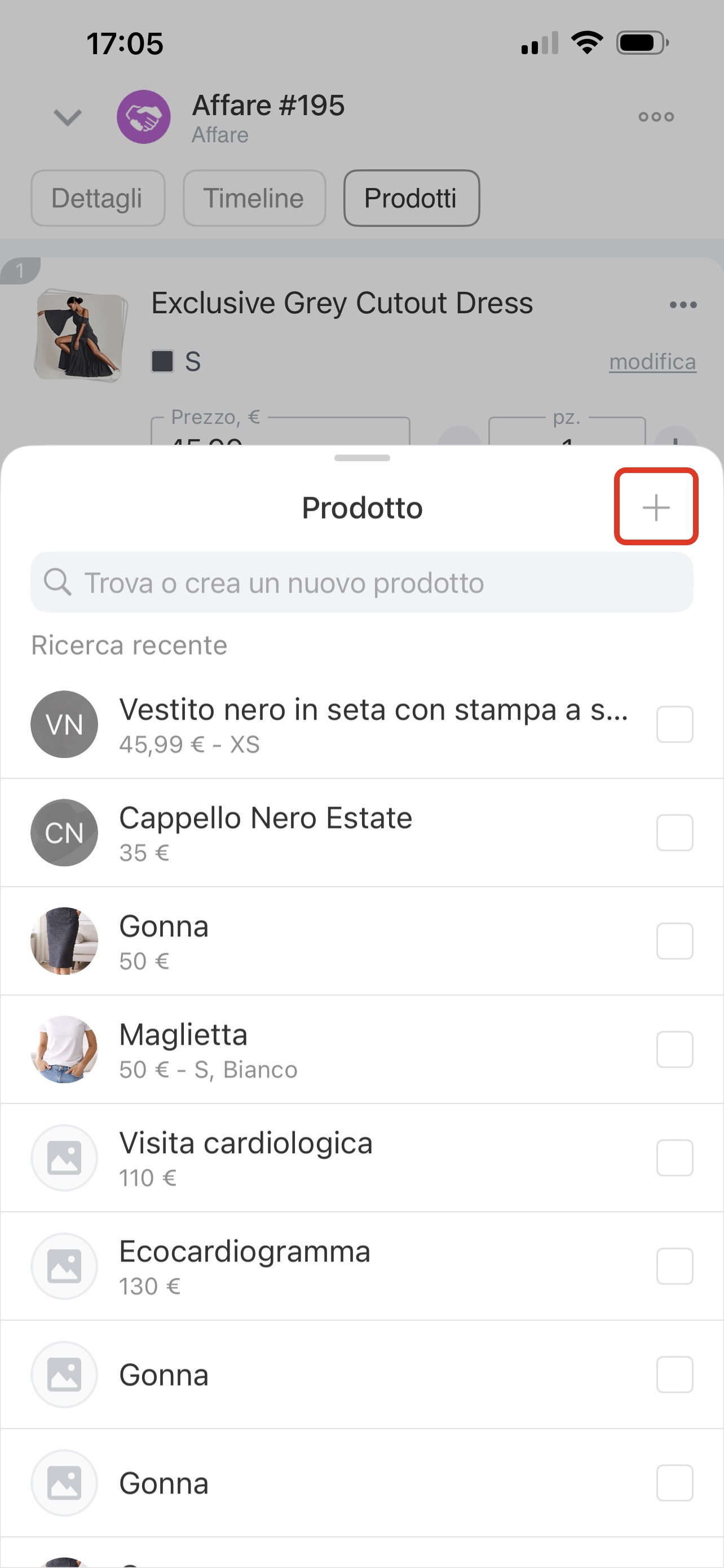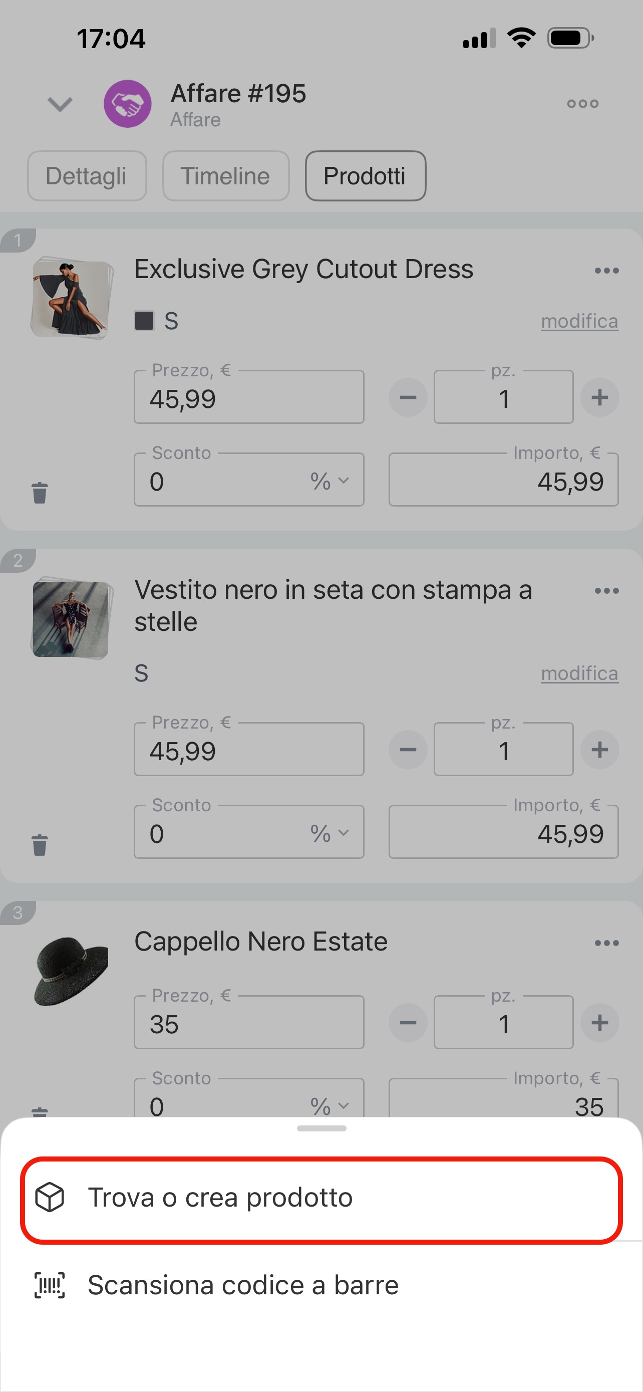 Creare un nuovo prodotto. Se il prodotto necessario non è presente, puoi crearlo direttamente nell'affare. Nell'app mobile i nuovi prodotti vengono sempre salvati nel catalogo.