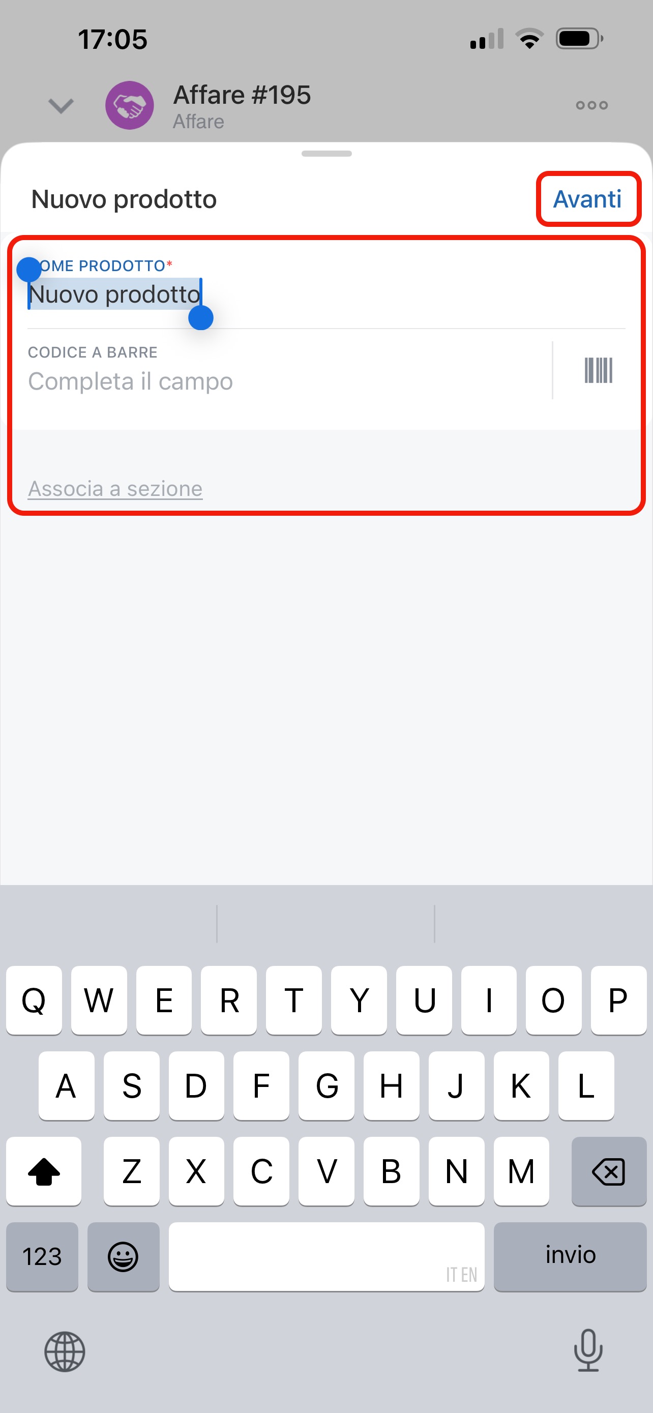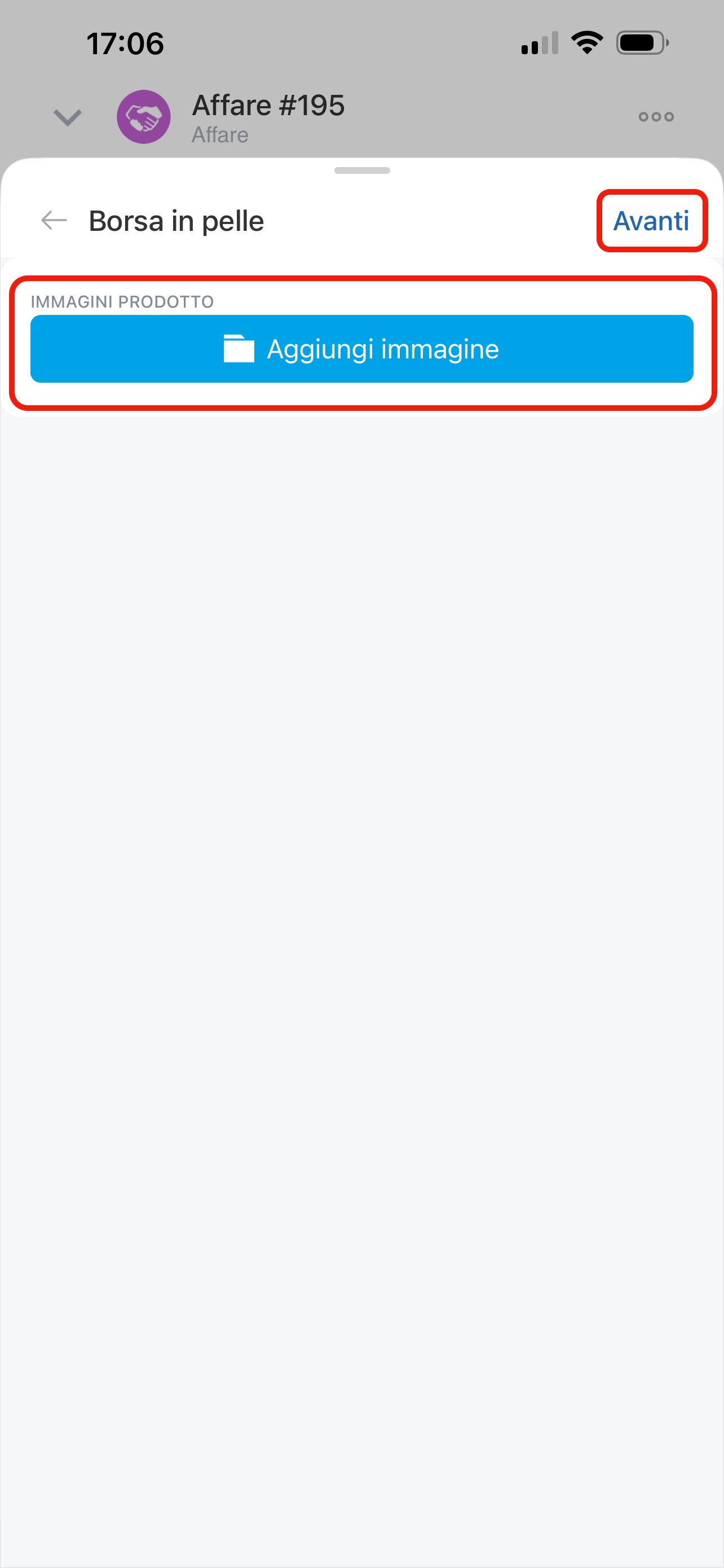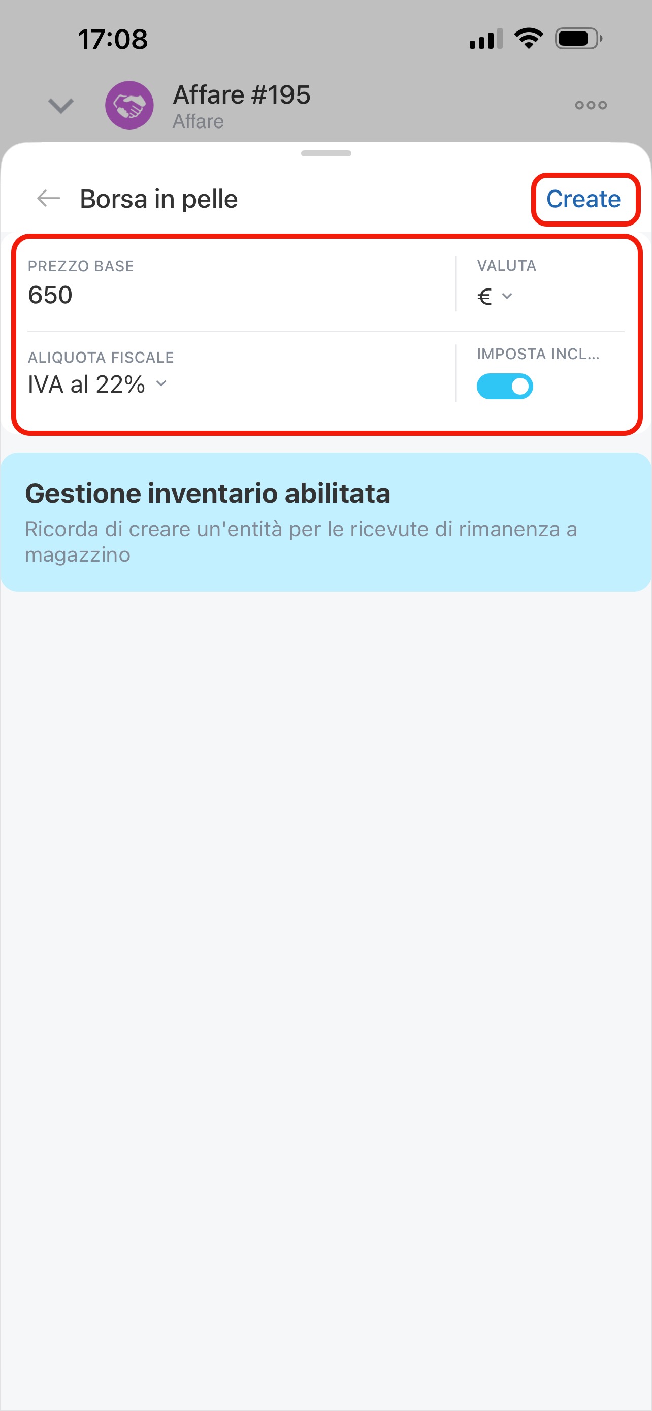 Creare un nuovo prodotto. Se il prodotto necessario non è presente, puoi crearlo direttamente nell'affare. Nell'app mobile i nuovi prodotti vengono sempre salvati nel catalogo.
