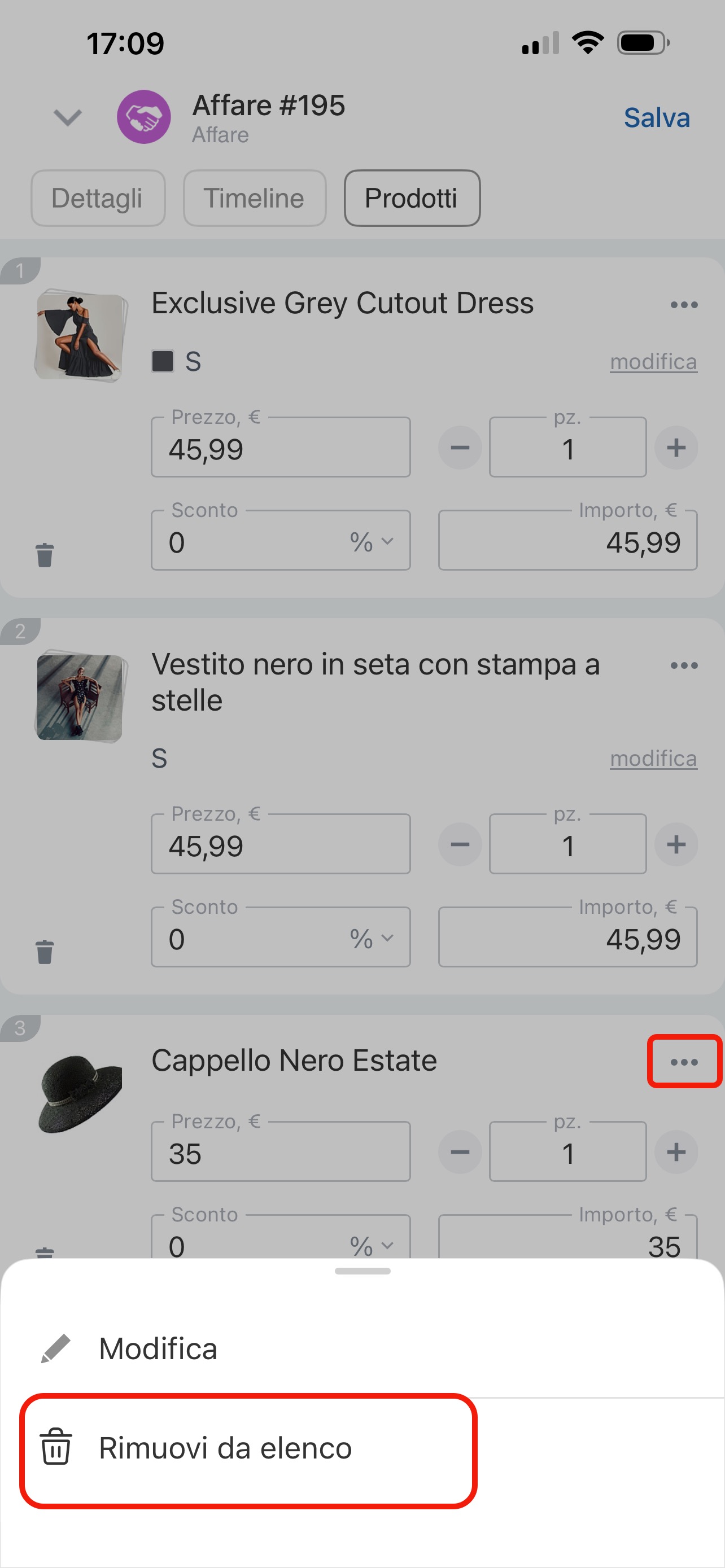 Eliminare un prodotto. Se il prodotto è stato aggiunto per errore o se le condizioni dell'affare sono cambiate, puoi eliminarlo dall'elenco.