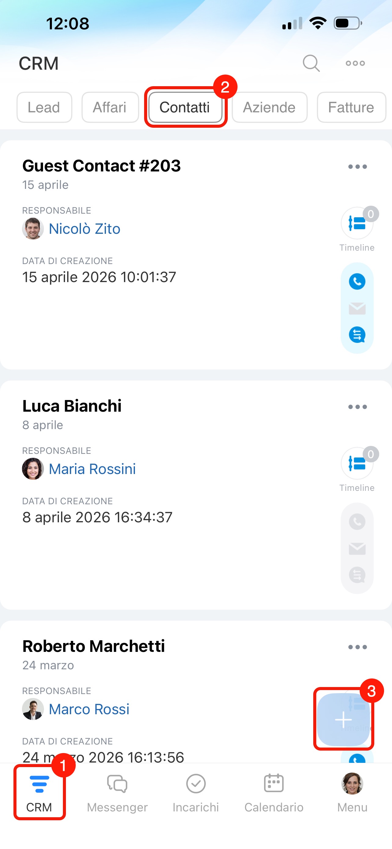 I contatti possono essere creati automaticamente, ad esempio quando un cliente compila un modulo CRM, oppure manualmente. Per aggiungere un nuovo contatto manualmente, vai in CRM > Contatti e fai clic su Più (+).