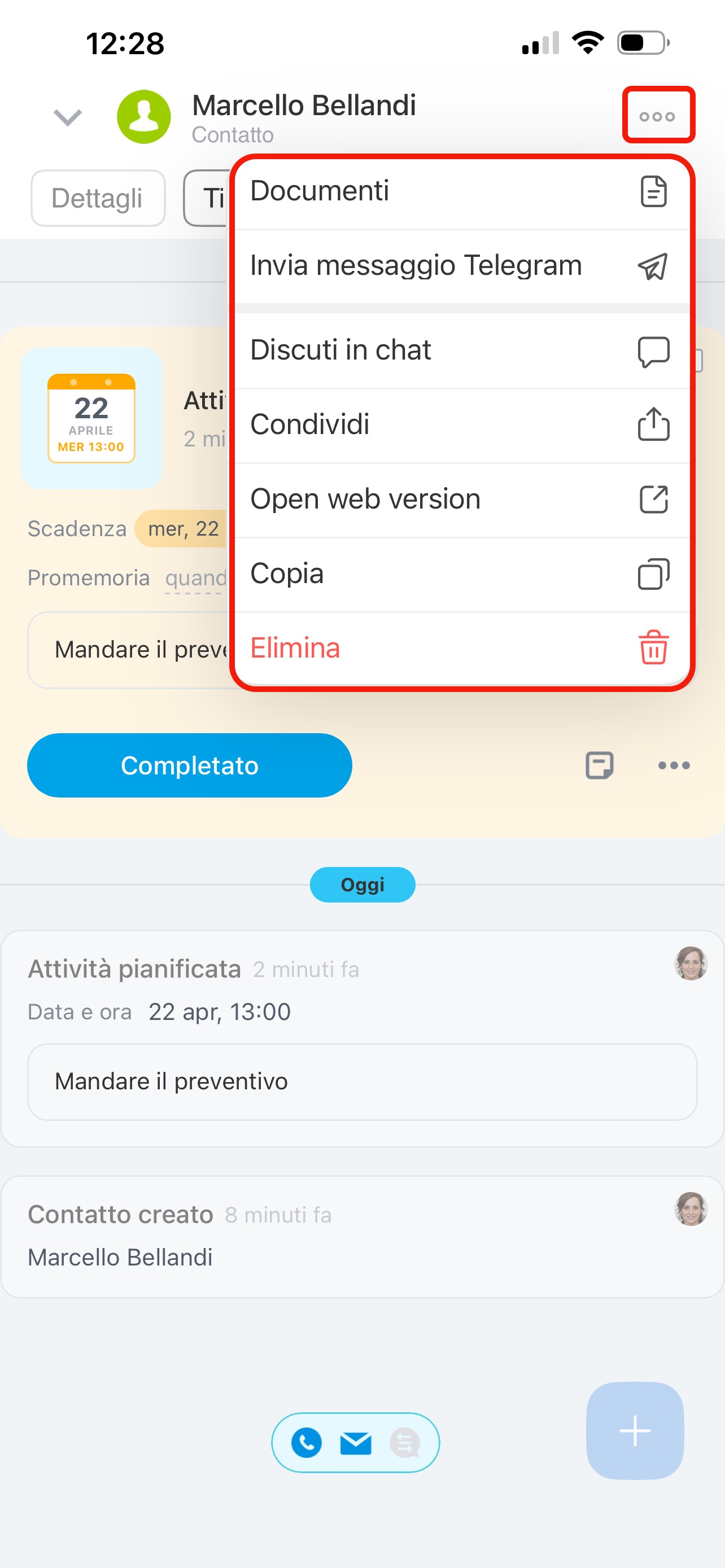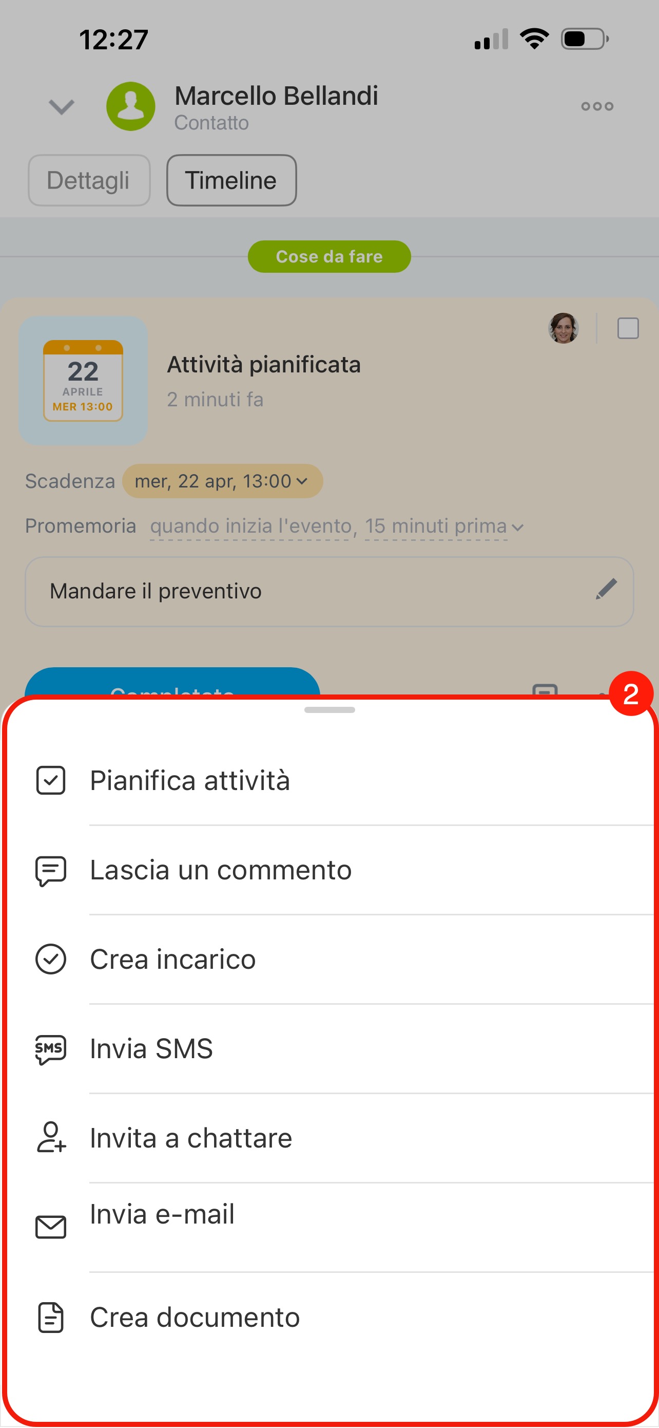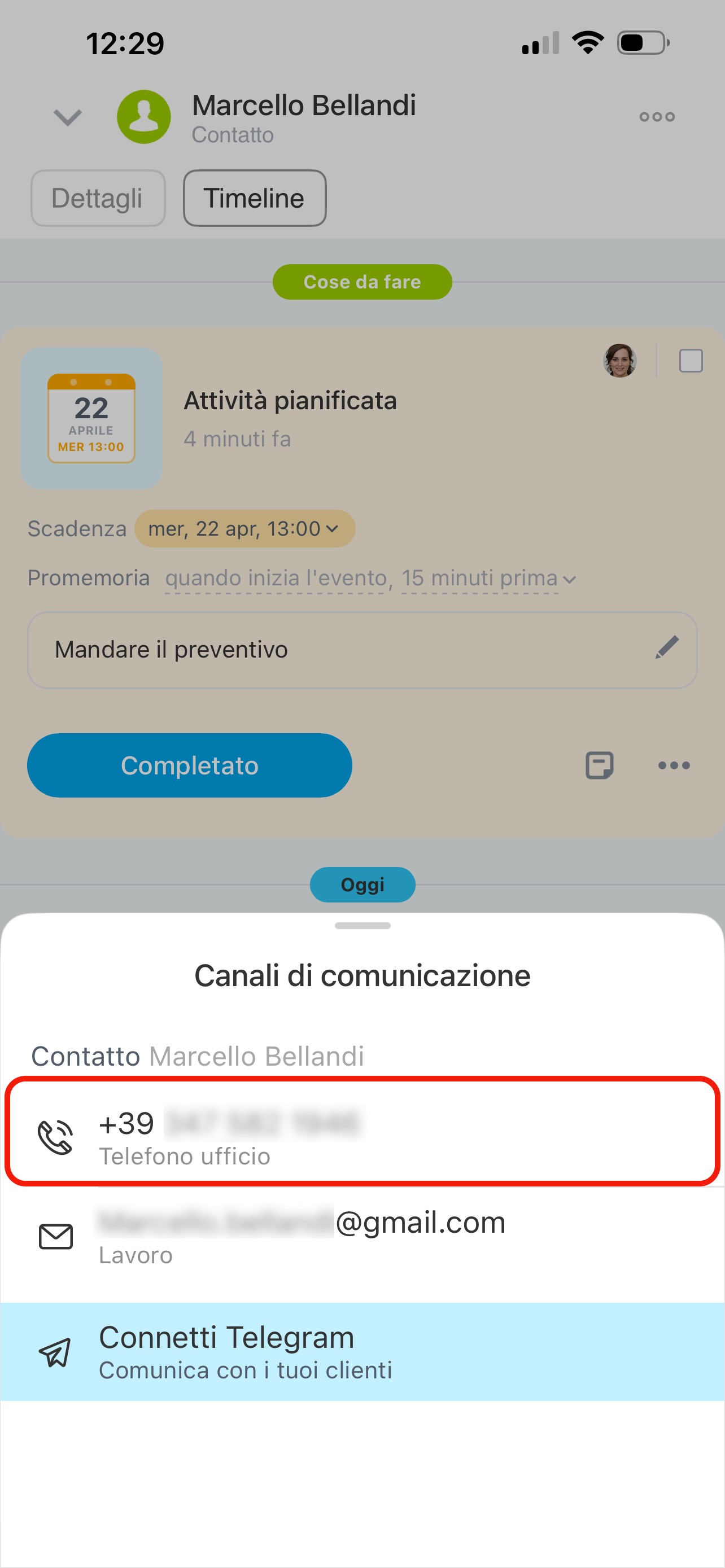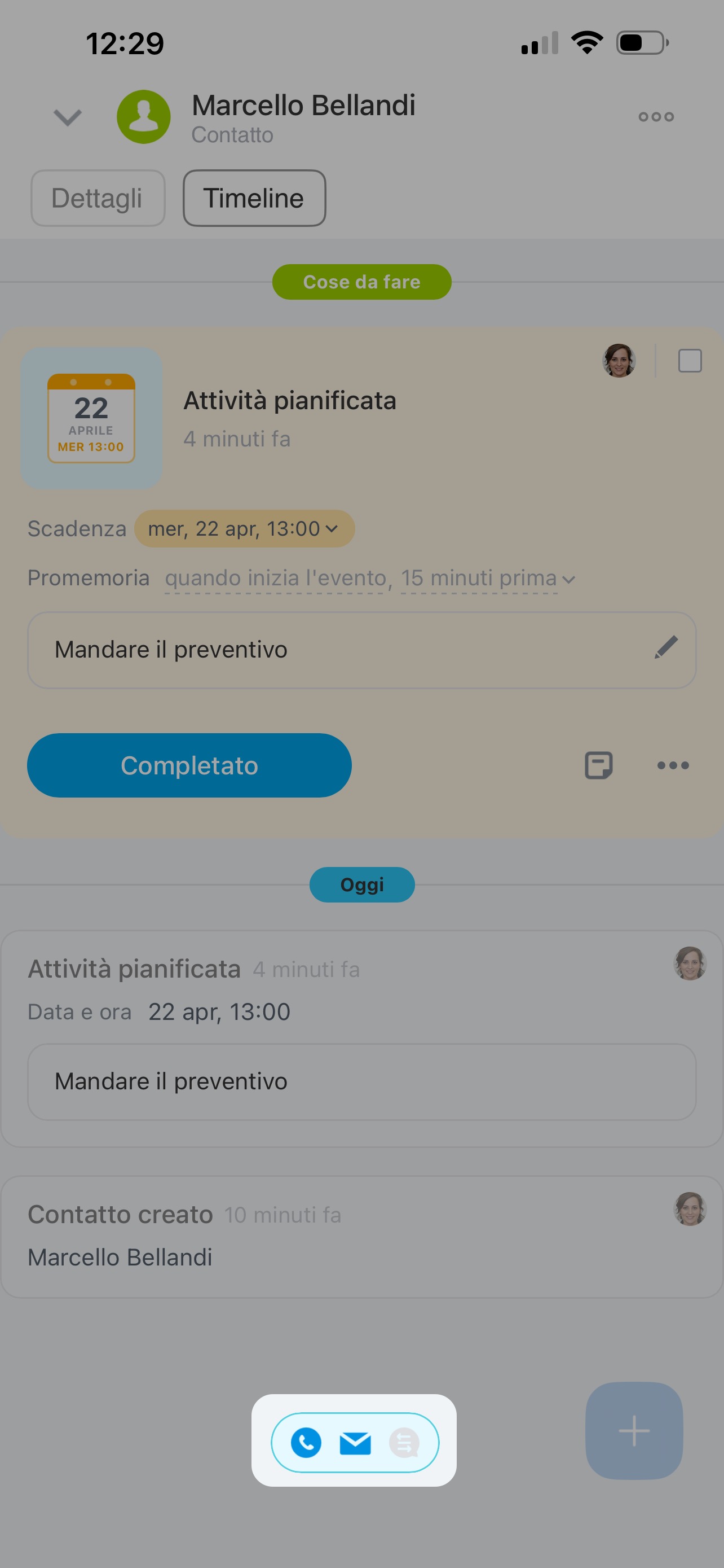 Nel CRM mobile puoi contattare rapidamente una persona, registrare il risultato della comunicazione e pianificare la chiamata o la riunione successiva, anche quando sei fuori ufficio.