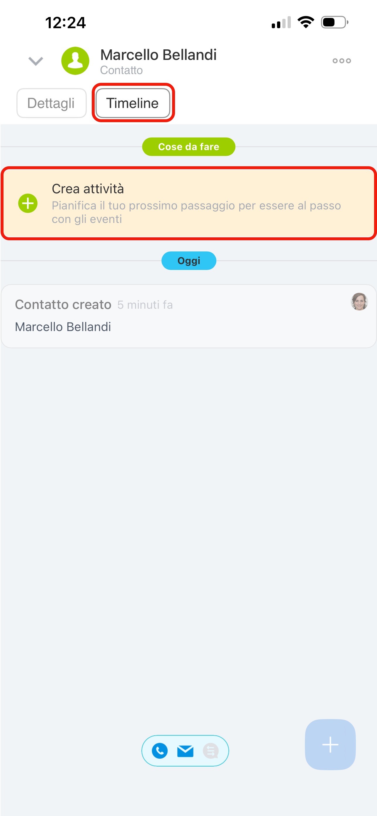 Timeline: qui puoi visualizzare la cronologia delle interazioni con il contatto, lasciare commenti per i colleghi, monitorare lo stato dei flussi di lavoro e altro ancora.