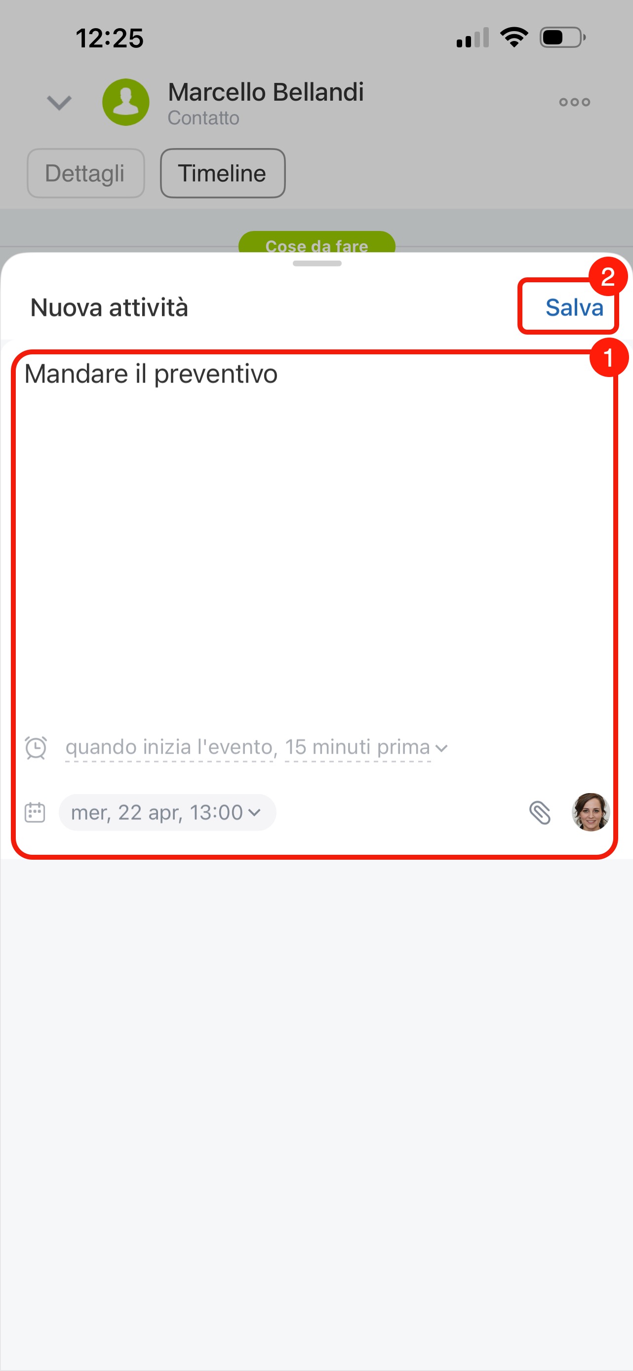 Descrivi cosa deve essere fatto e quando, imposta un promemoria, aggiungi un allegato e indica il responsabile. Salva l’attività.