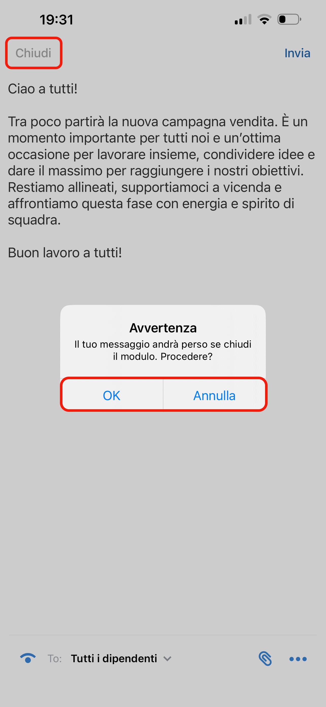Se cambi idea e non vuoi più inviare il messaggio, fai clic su Chiudi nella schermata di modifica prima della pubblicazione. Apparirà un avviso che il messaggio non verrà salvato. Fai clic su: