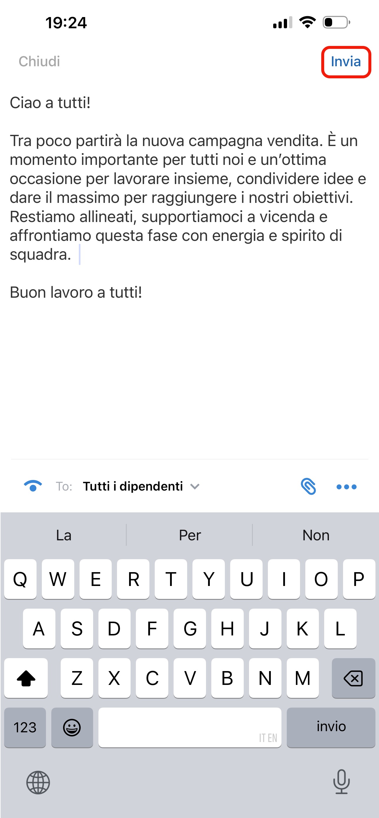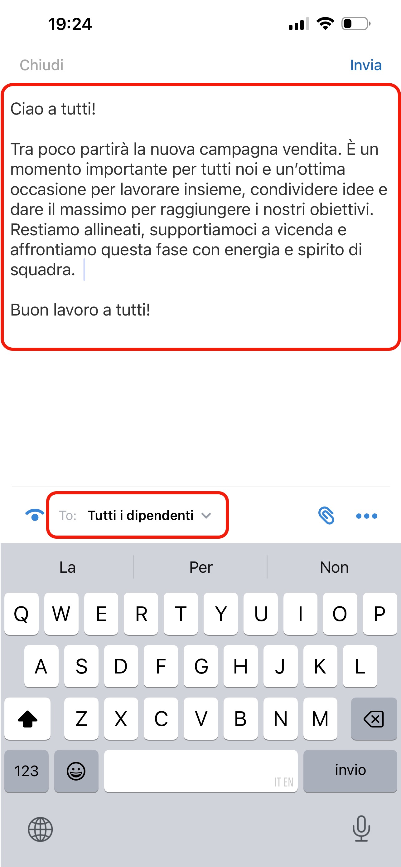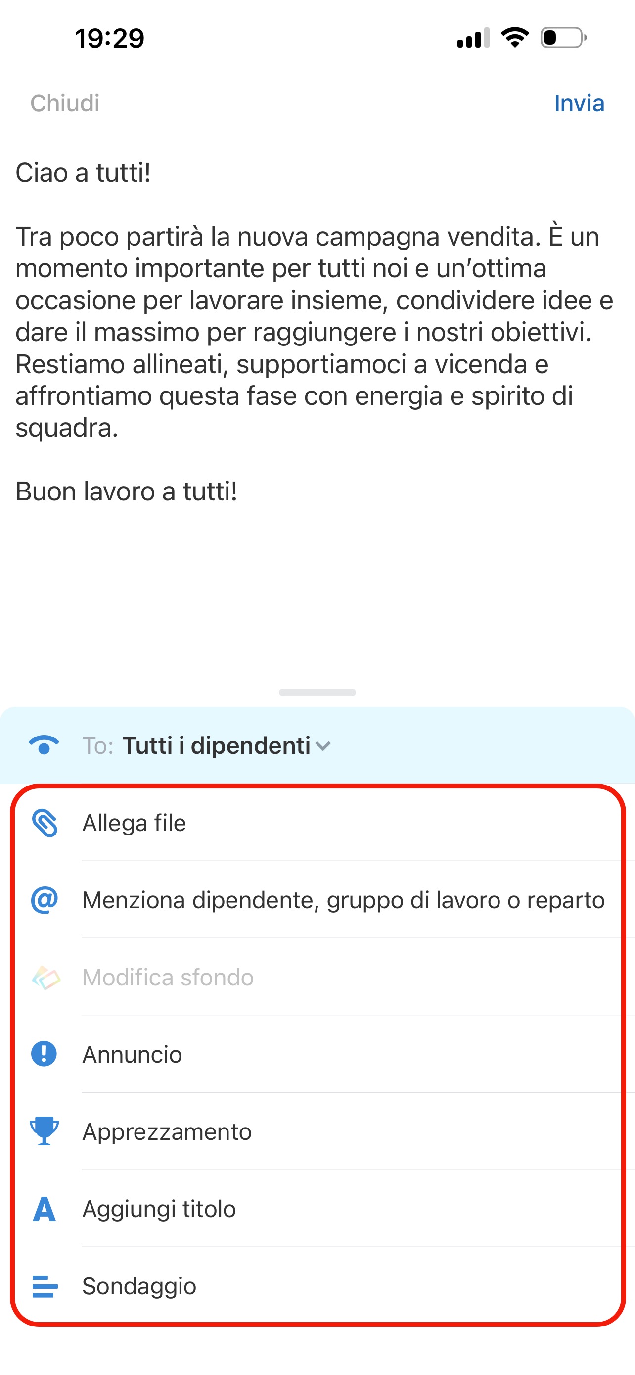Inserisci il testo del messaggio nel campo di input. Per scegliere chi potrà vedere il messaggio, fai clic sul campo To nella parte inferiore dello schermo: per impostazione predefinita è selezionato Tutti i dipendenti.