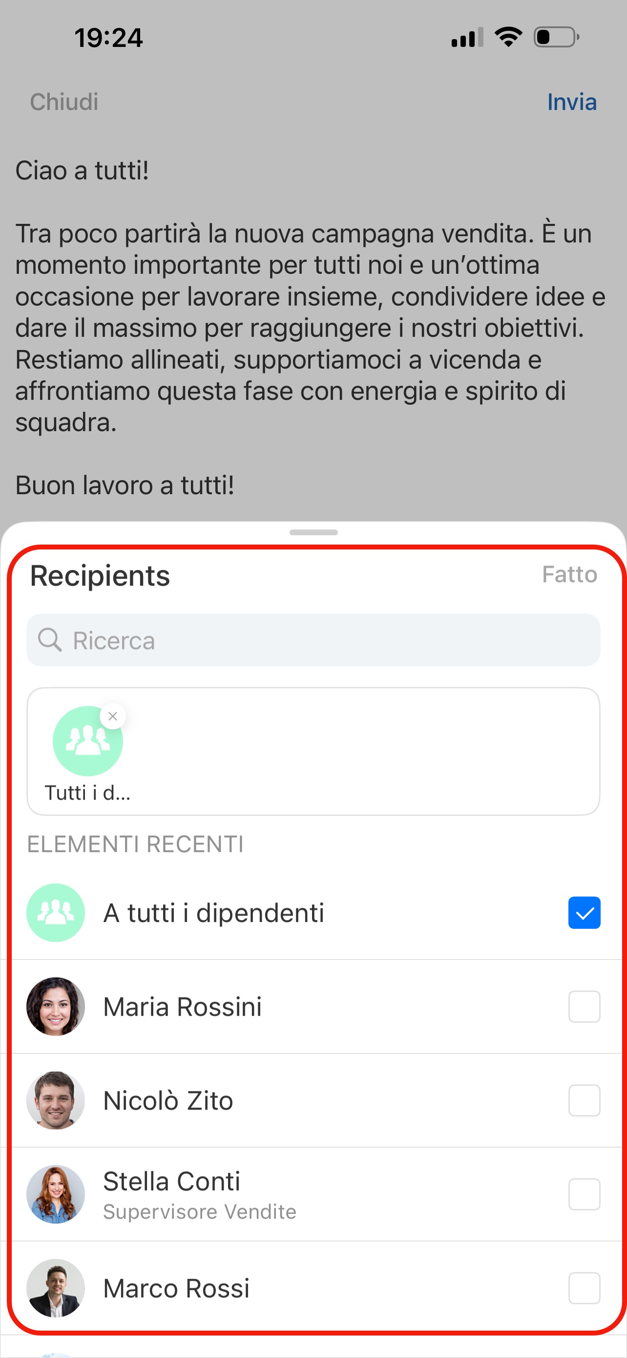 Nella finestra Destinatari seleziona i dipendenti necessari. Puoi utilizzare la ricerca. Fai clic su Fatto.