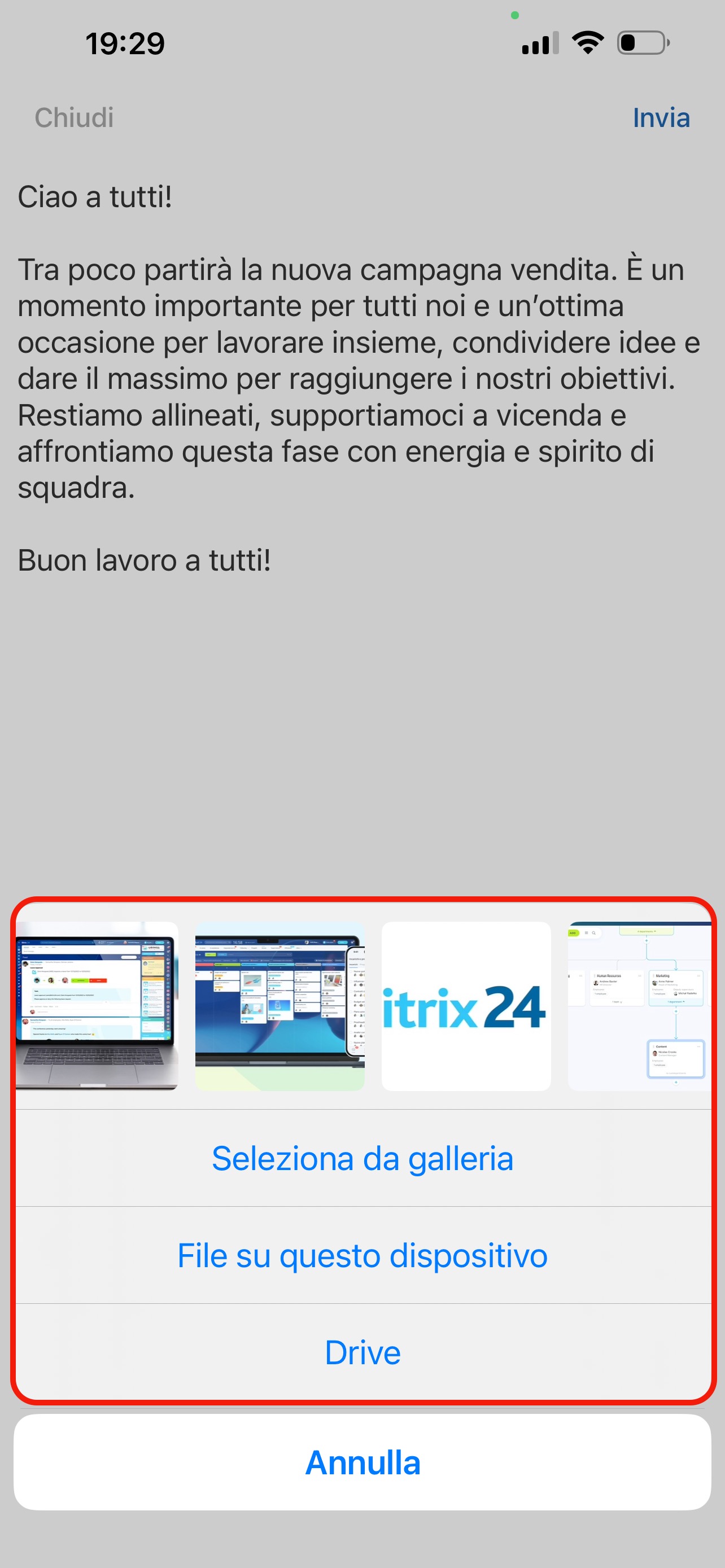 Puoi selezionare file dal telefono oppure dal Drive di Bitrix24.