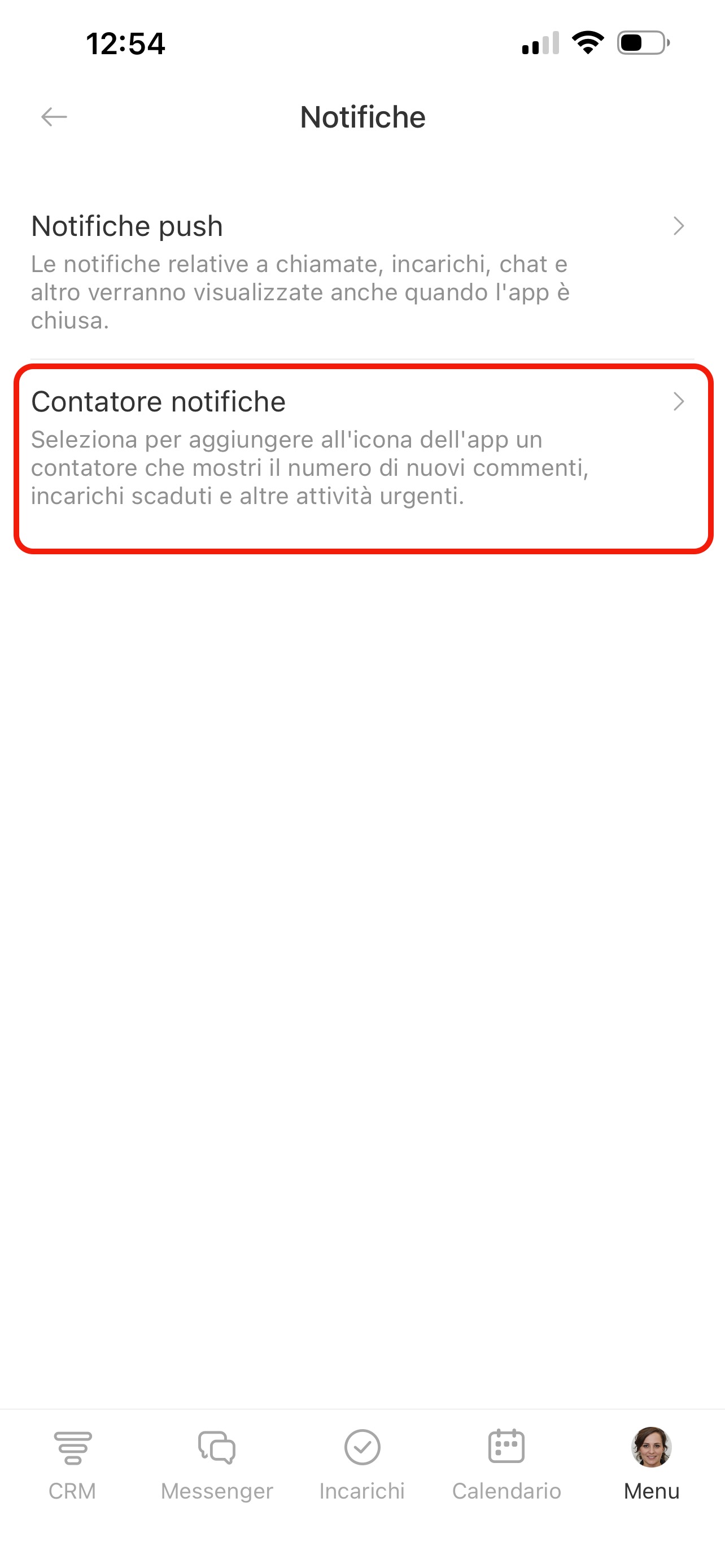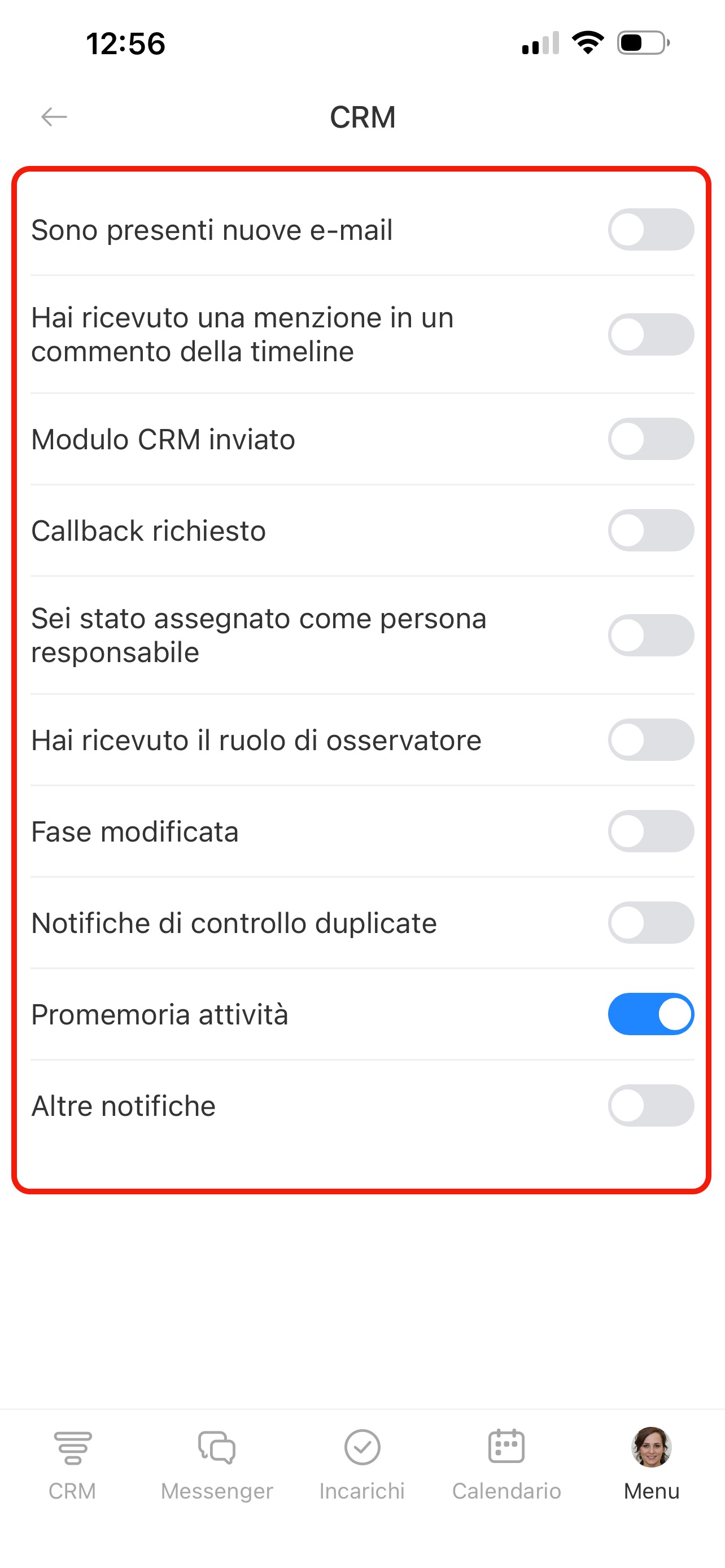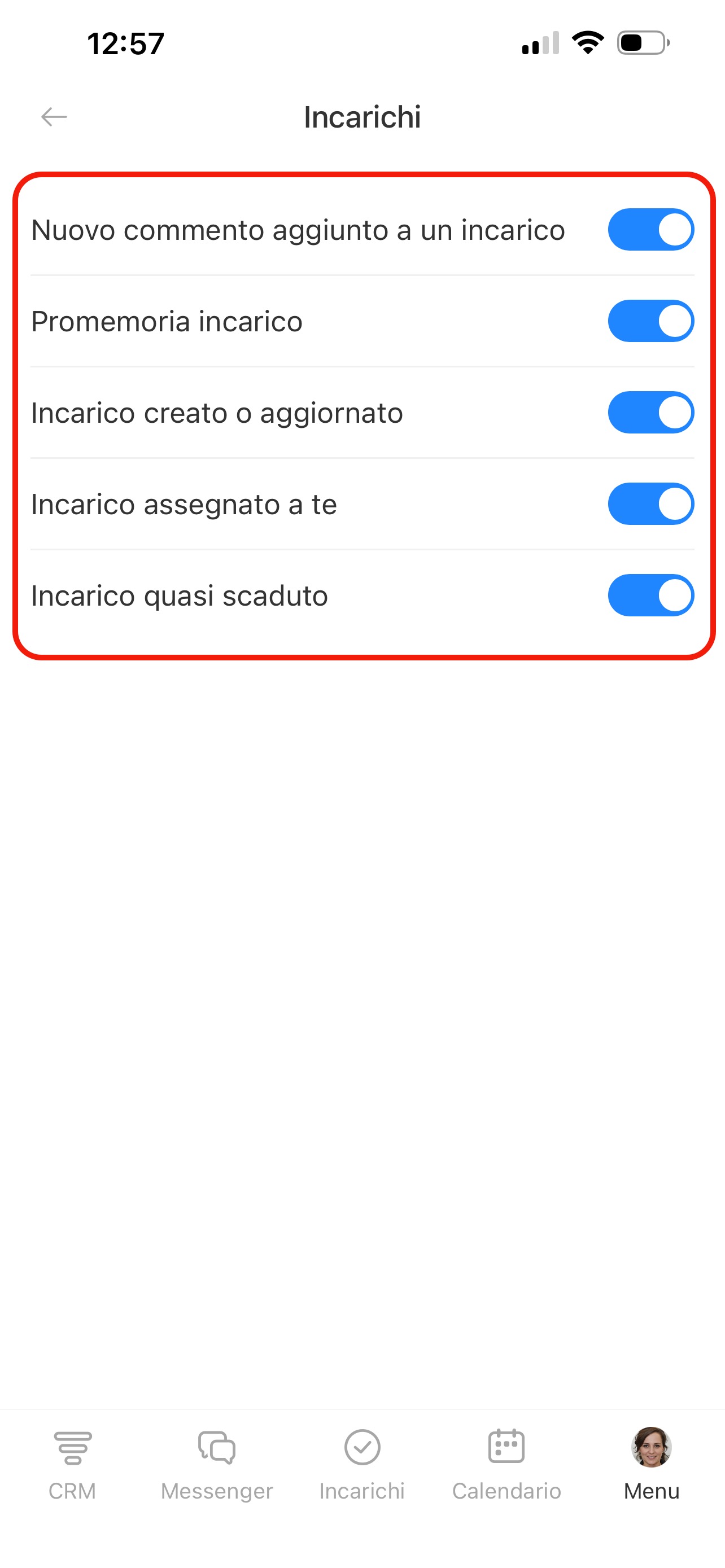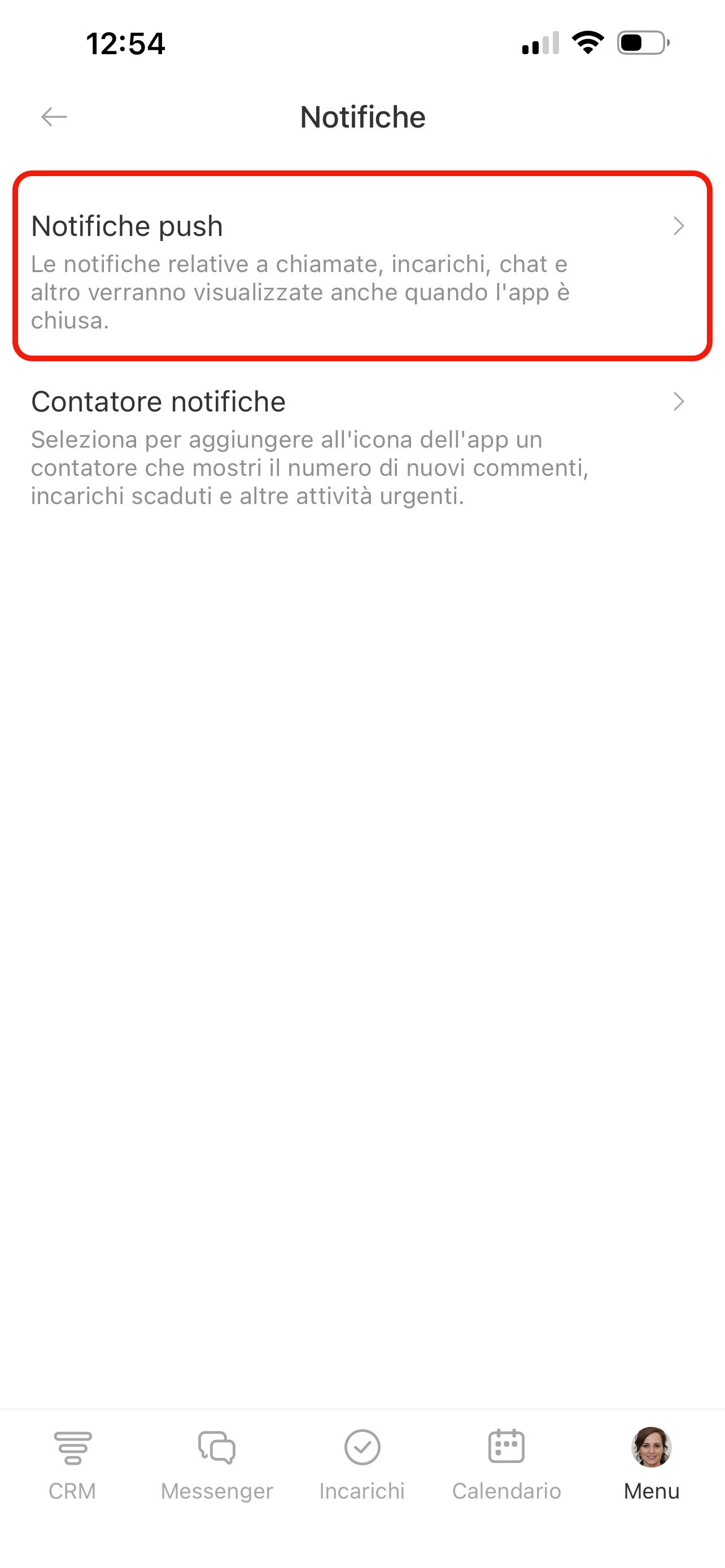Nella pagina Notifiche push trovi l’elenco delle sezioni: CRM, Incarichi, Chat e altre. In ogni sezione puoi scegliere per quali eventi ricevere notifiche. Premi una sezione e attiva le opzioni necessarie.