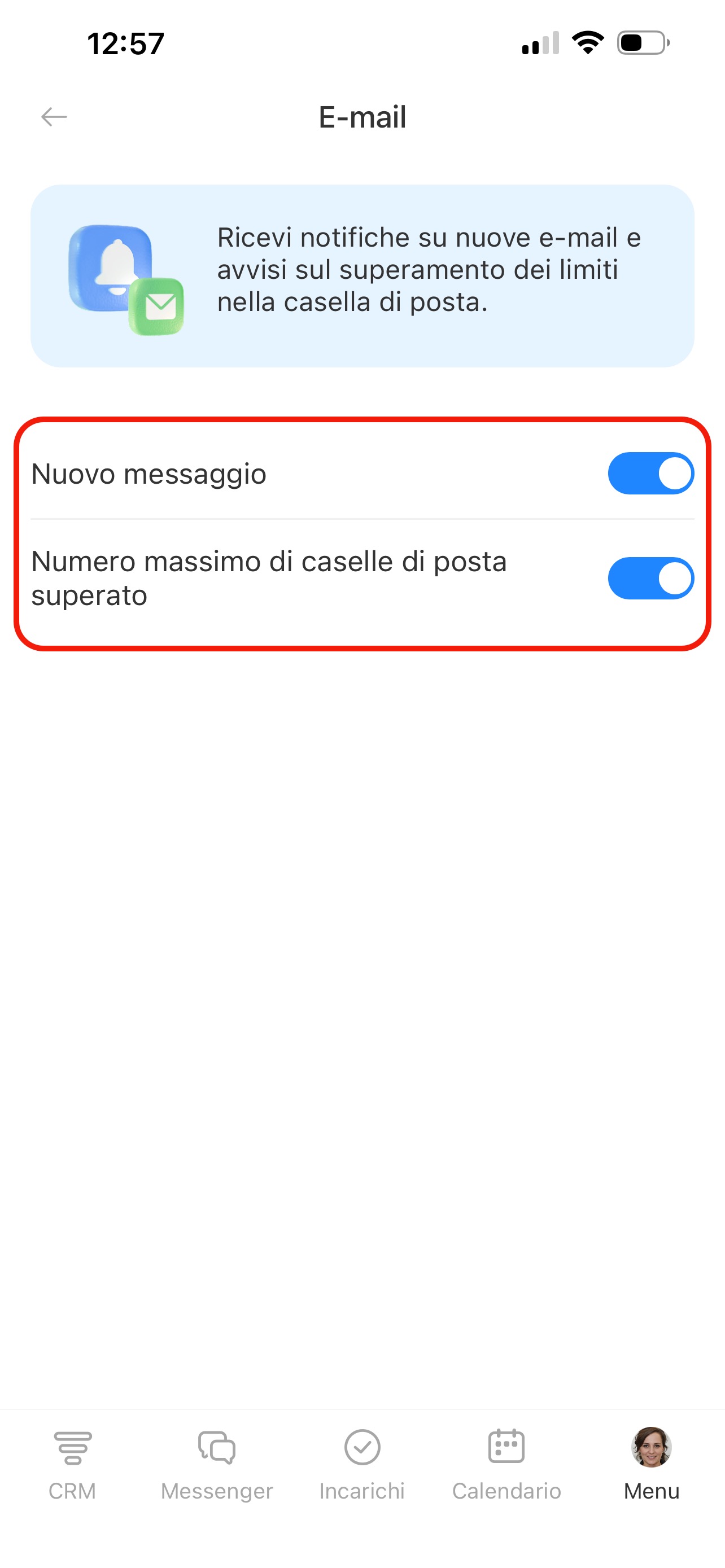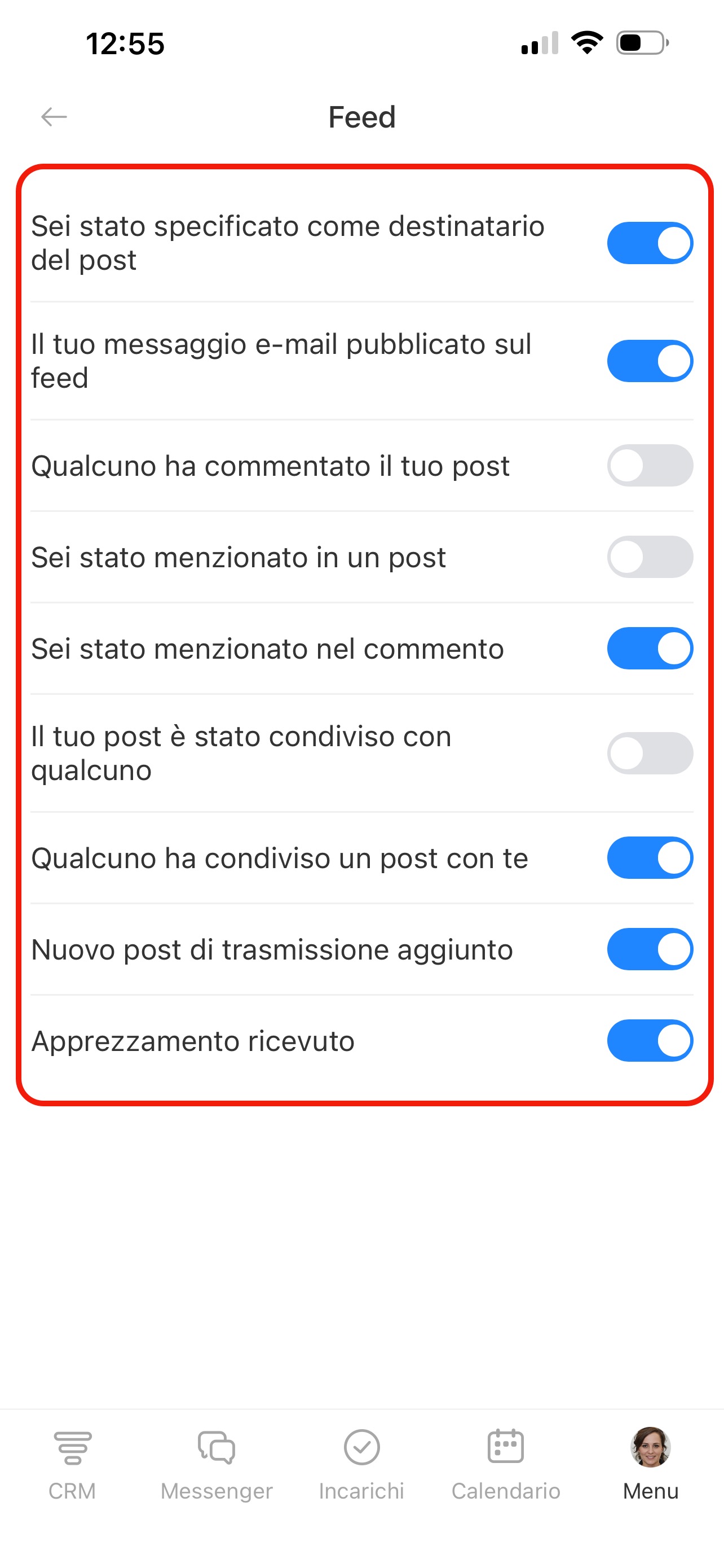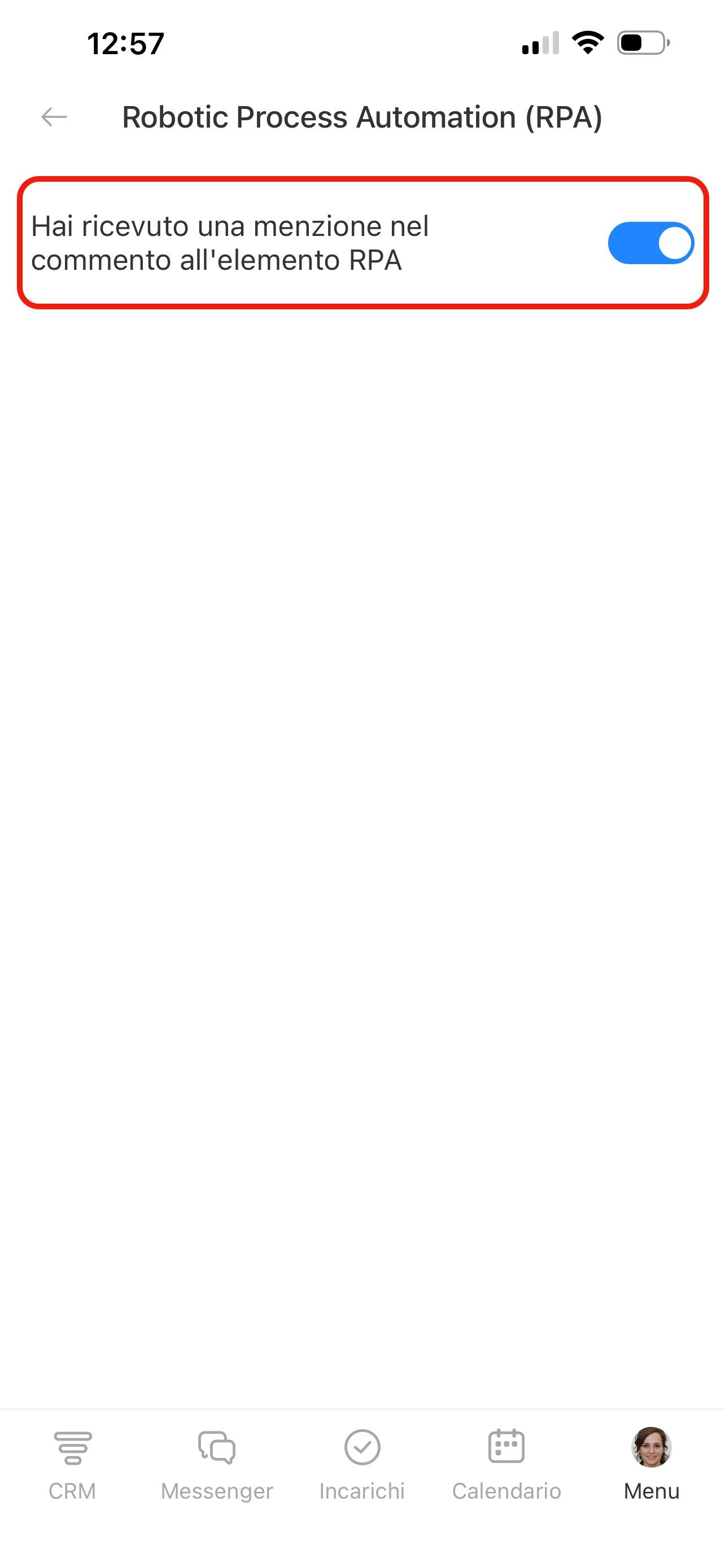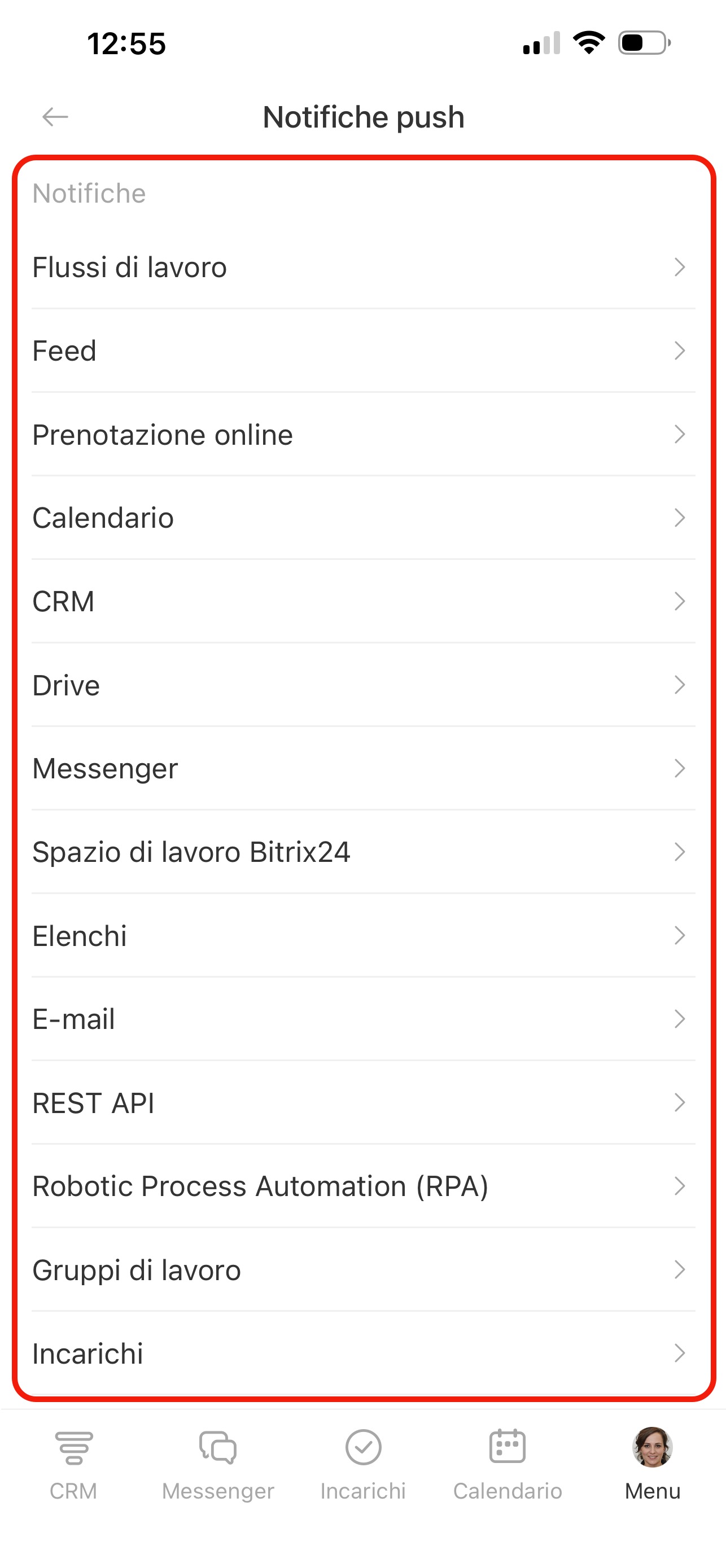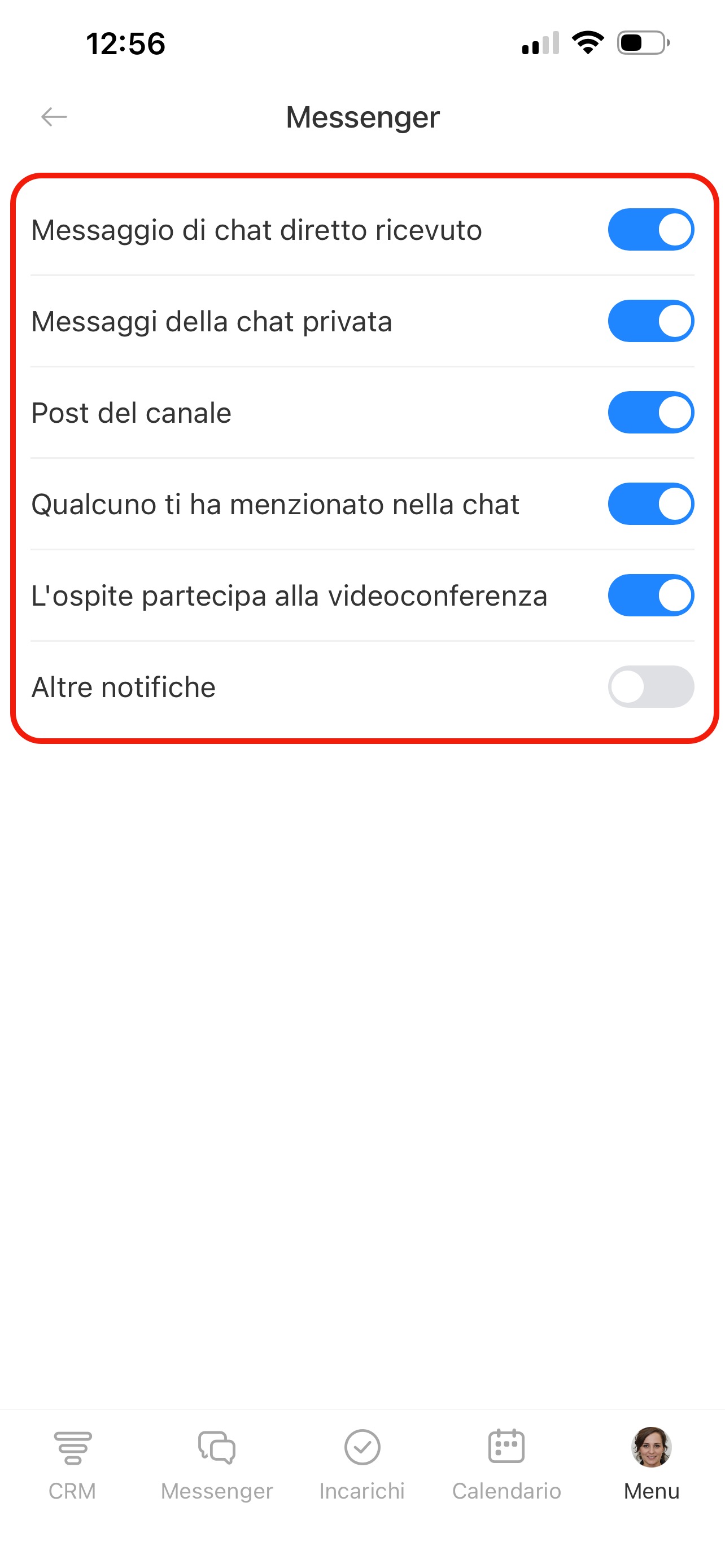 Nella pagina Notifiche push trovi l’elenco delle sezioni: CRM, Incarichi, Chat e altre. In ogni sezione puoi scegliere per quali eventi ricevere notifiche. Premi una sezione e attiva le opzioni necessarie.