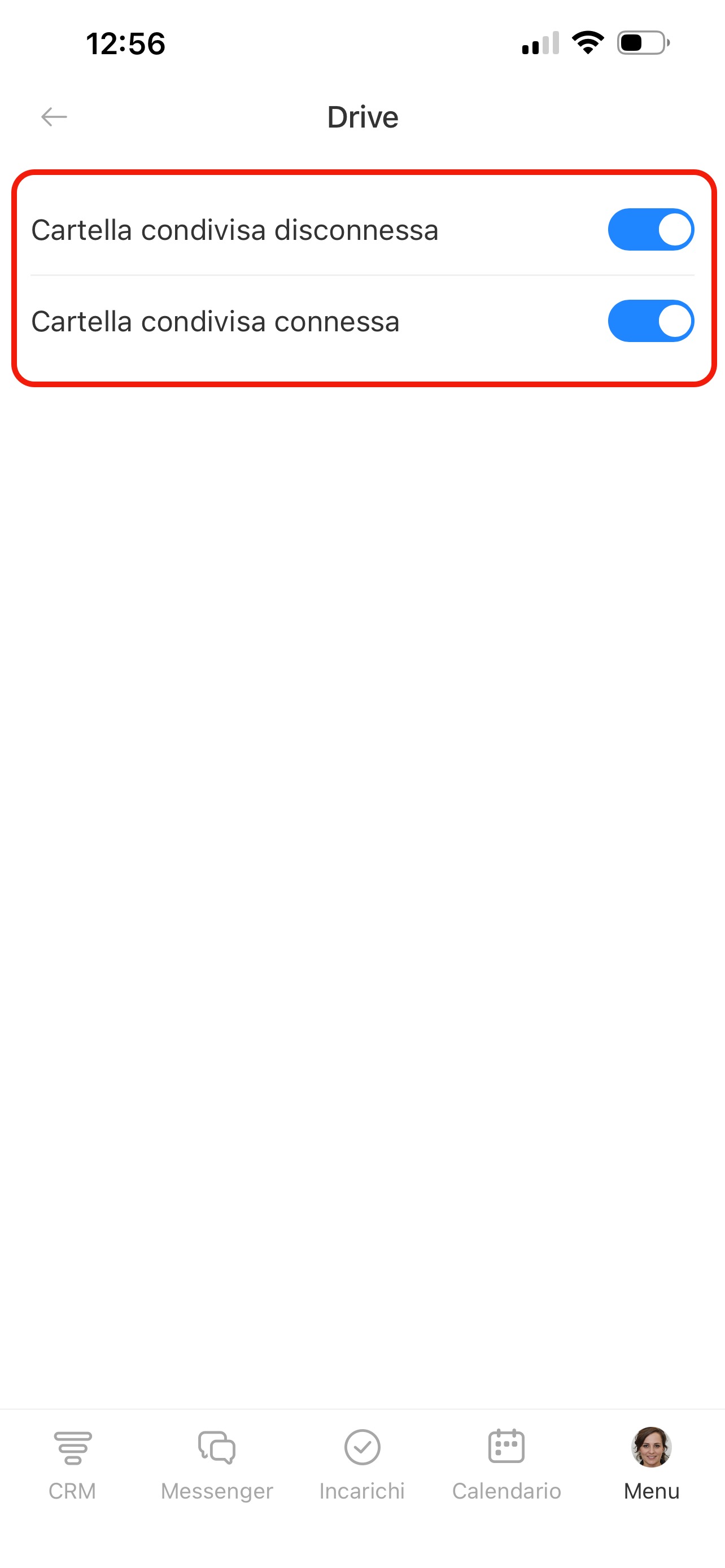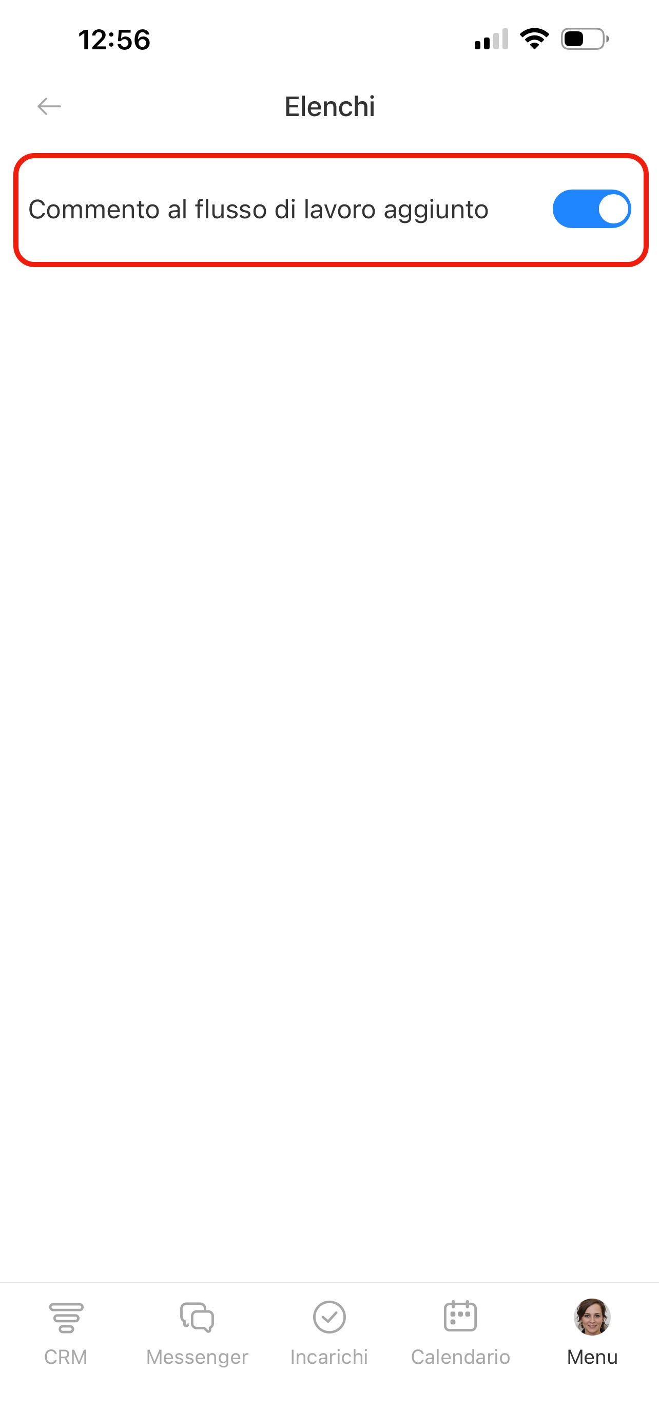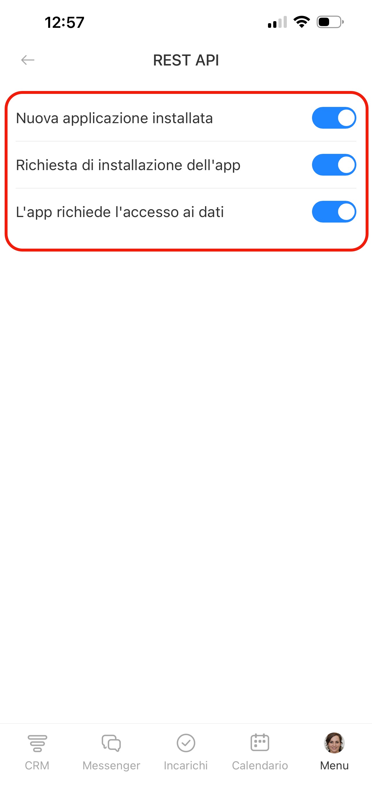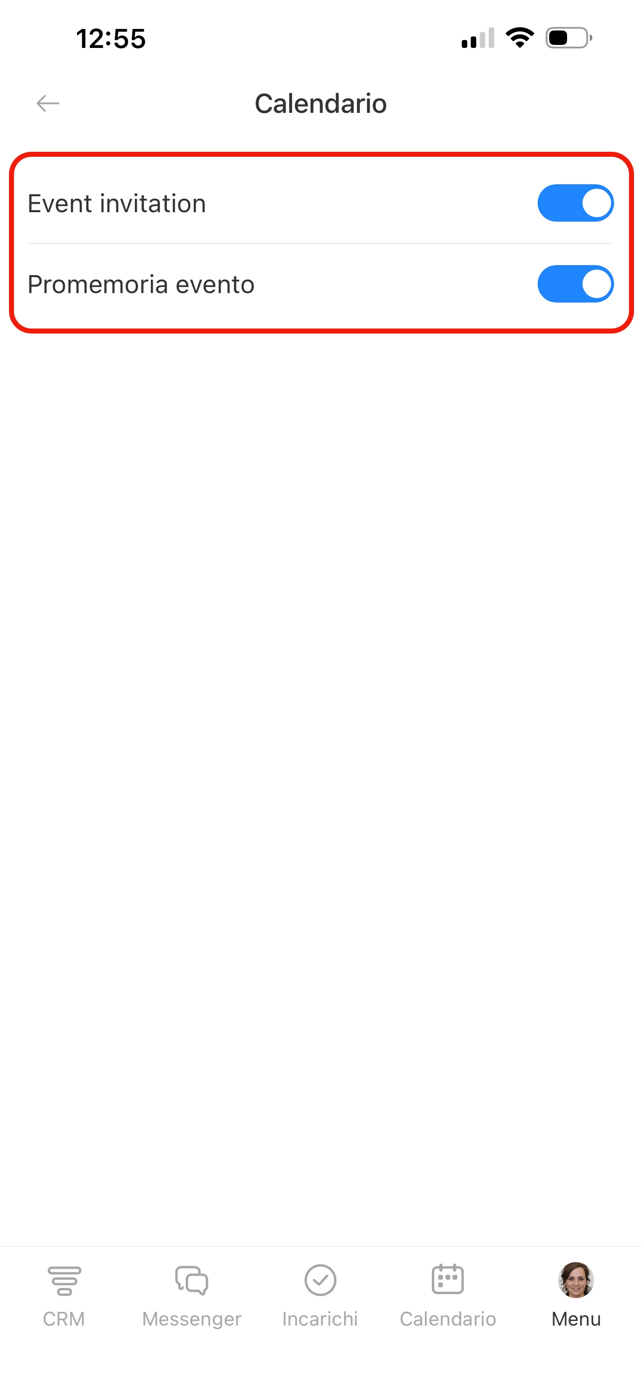 Nella pagina Notifiche push trovi l’elenco delle sezioni: CRM, Incarichi, Chat e altre. In ogni sezione puoi scegliere per quali eventi ricevere notifiche. Premi una sezione e attiva le opzioni necessarie.