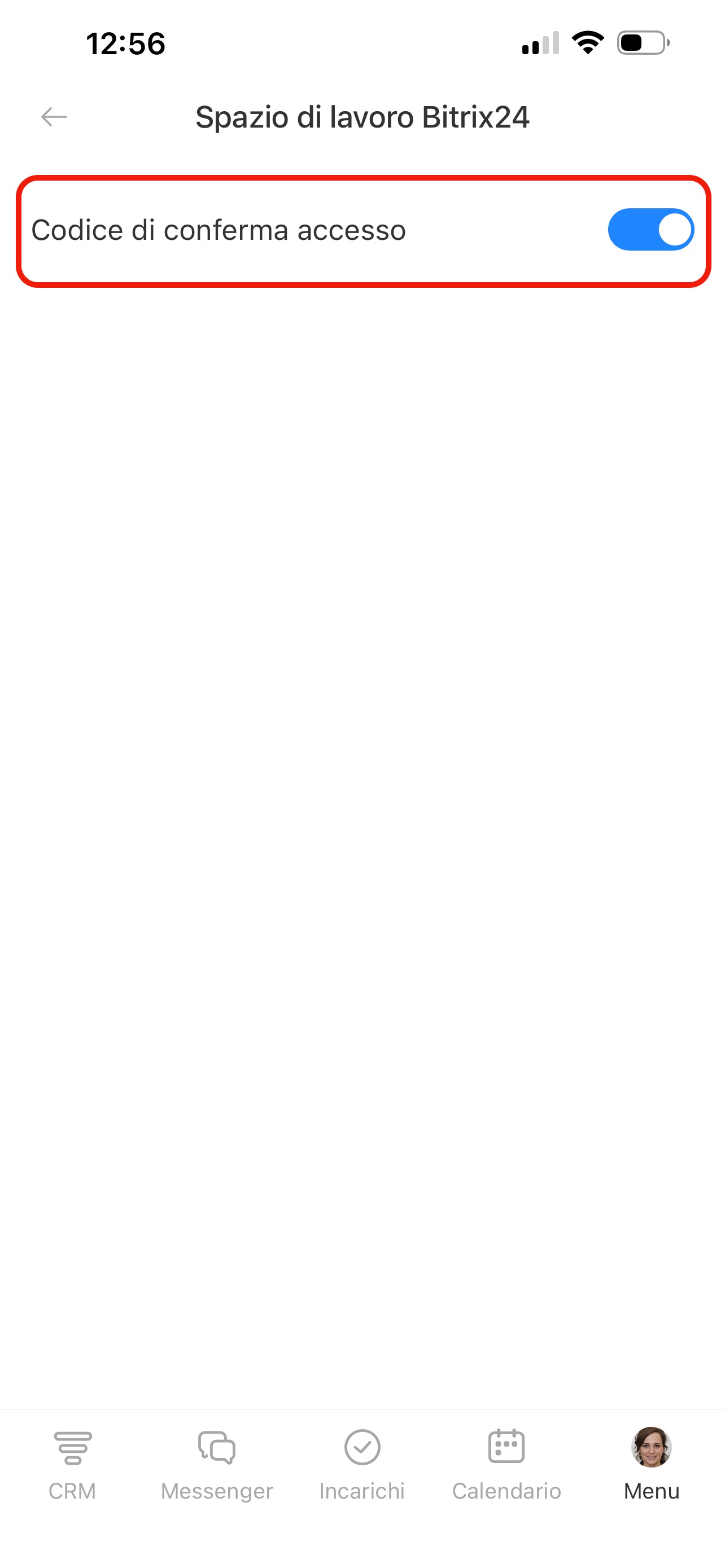Spazio di lavoro Bitrix24: attiva l’opzione Codice di conferma accesso per ricevere il codice della verifica in due passaggi.