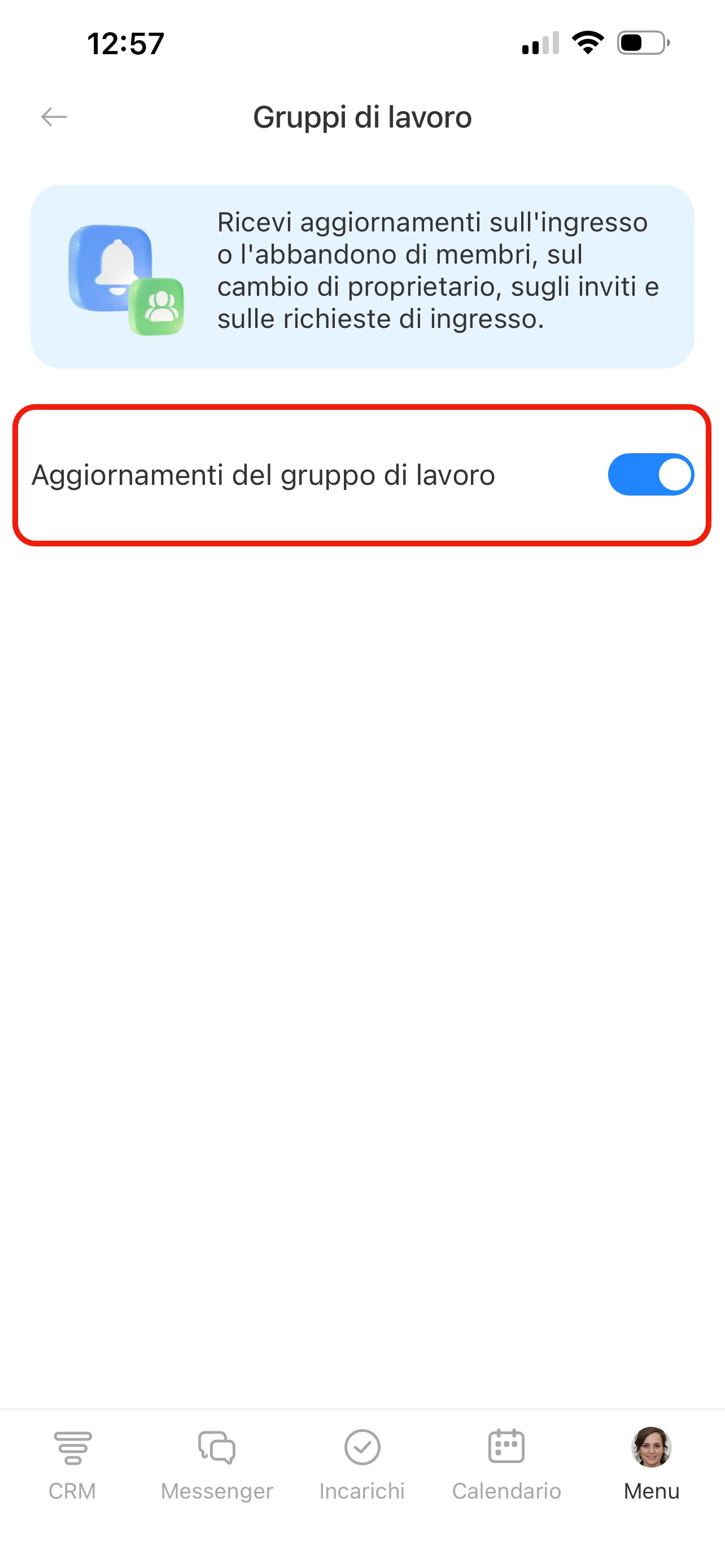 Gruppi di lavoro: attiva Aggiornamenti del gruppo di lavoro per ricevere notifiche sui cambiamenti nei gruppi.