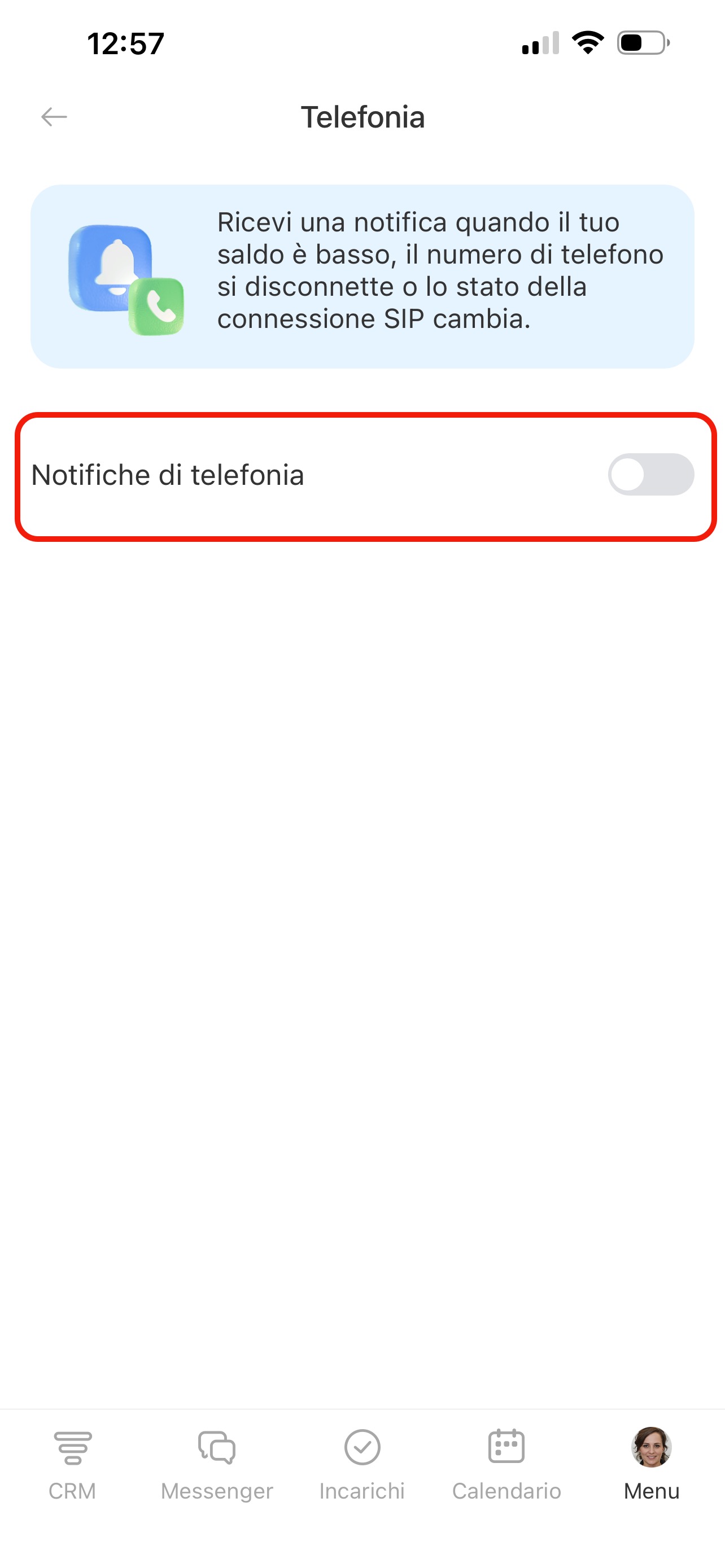 Telefonia: attiva le notifiche per saldo basso, disconnessione del numero o modifiche dello stato SIP.