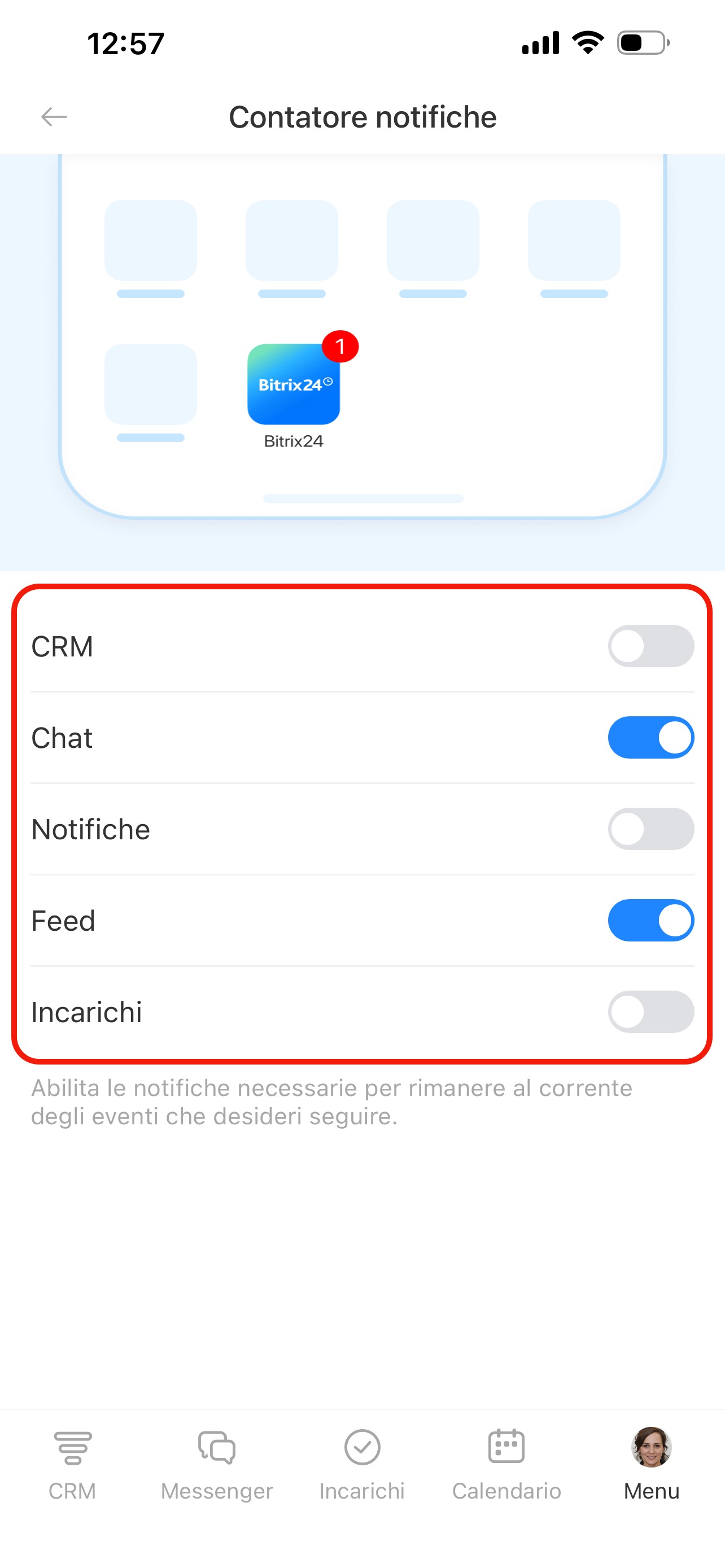 Scegli le sezioni da includere: CRM, Chat, Notifiche, Feed o Incarighi. Ad esempio puoi attivare il contatore per chat e feed per non perdere messaggi o discussioni importanti.
