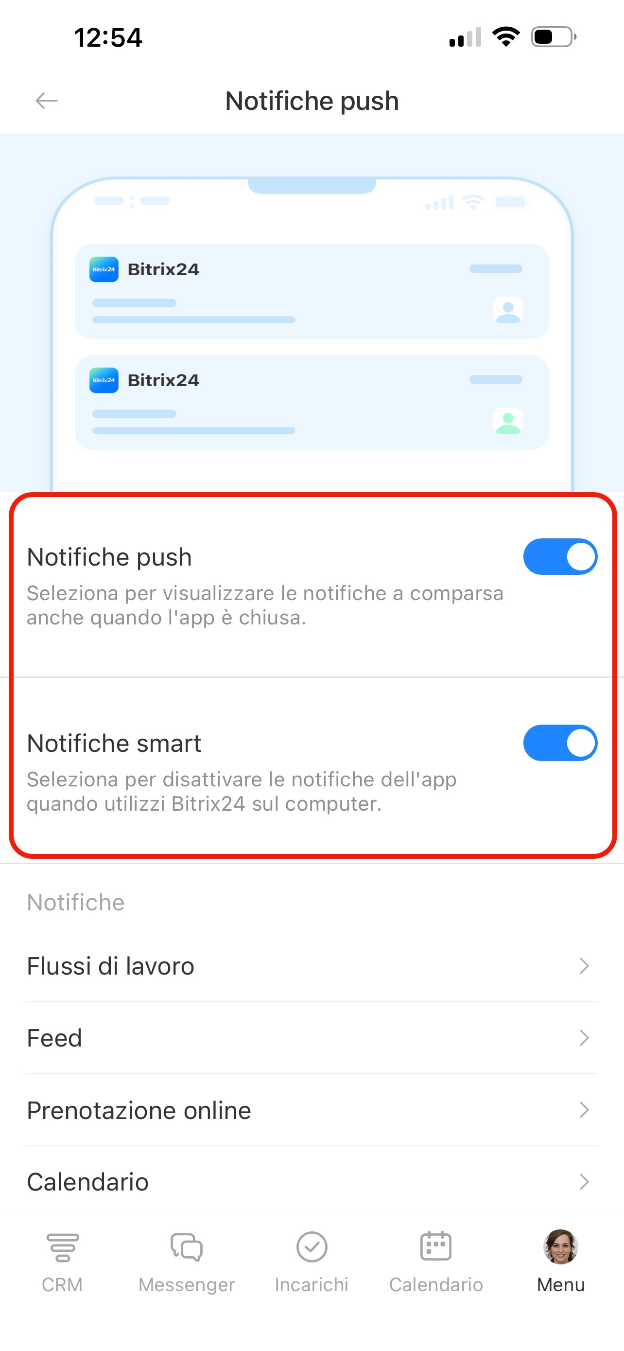 - Notifiche smart: le notifiche non arrivano sul telefono se Bitrix24 è aperto sul computer.