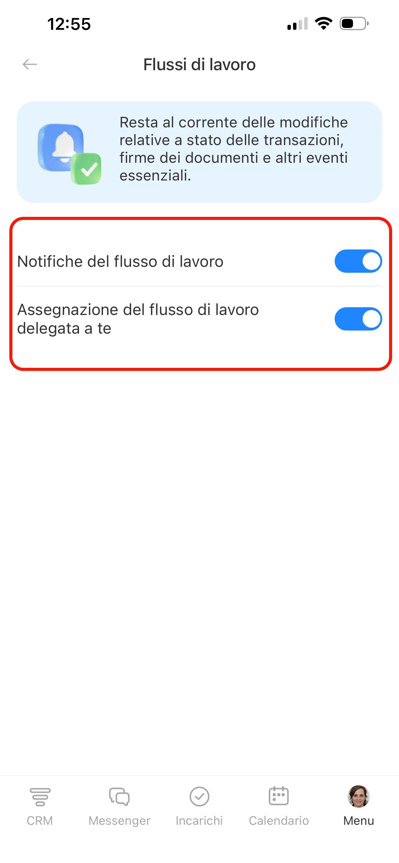 Flussi di lavoro: attiva le notifiche se partecipi ai flussi di lavoro, ad esempio approvazione documenti o organizzazione attività.