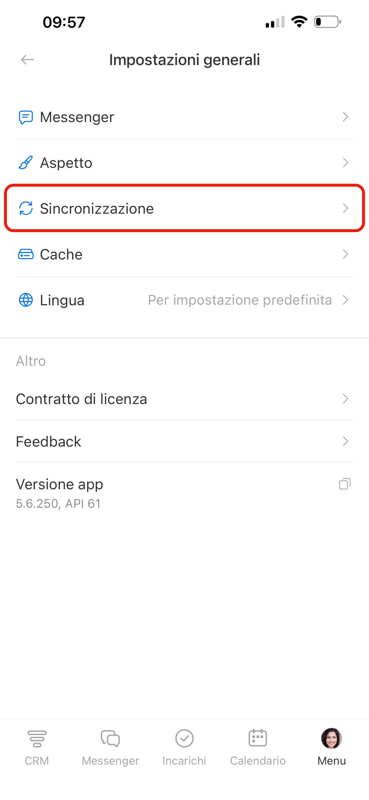 Nell’app mobile Bitrix24 vai alla scheda Menu nell’angolo in basso a destra. Seleziona Generali nella sezione Impostazioni.