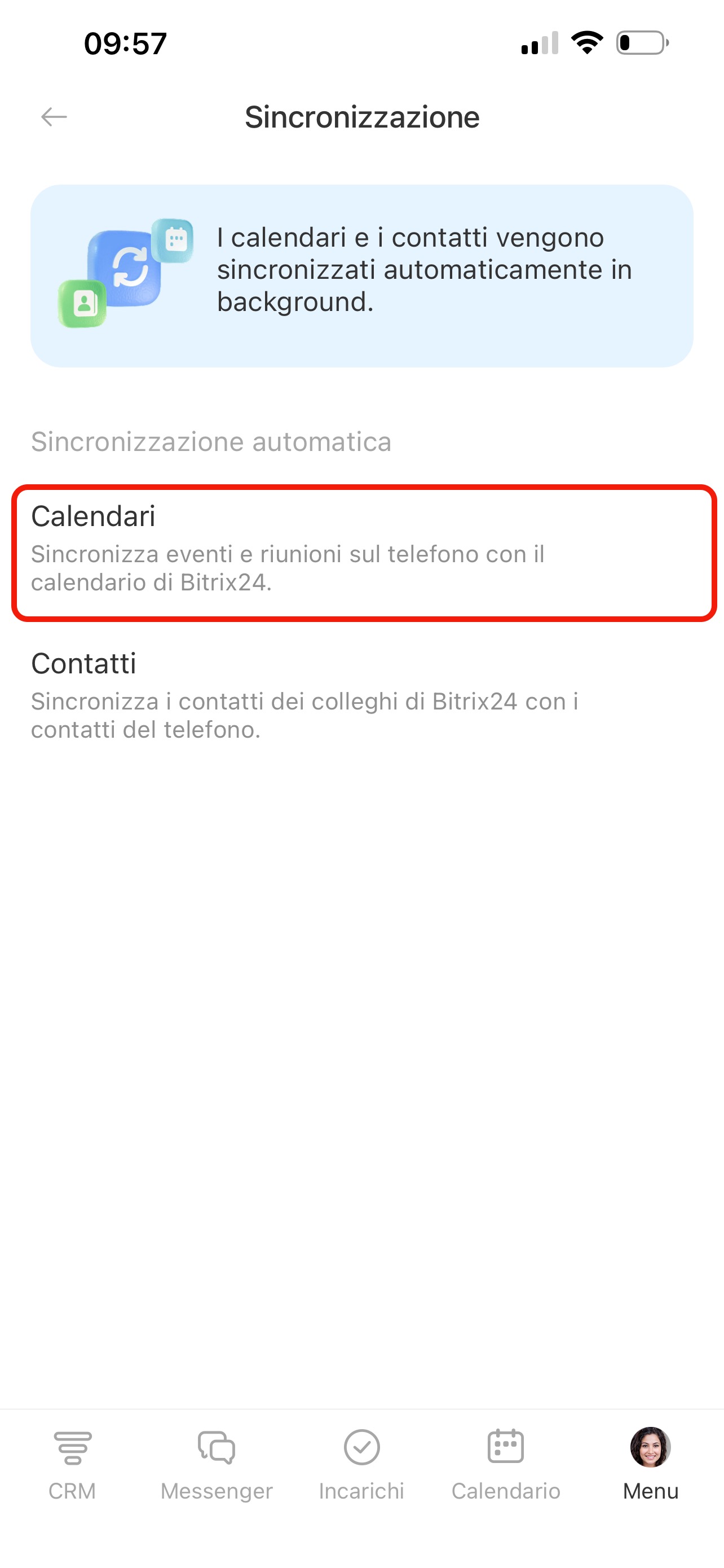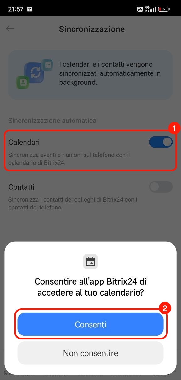 Sincronizzazione dei calendari. Attiva l’opzione Calendari. L’app richiederà l’accesso al calendario del telefono: concedilo, altrimenti la sincronizzazione non funzionerà. Dopo questo passaggio, le riunioni dal calendario del telefono appariranno in Bitrix24 e viceversa.
