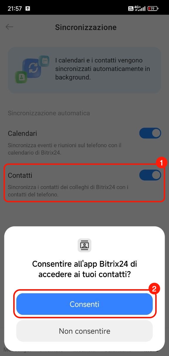 Sincronizzazione dei contatti. Attiva l’opzione Contatti. L’app richiederà l’accesso ai contatti del telefono: concedilo, altrimenti la sincronizzazione non funzionerà. Dopo questo passaggio, i contatti dei dipendenti di Bitrix24 appariranno nella rubrica del telefono. I contatti del dispositivo non vengono aggiunti in Bitrix24.
