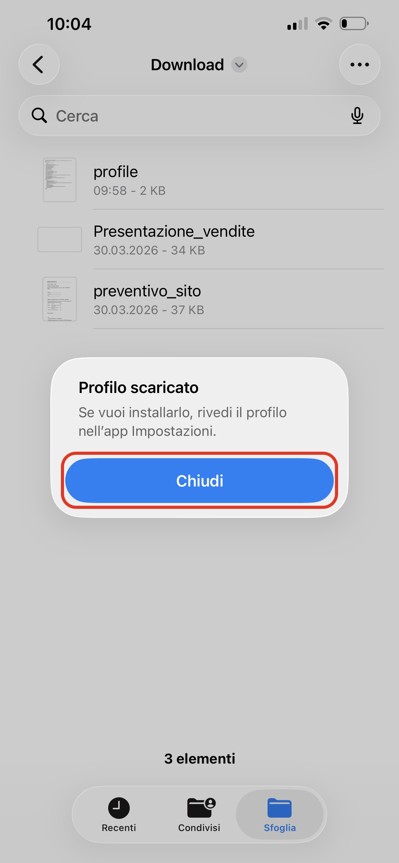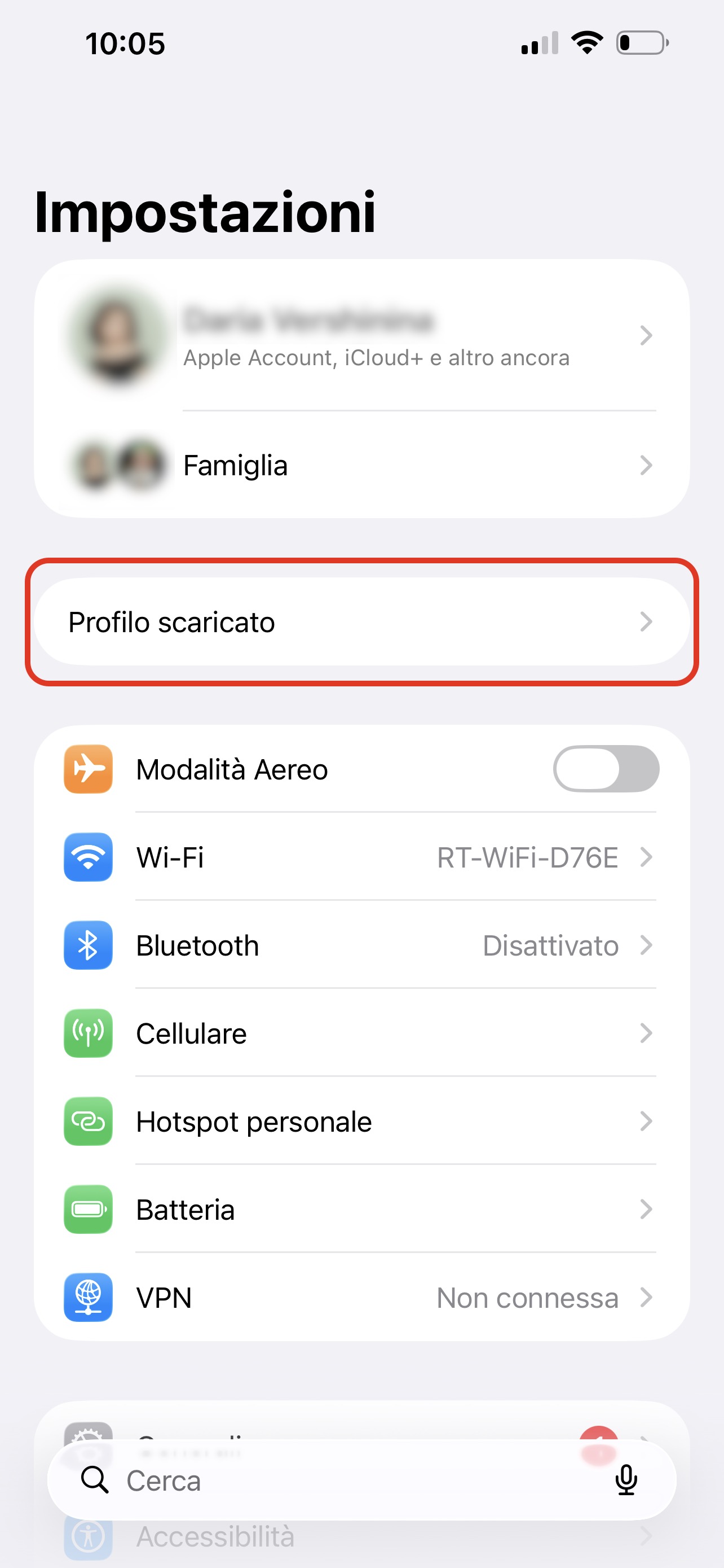 Dopo aver scaricato il profilo, apri l’app Impostazioni sul telefono. Premi Profilo scaricato.