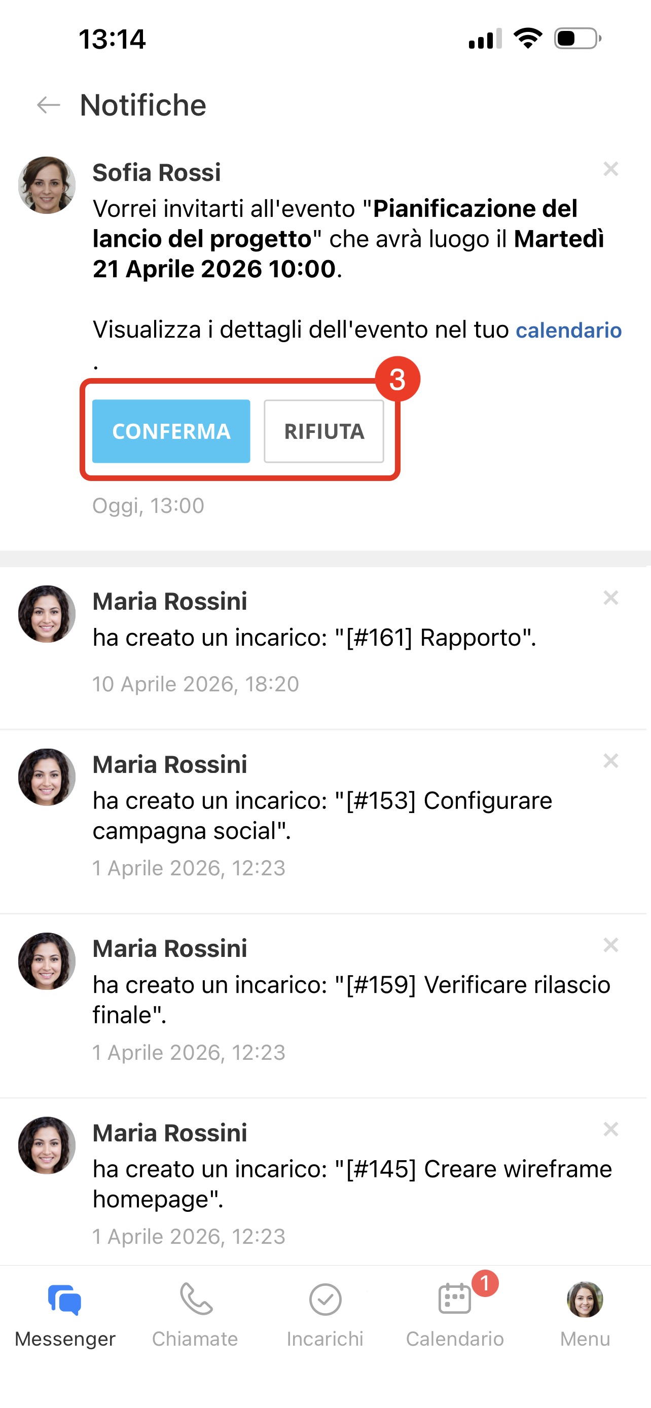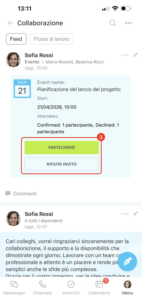 Puoi confermare o rifiutare la partecipazione in tre modi: dalle notifiche, dal feed o dal calendario.