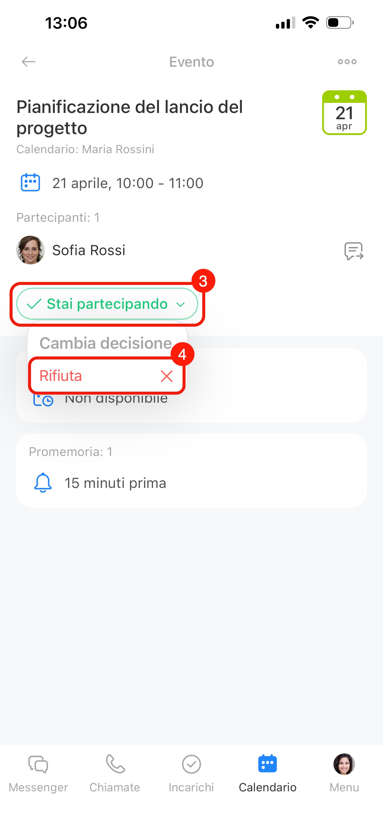 Premi il pulsante Stai partecipando. Nel menu che si apre, premi Rifiuta.