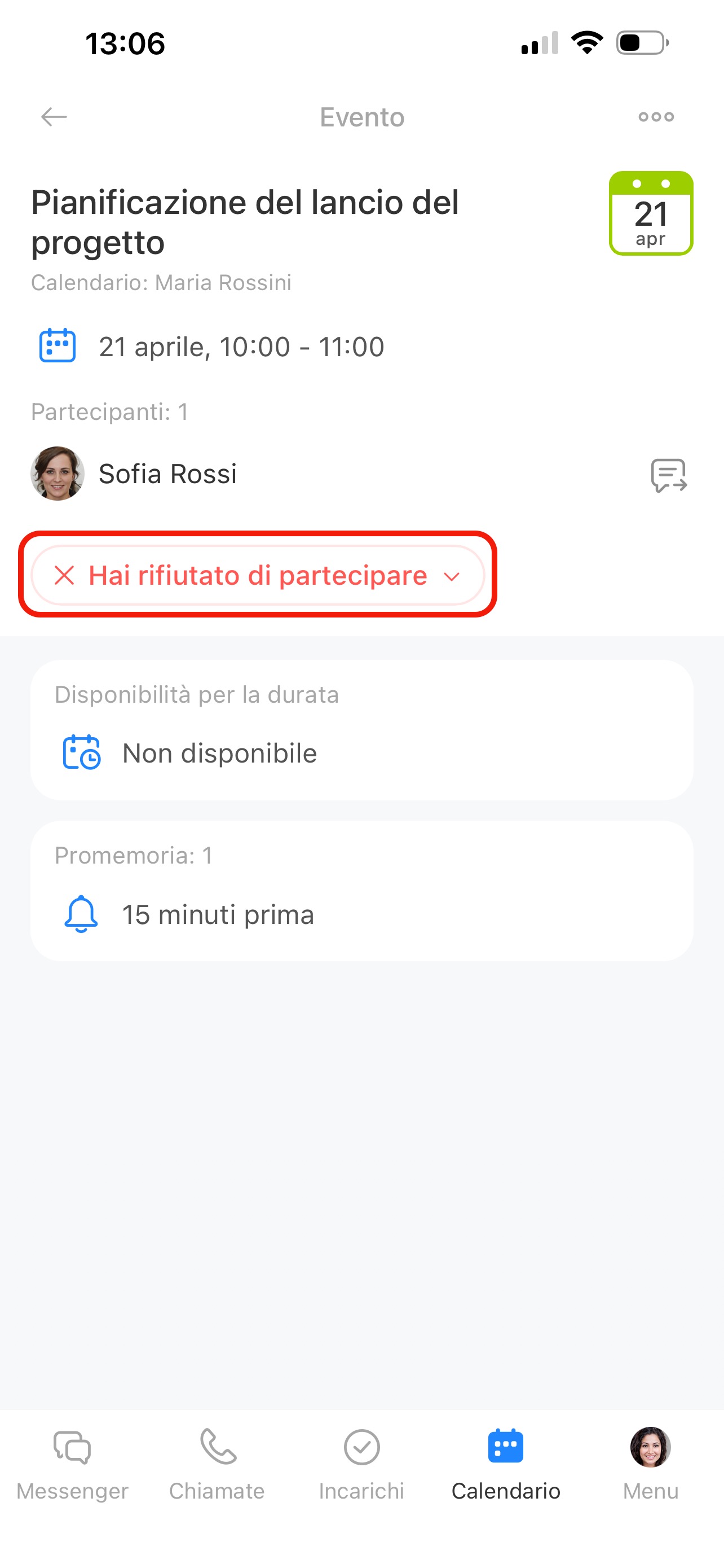 Lo stato cambierà in Hai rifiutato di partecipare e comparirai nell’elenco dei partecipanti che hanno rifiutato.