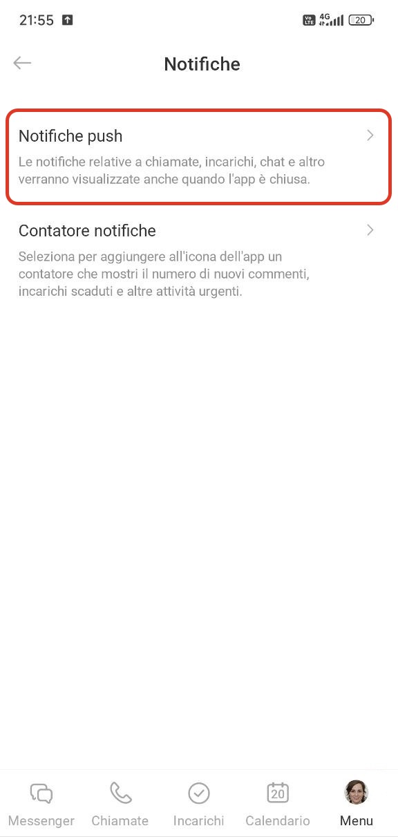 - Notifiche push: vengono mostrate sullo schermo anche quando l’app è chiusa. Ad esempio, un messaggio o una notifica su un incarico appare subito sullo schermo.