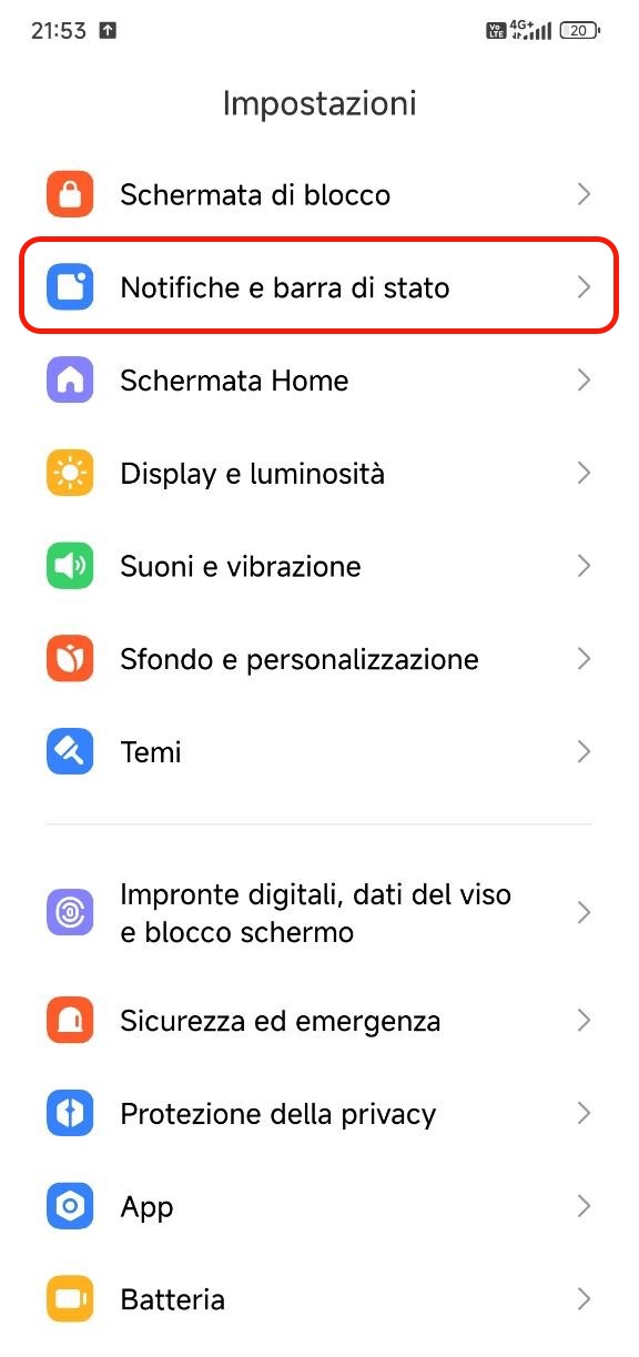 Apri le impostazioni del dispositivo e vai nella sezione Notifiche e barra di stato. Se non trovi la sezione, usa la ricerca in alto.