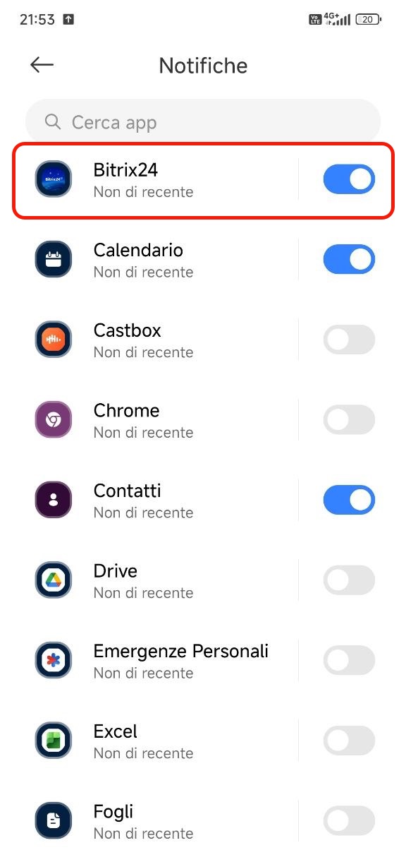 Per ricevere le notifiche su Android, attivale nell’app Bitrix24 e nelle impostazioni del dispositivo.
