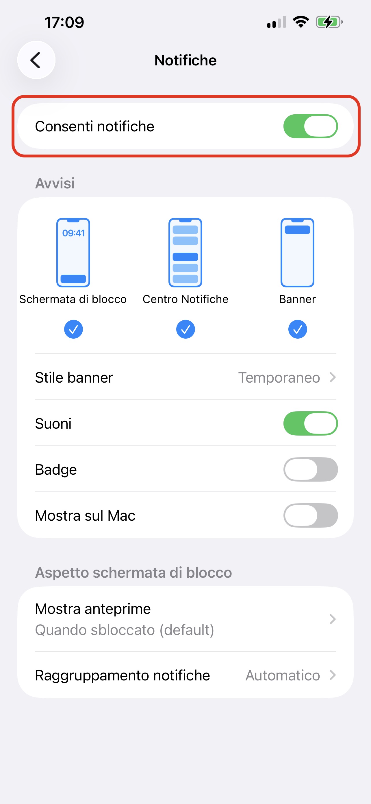 Verifica che l’opzione Consenti notifiche sia attiva. Qui puoi anche scegliere come mostrarle: schermata di blocco, centro notifiche o banner.