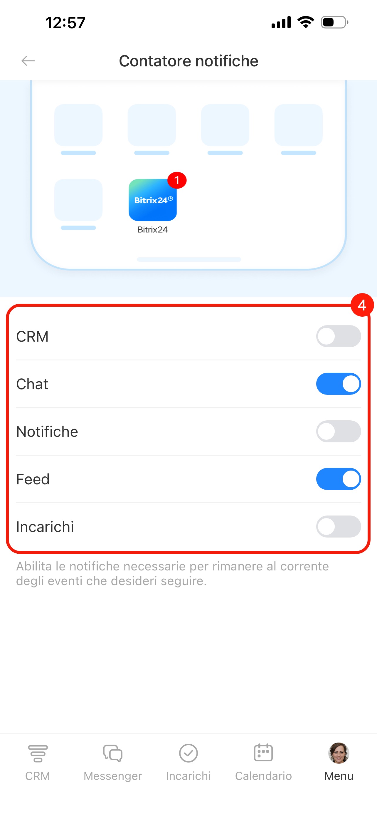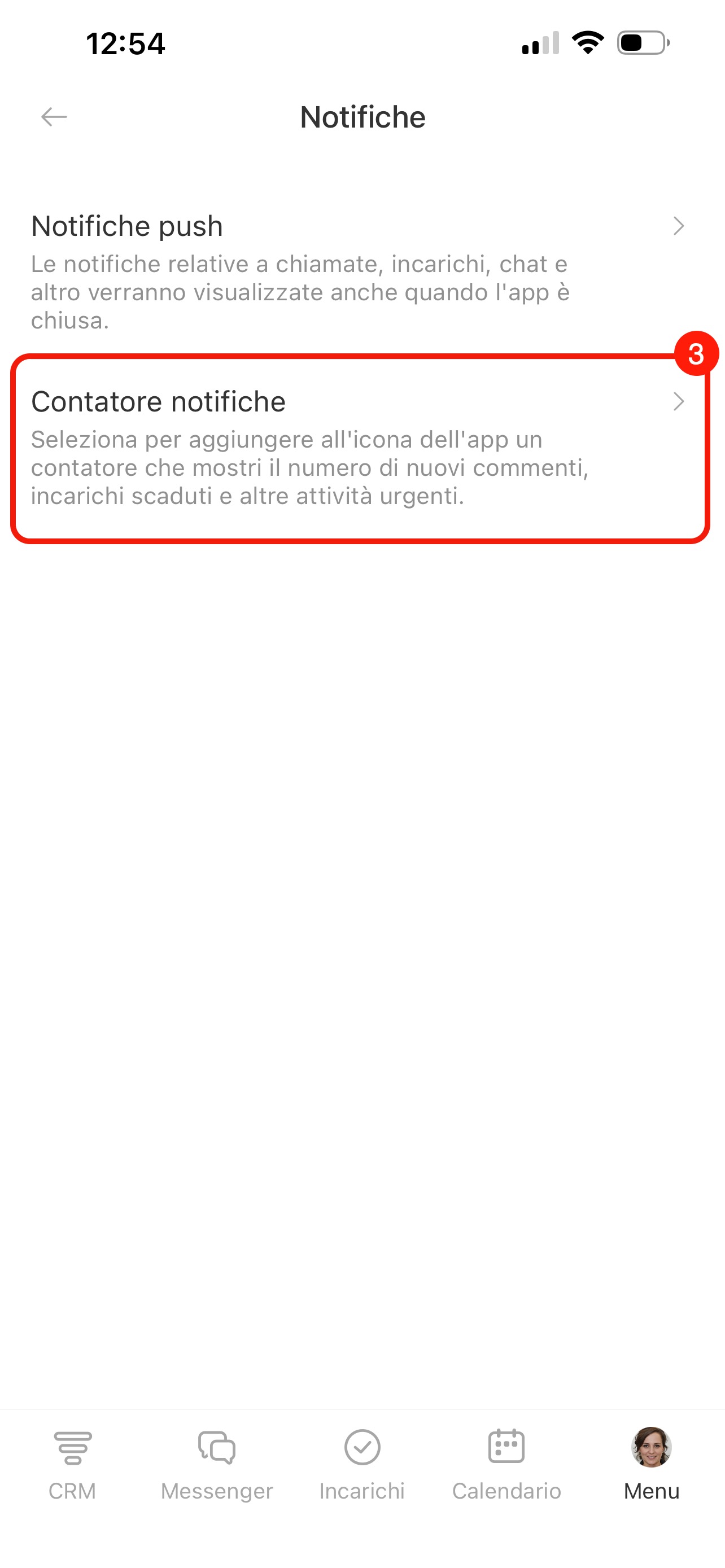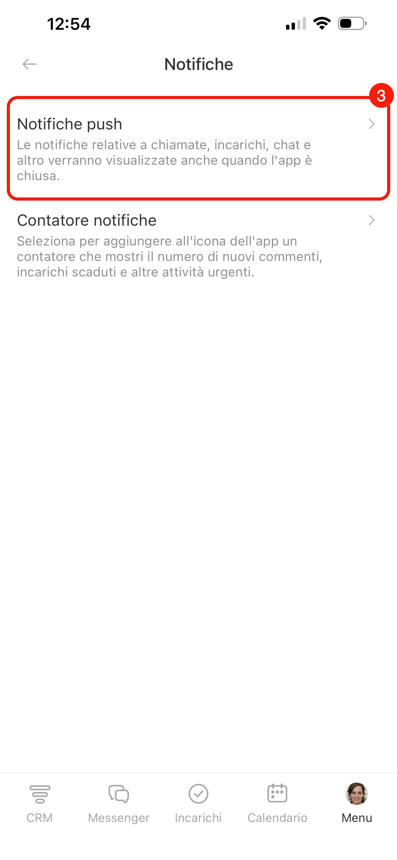 Le notifiche push ti informano sui nuovi incarichi, messaggi, attività nel CRM e altri eventi, anche quando l’app è chiusa. Per riceverle, attivale in due luoghi: nell’app e nelle impostazioni dell’iPhone.