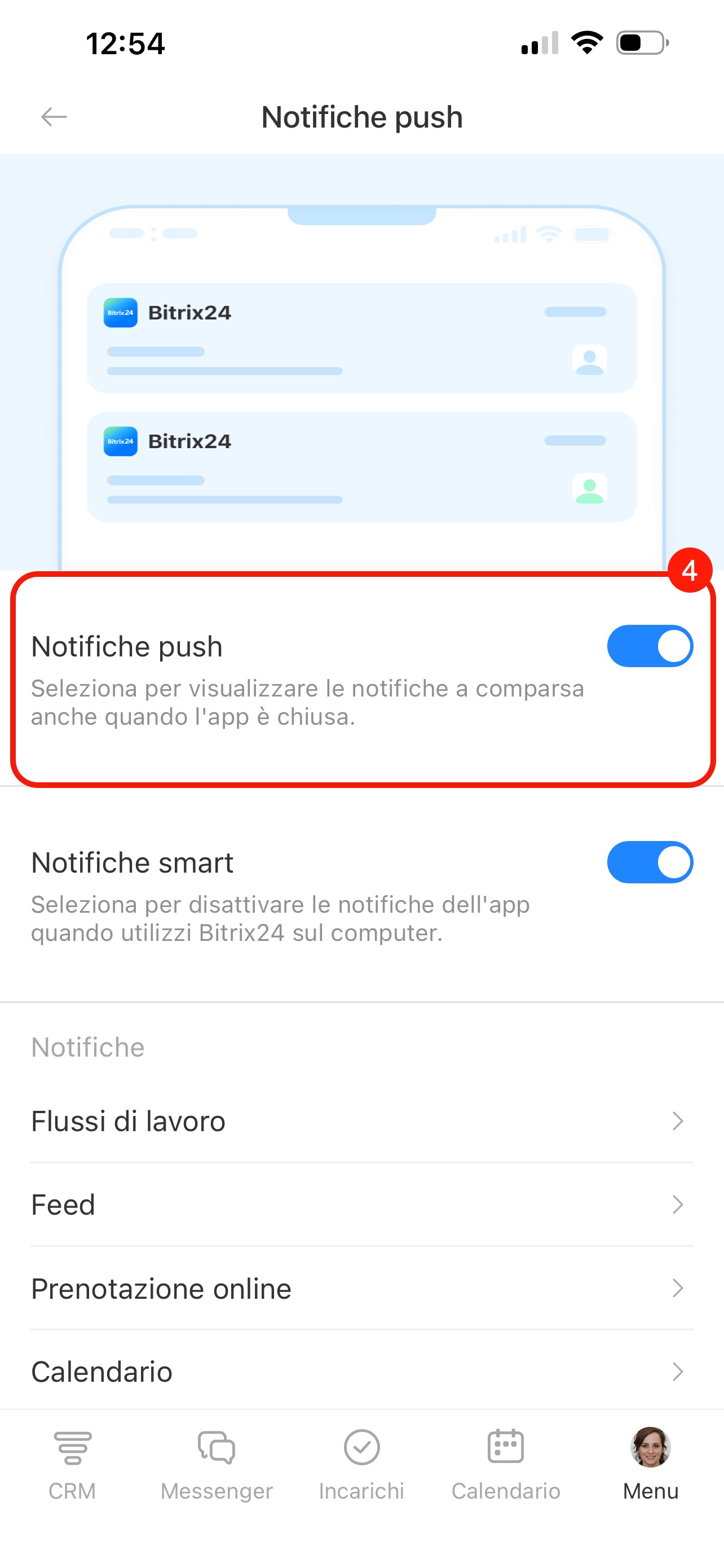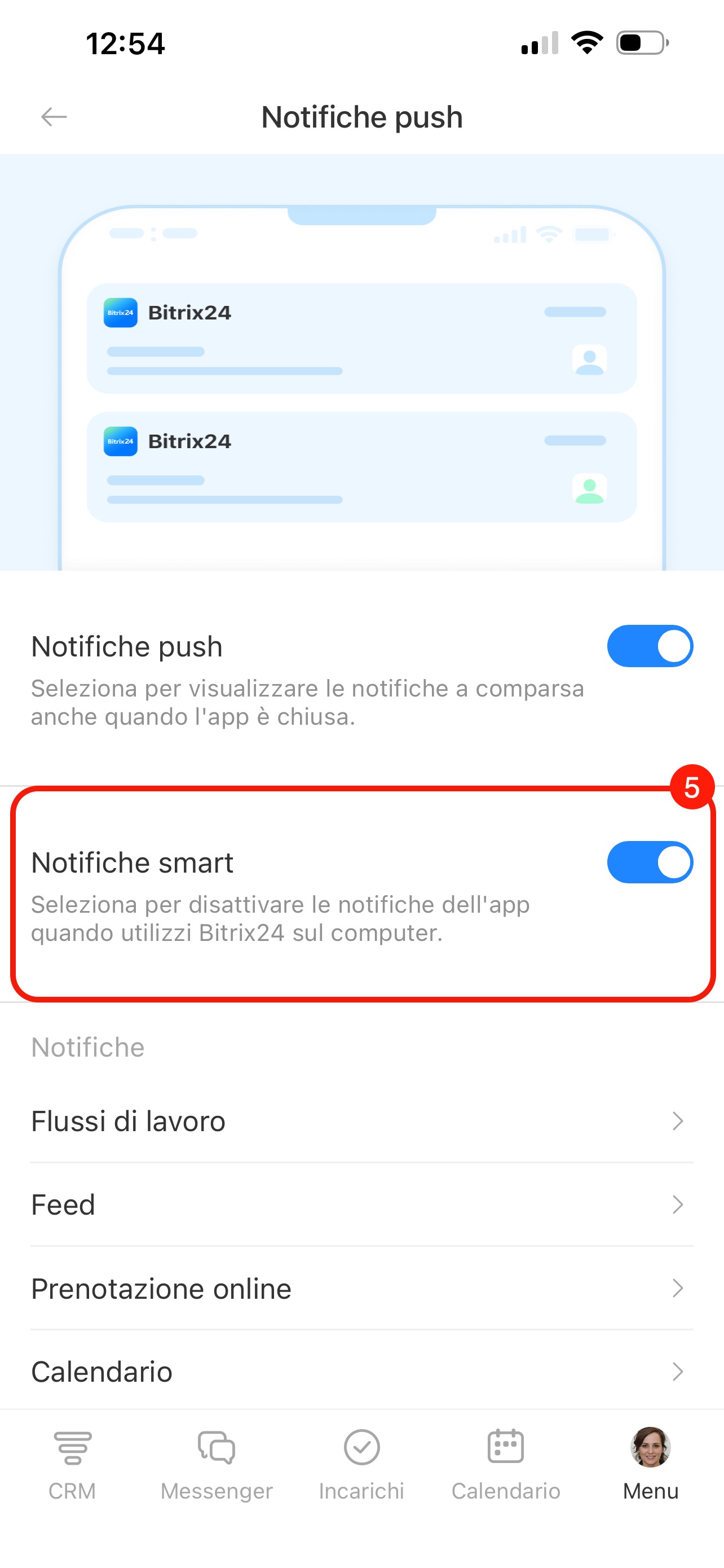 5. Se necessario, attiva Notifiche smart: le notifiche non arriveranno sul telefono mentre lavori in Bitrix24 sul computer.
