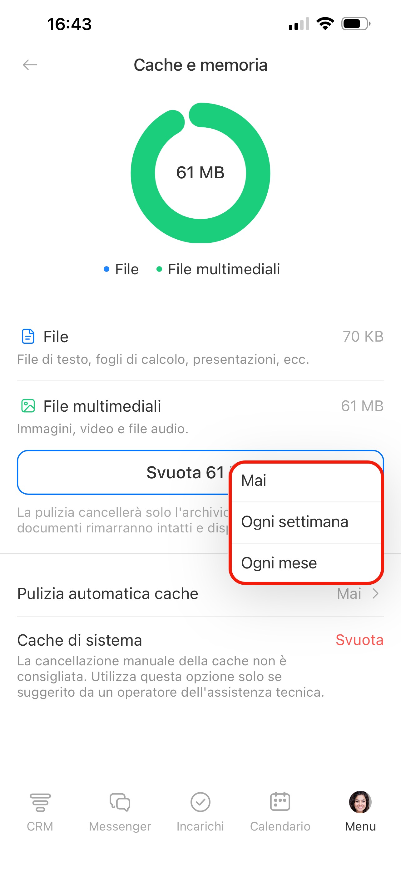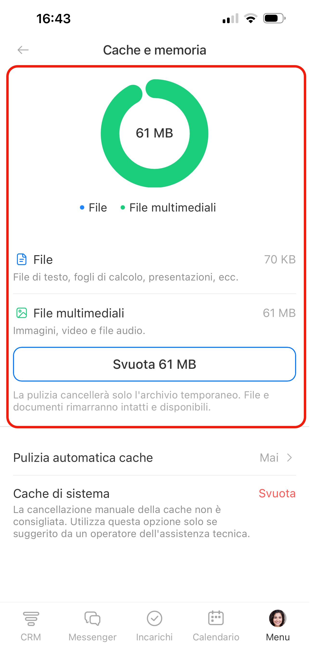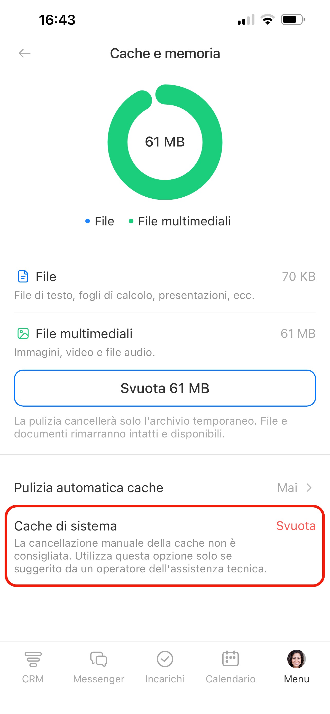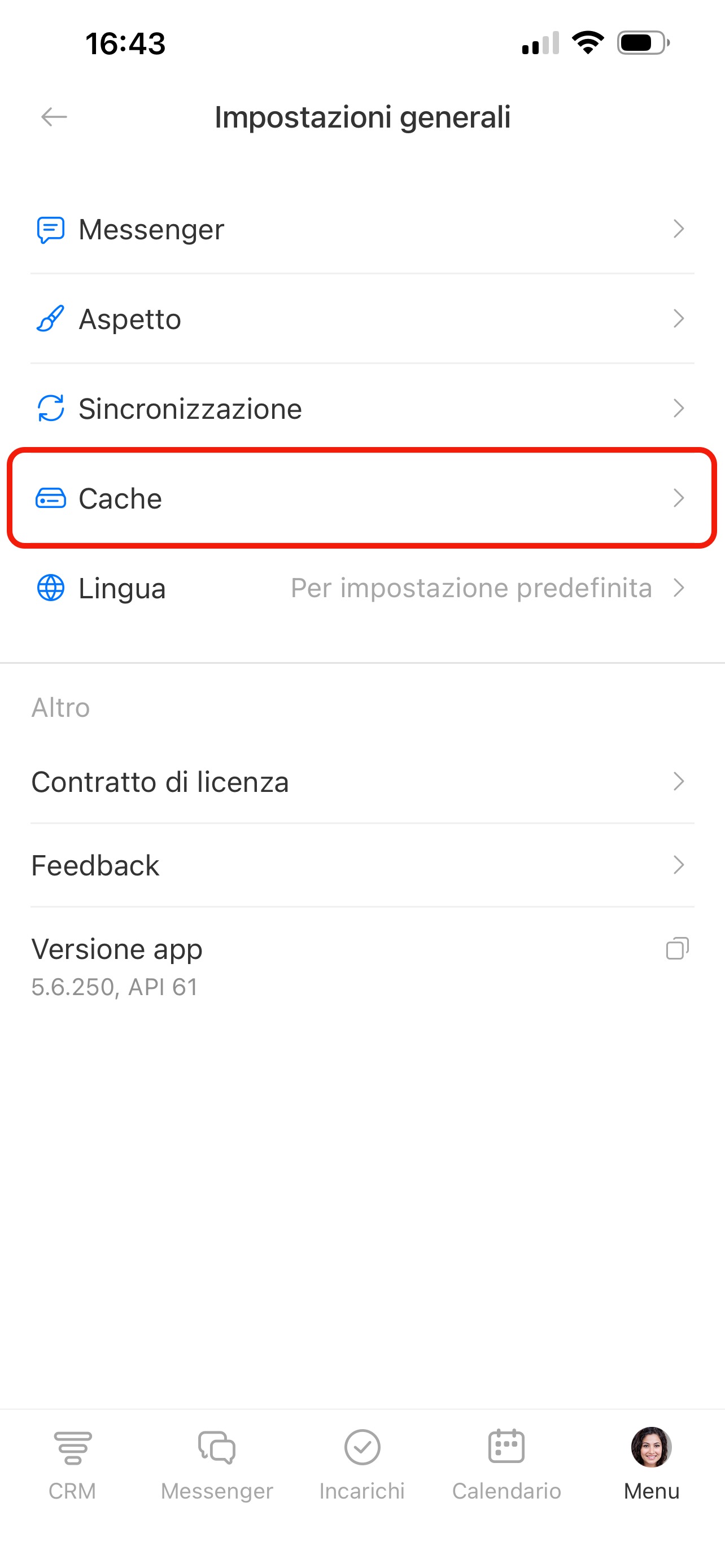 La cache è un insieme di dati salvati sul tuo dispositivo che aiutano ad accelerare il funzionamento dell’App mobile Bitrix24. Ad esempio: foto, video, tabelle e altri file che hai aperto nell’app. Con il tempo la cache si accumula e può occupare molta memoria.
