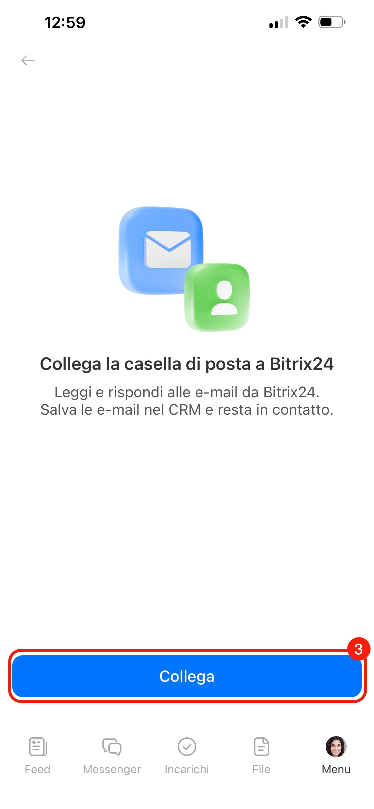 Nell’app mobile Bitrix24 puoi collegare l’e-mail e gestire i messaggi come sul computer. Leggi e invia e-mail, inoltrale ai colleghi, crea incarichi, collegale al CRM e così via. È utile se lavori spesso fuori ufficio e vuoi rispondere rapidamente alle e-mail di clienti, colleghi e partner.